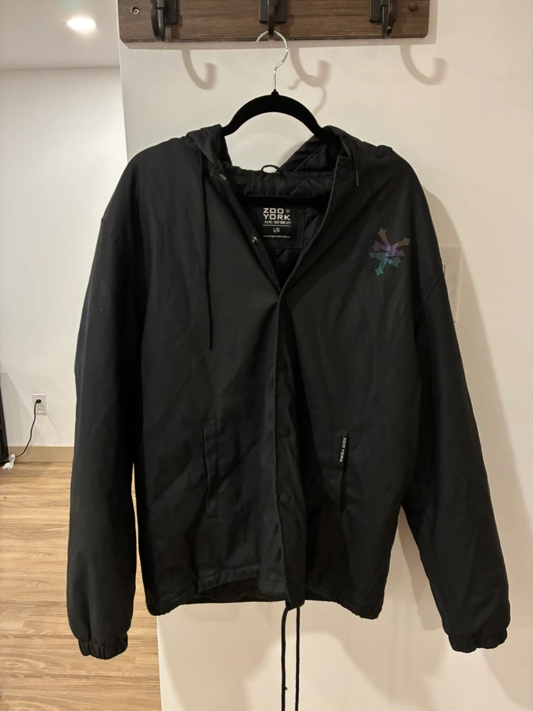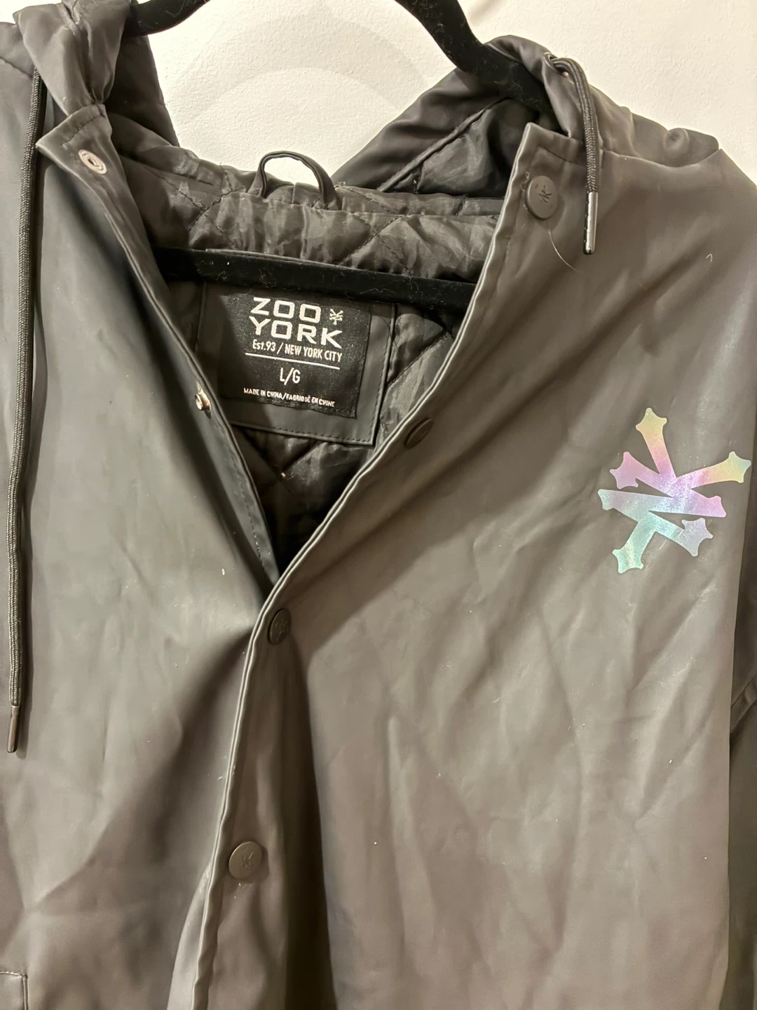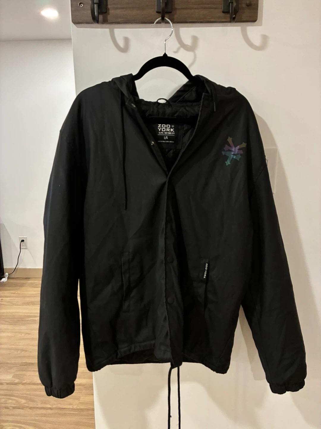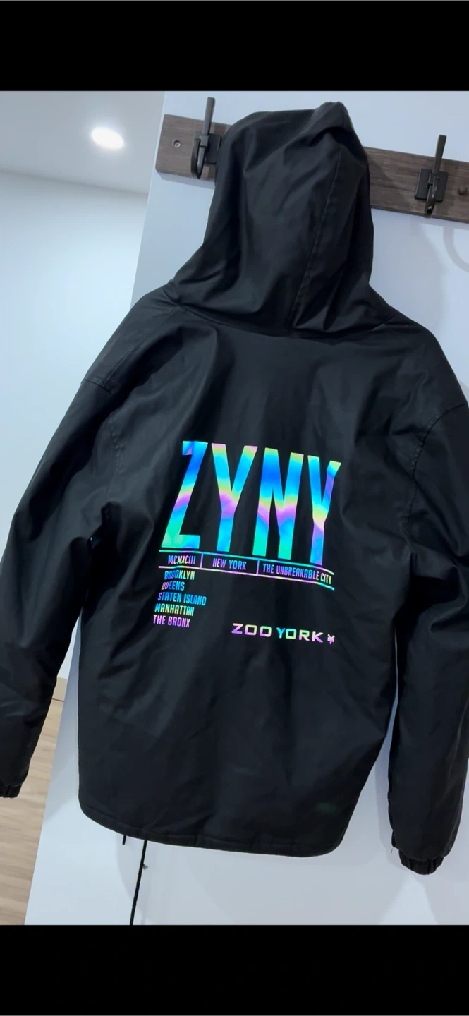 Zoo York black windbreaker jacket. Size L/G. It's made of a water-resistant material and features a snap-button closure. A reflective graphic is on the left chest and a larger graphic with "ZNYY" on the back.