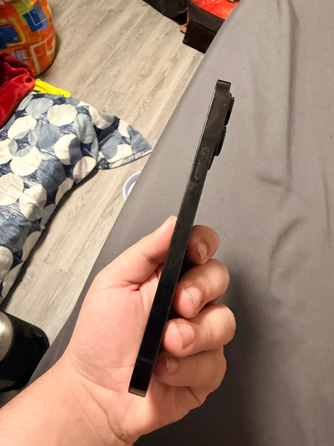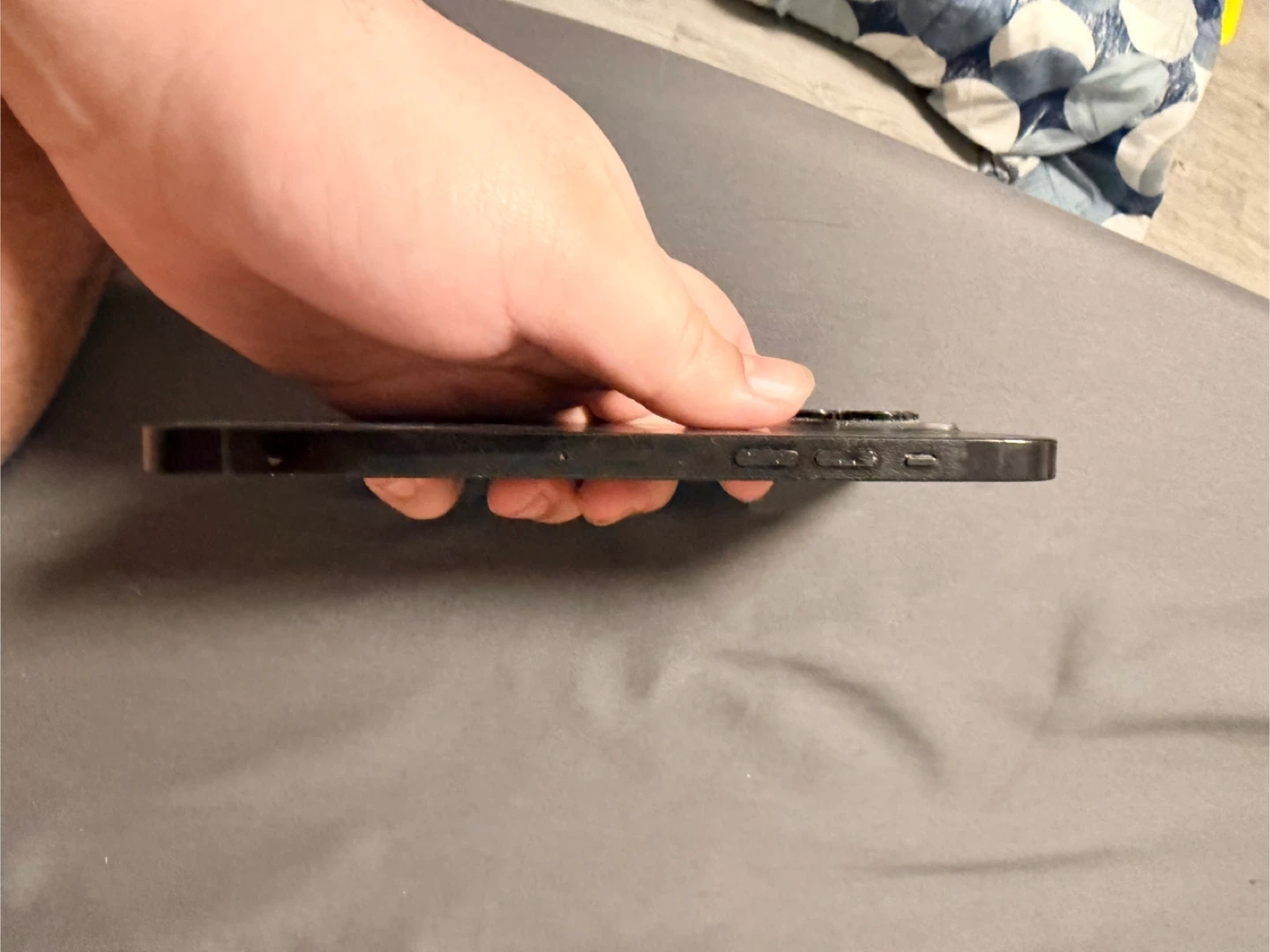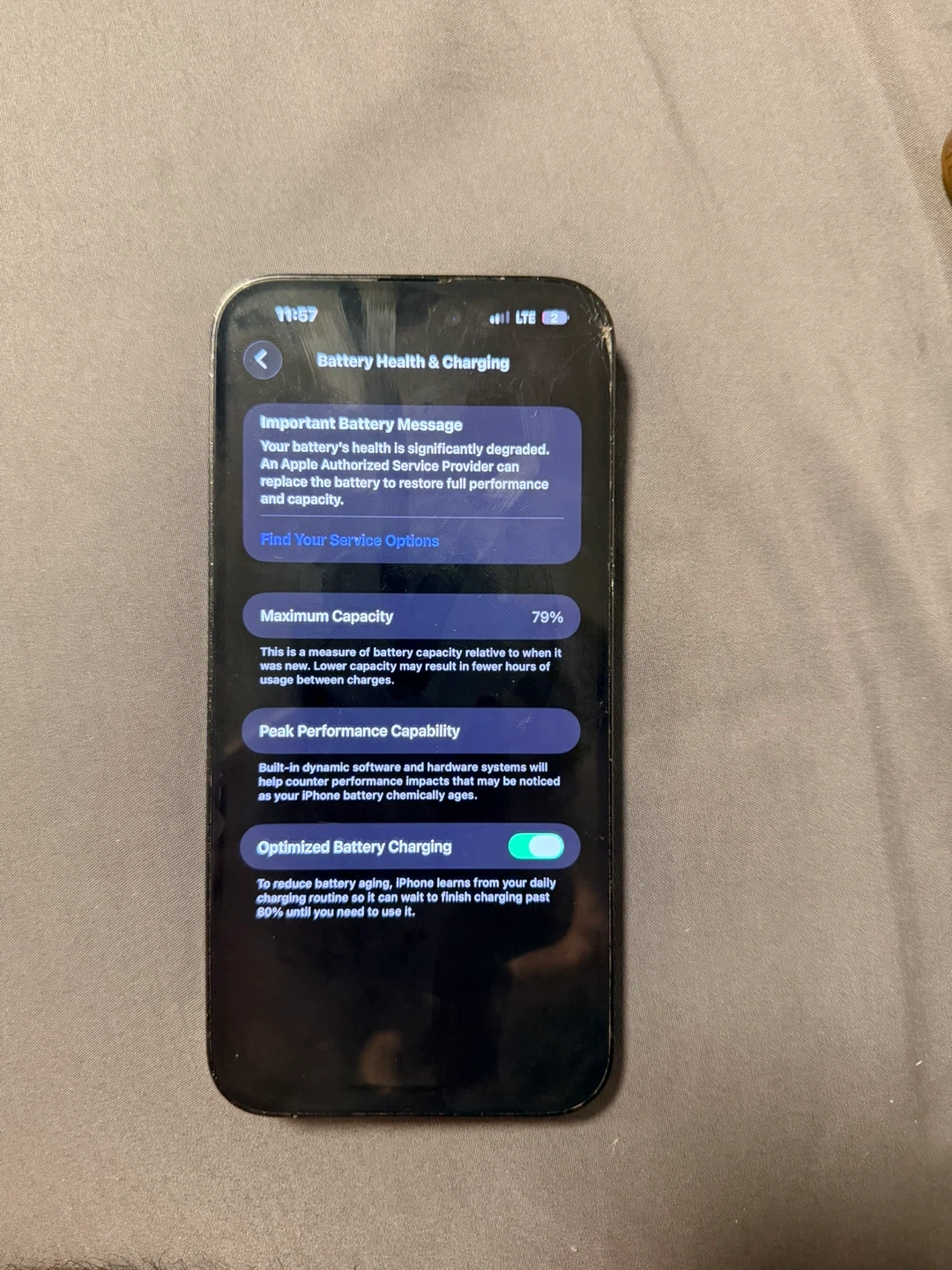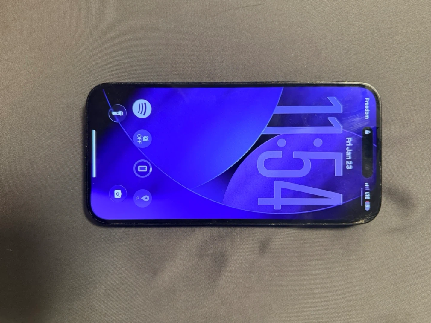This is an Apple iPhone 14 Pro Max in Deep Purple. The back glass is cracked, and there are scratches on the front screen. Phone works grate 79% battery Heath we can talk about the price