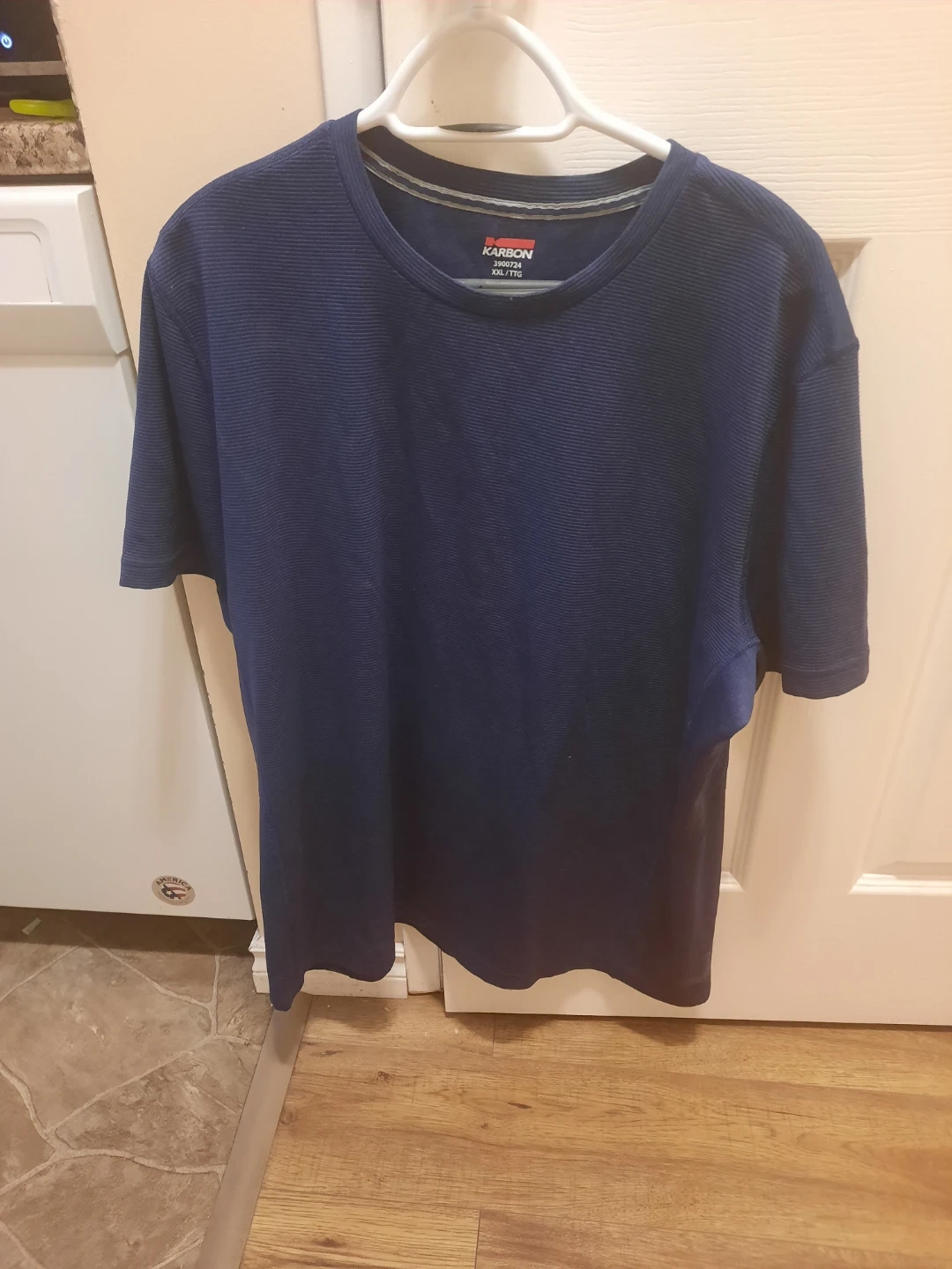 Karbon blue t-shirt. It's a size XXL/TTG. is typically made from a blend of polyester and cotton (e.g., 50% polyester, 50% cotton).