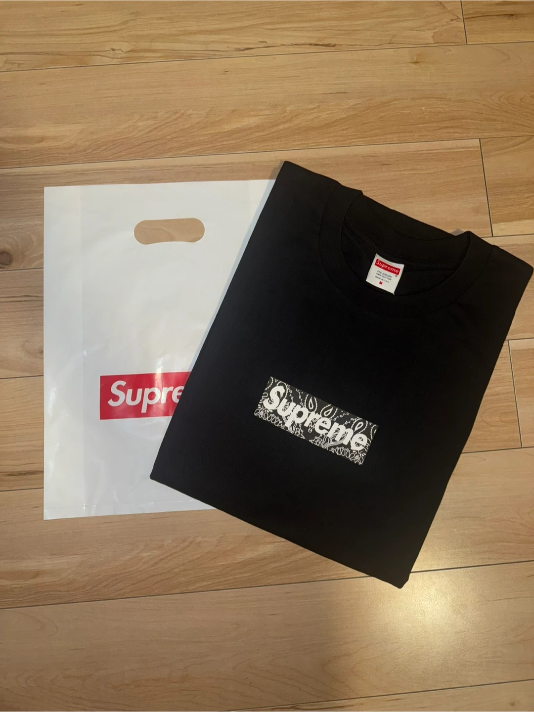 Features the iconic red box logo with white bandana print on the chest.