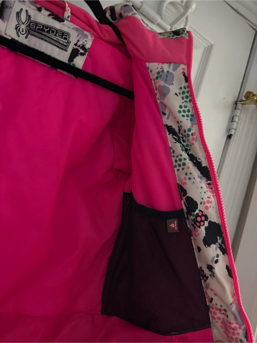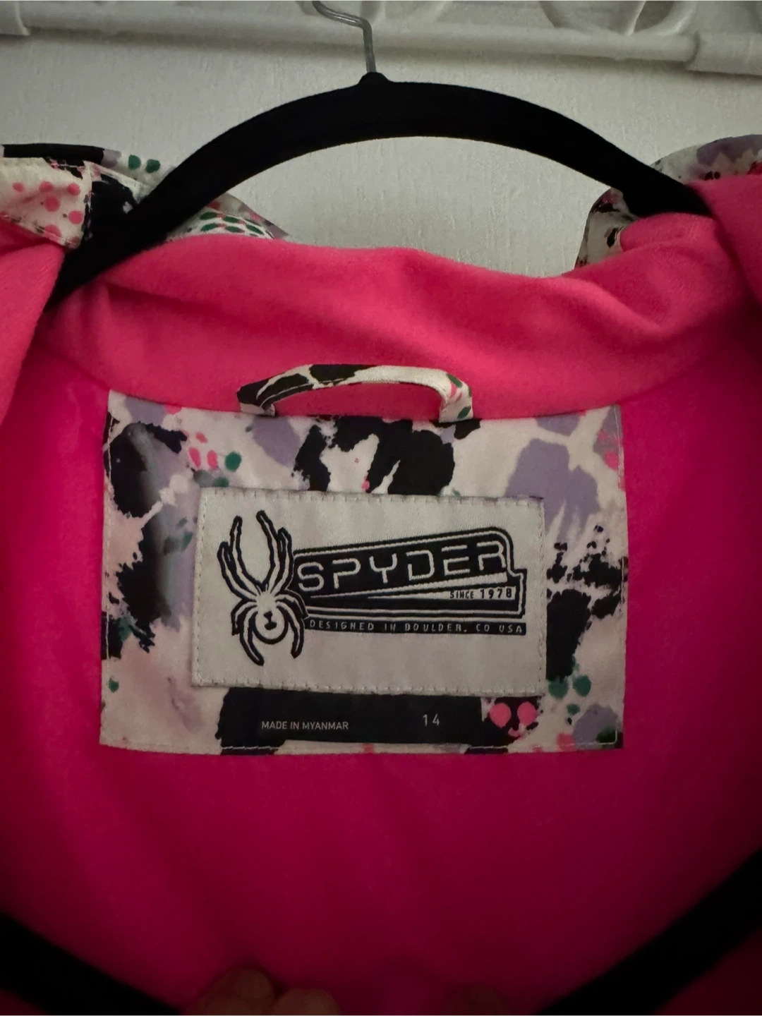 This is a vibrant, multicoloured ski jacket from Spyder. The jacket is sized 14 and made in Myanmar. It's perfect for hitting the slopes