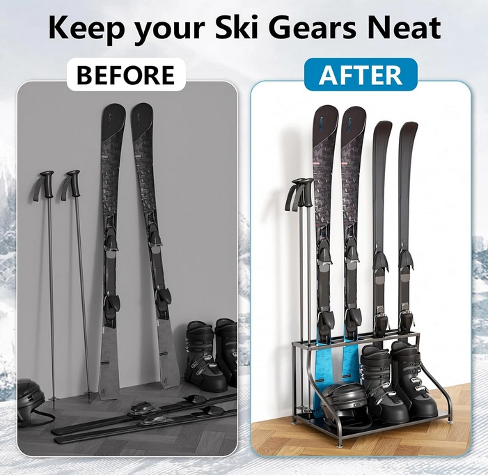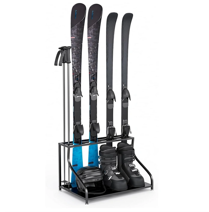 It’s a floor-standing design, so you don’t have to drill into the wall like traditional racks, and it helps prevent skis from tipping over or falling. Great for a garage, basement, or ski room.