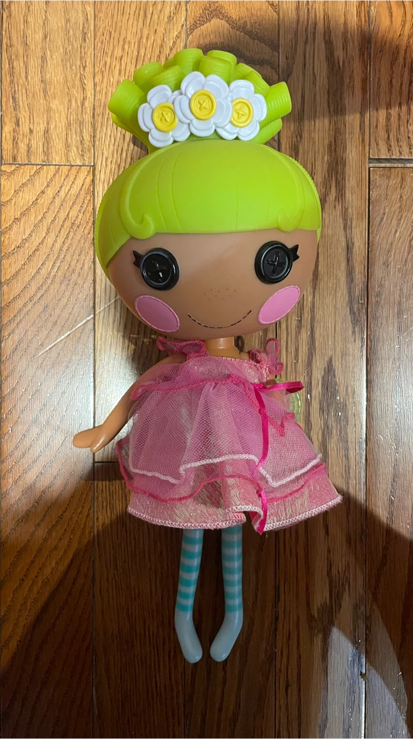 This is a Lalaloopsy doll with bright green hair and a layered pink dress. It features button eyes and striped socks. It comes with a flower accessory for its hair.