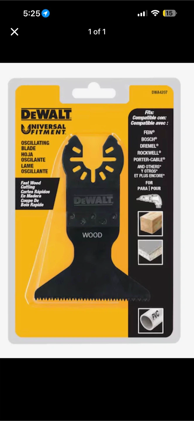 This is a DEWALT oscillating blade designed for fast wood cutting. It's a universal fitment, compatible with Fein, Bosch, Dremel, Rockwell, Porter-Cable, and other brands. The blade is suitable for wood, drywall, and PVC applications.
