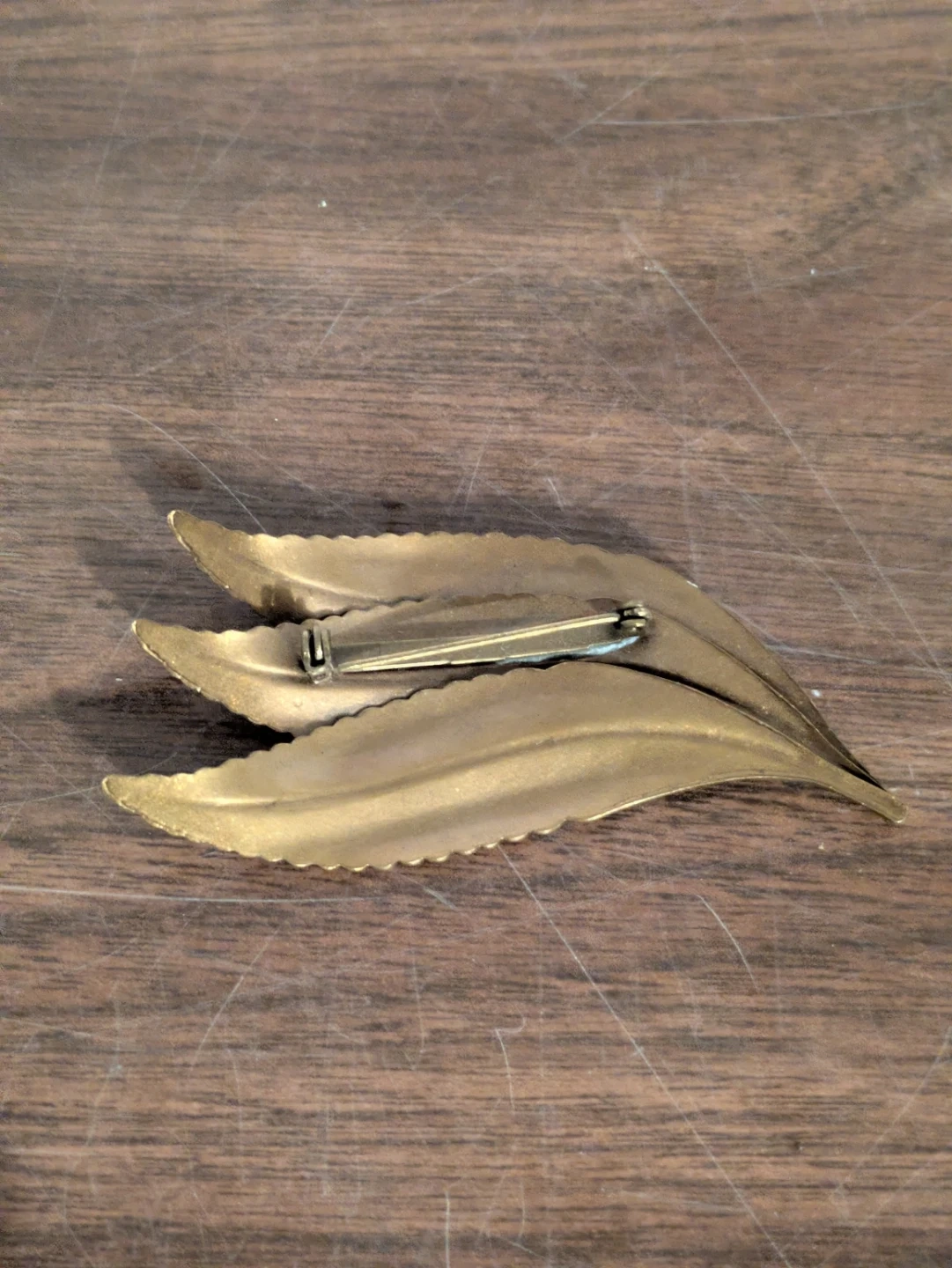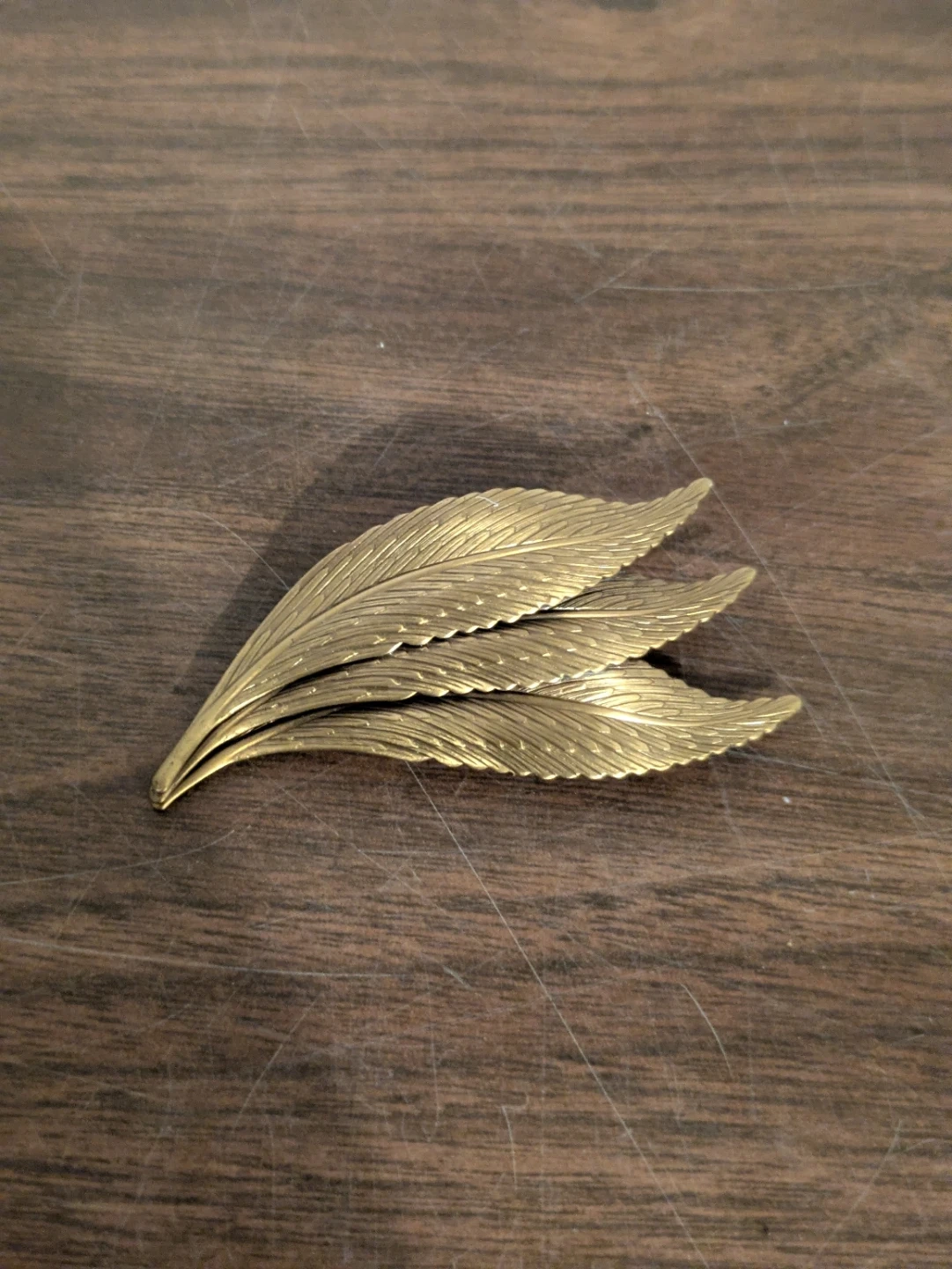 This is a lovely vintage brooch designed as three overlapping leaves. It's made from a gold-tone metal and has a classic pin backing. This piece adds a touch of elegance to any outfit!