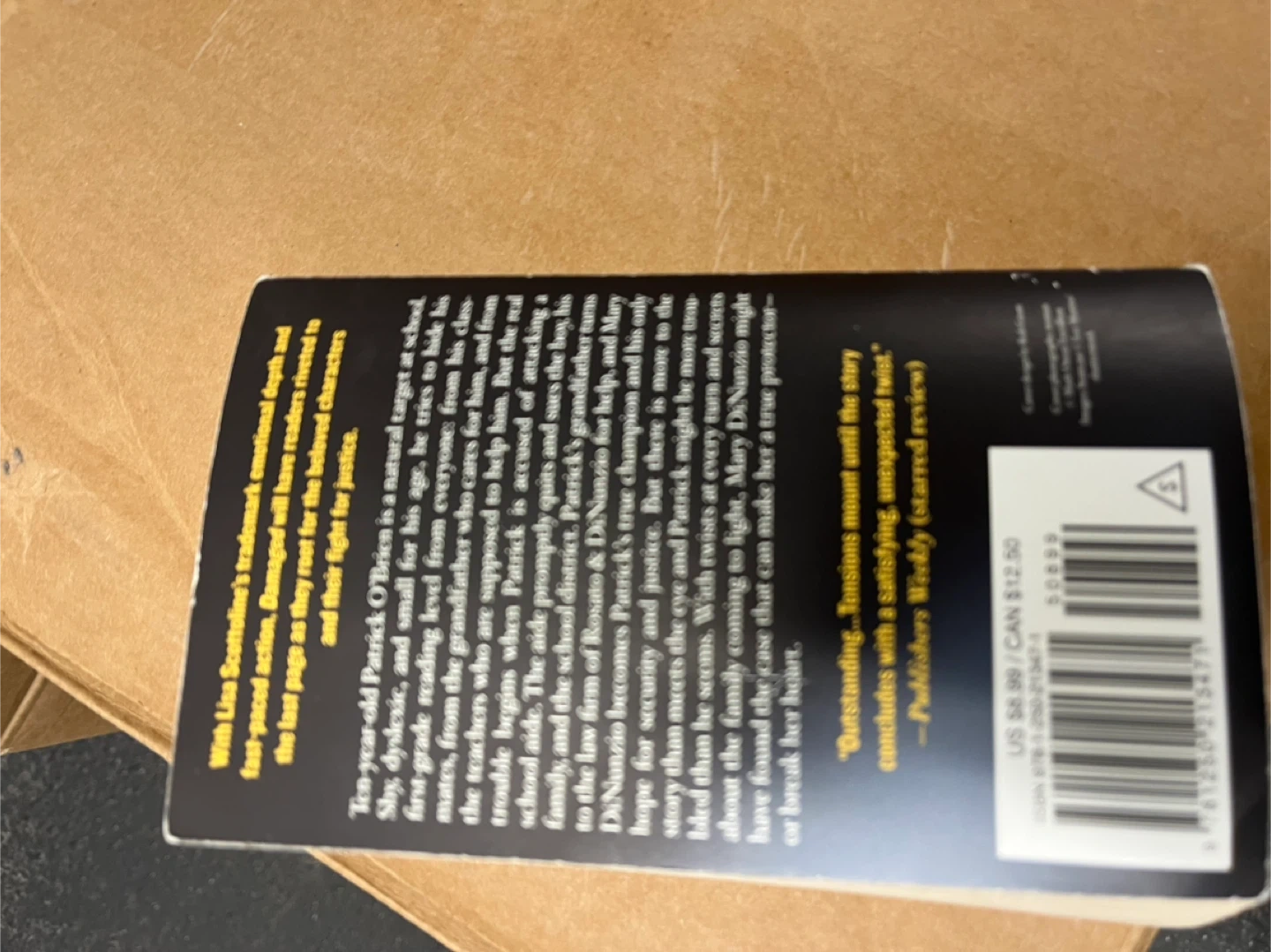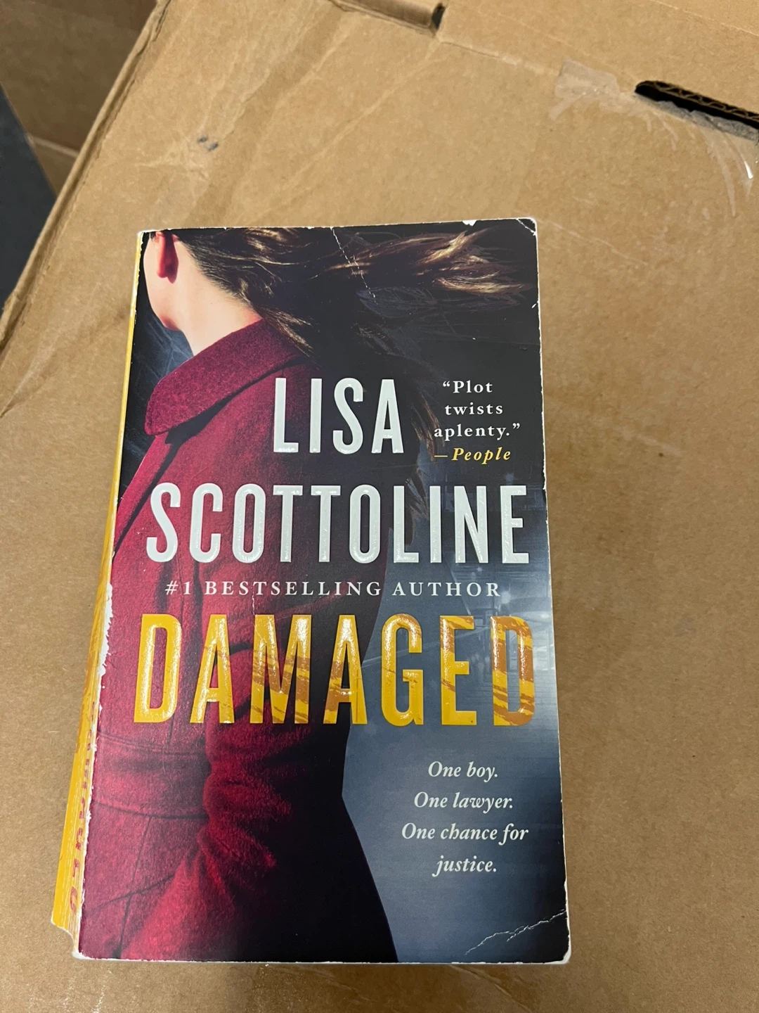 This is a paperback copy of "Damaged" by Lisa Scottoline. It's a thriller novel about a young boy, a lawyer, and justice. The book features a plot with twists and turns.
