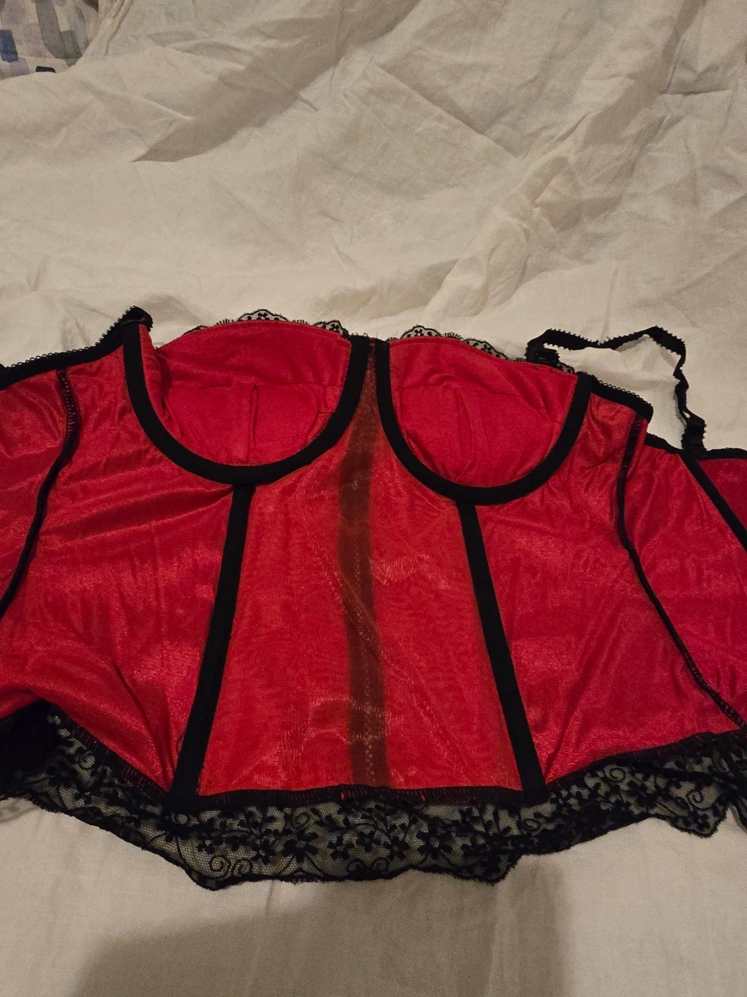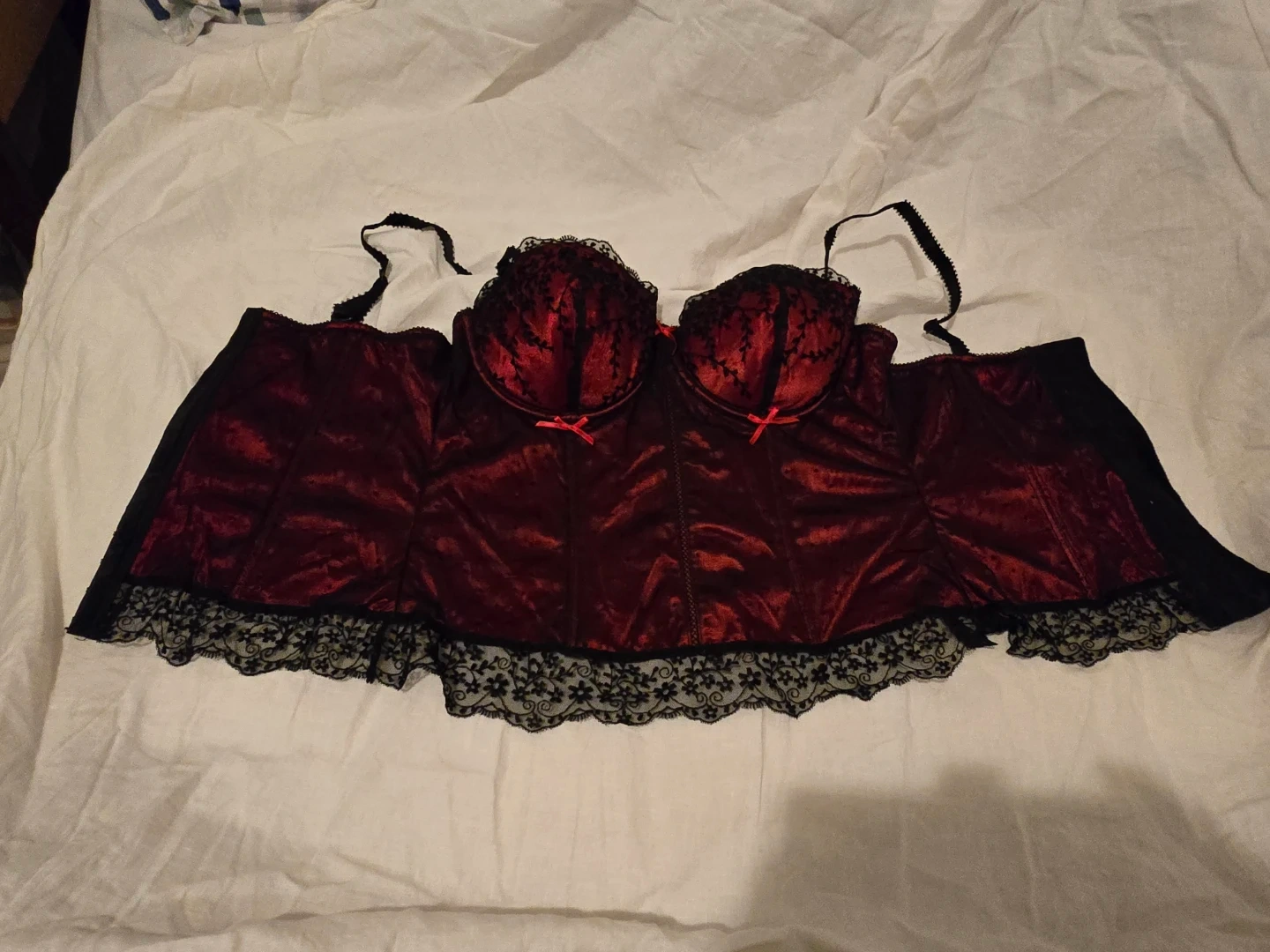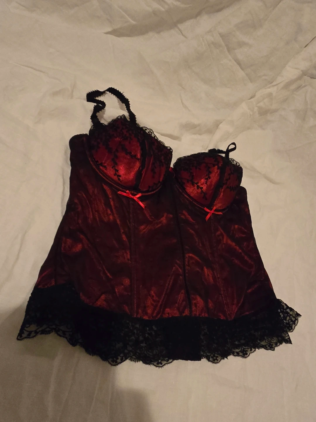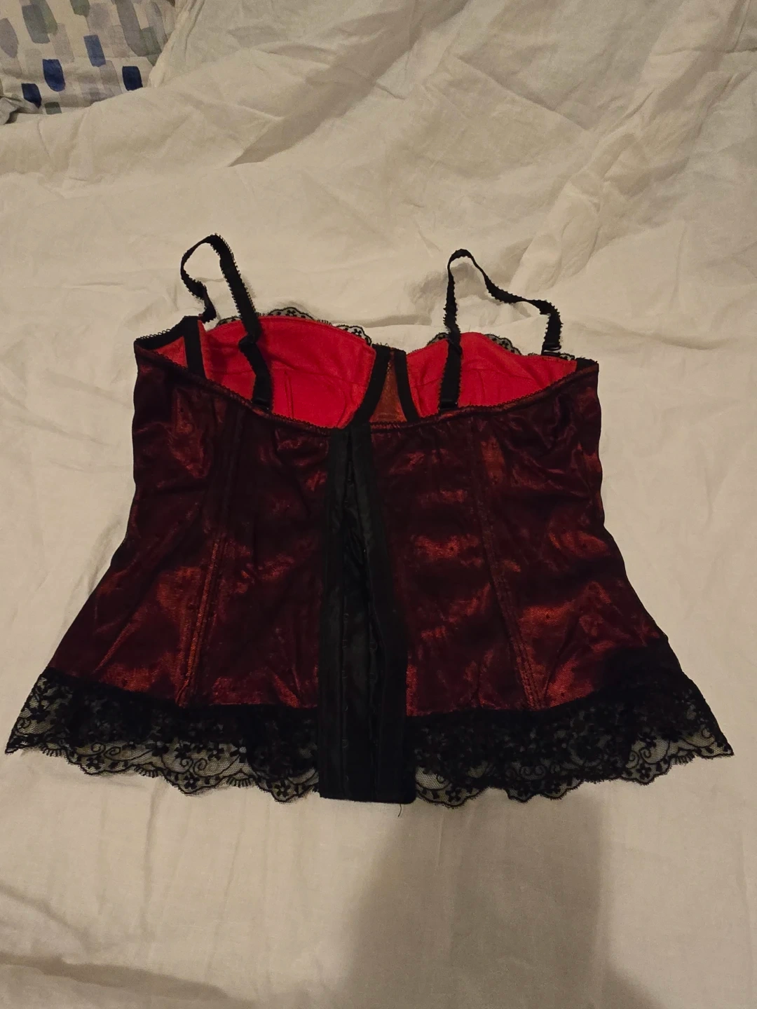 This Affinitas corset features a rich red satin-like fabric with black lace accents. It has adjustable straps and a back closure. Adds a touch of elegance to any outfit! Wasn't worn out just tried on.