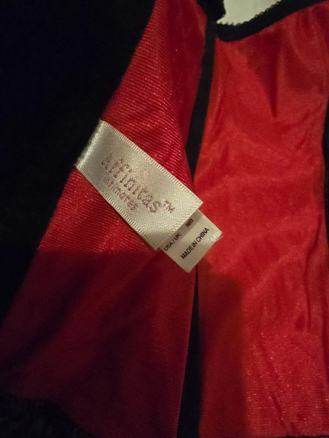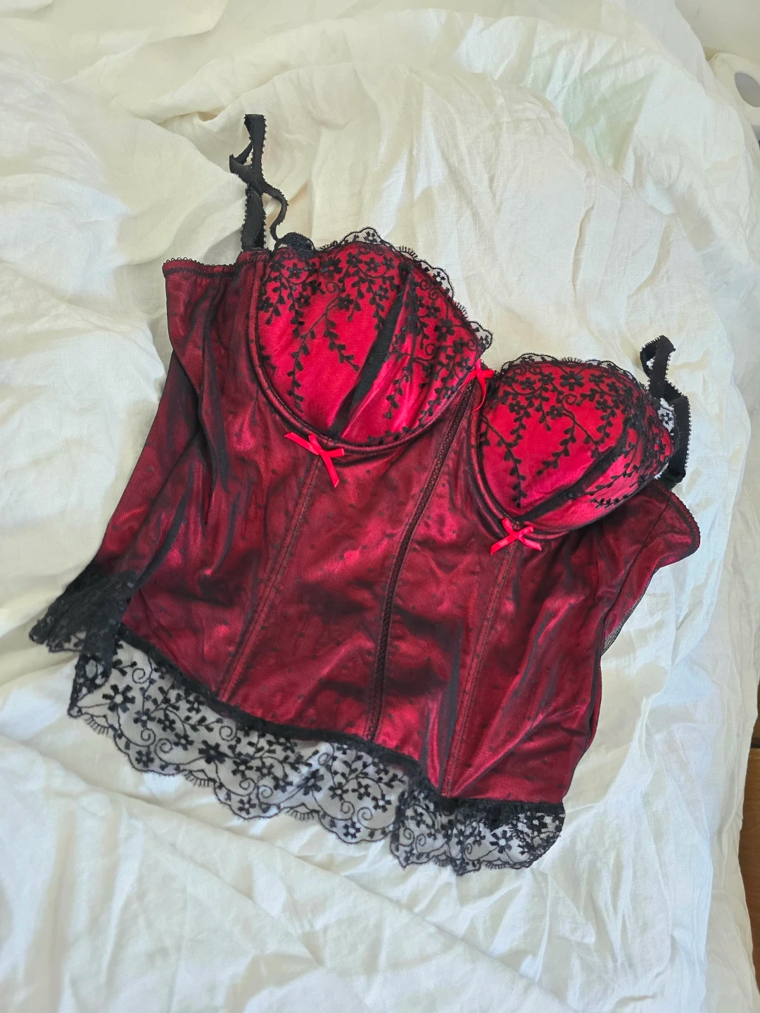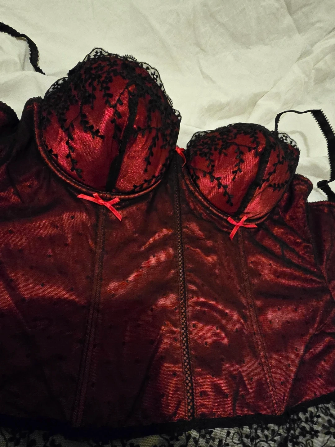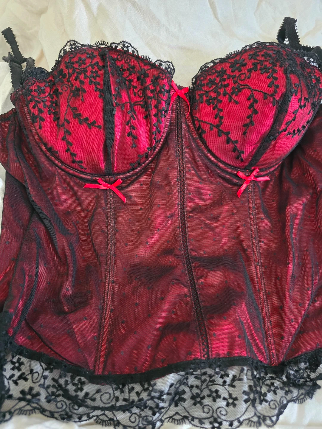 This Affinitas corset features a rich red satin-like fabric with black lace accents. It has adjustable straps and a back closure. Adds a touch of elegance to any outfit! Wasn't worn out just tried on.