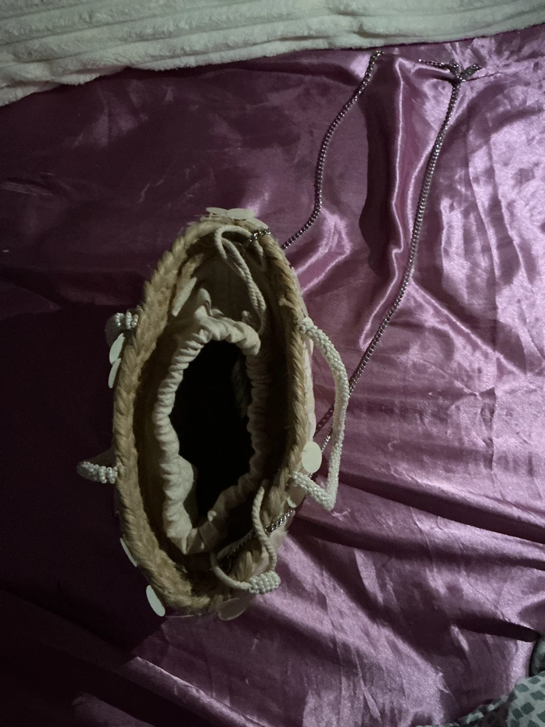 This cute bucket bag features a straw base with a creamy white sequin-covered body. It has beaded top handles and a silver chain strap. Perfect for everyone, thank you bye