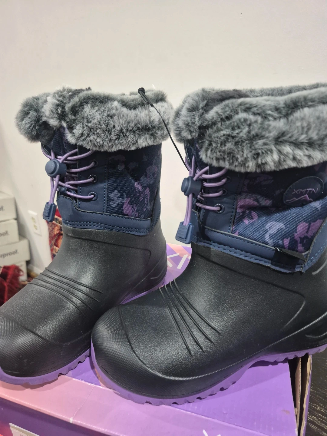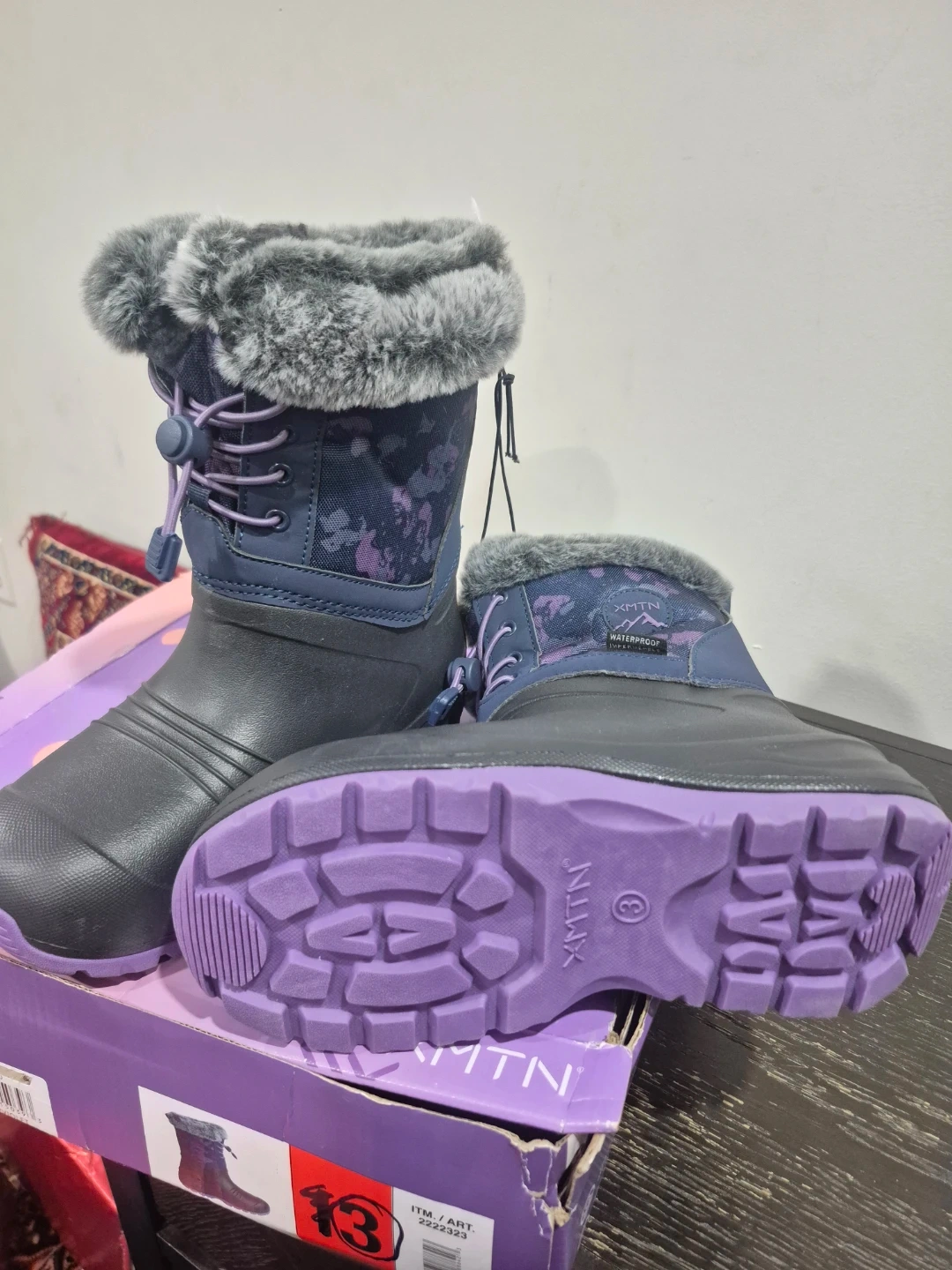 These XMTN winter boots are waterproof and feature a fuzzy lining for warmth. They have a rubber sole and adjustable drawstring closure. Comes with original box the box is a bit damage.brand new