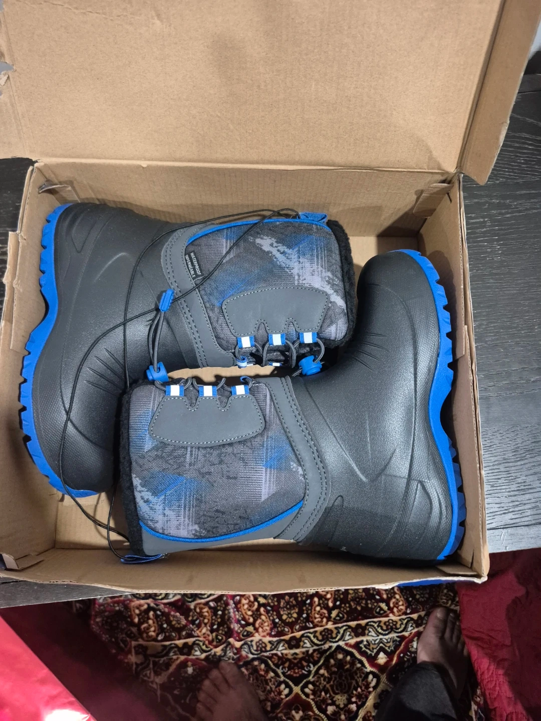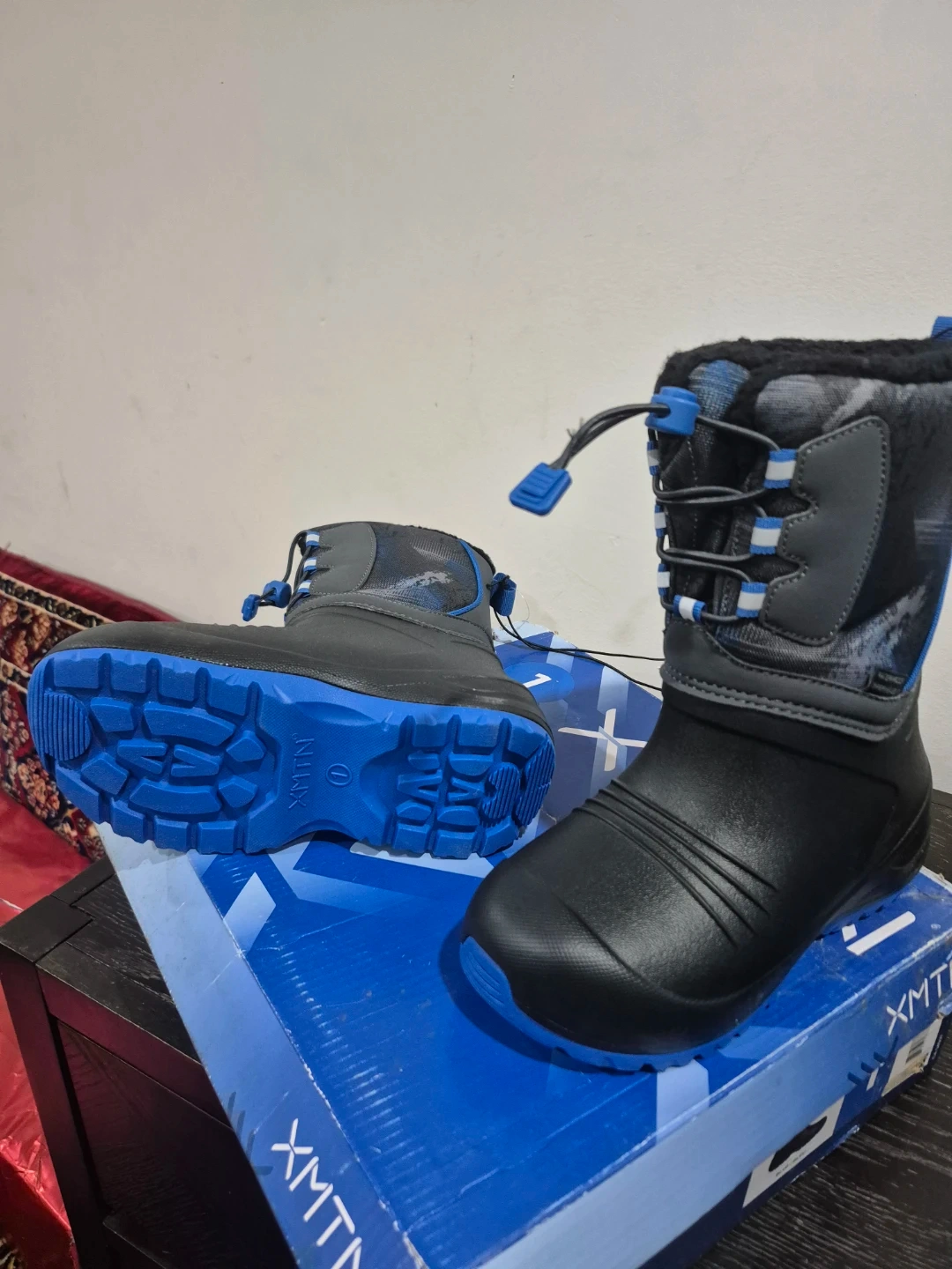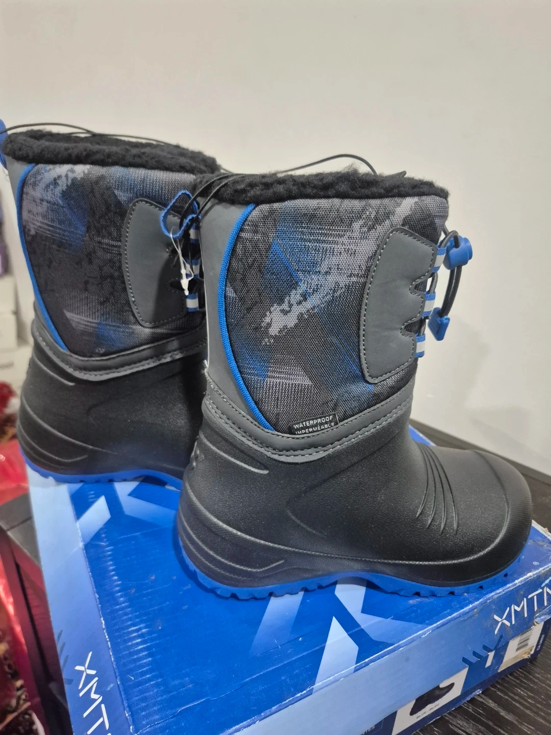 These kids' winter boots are waterproof and insulated for warmth. They feature a grey and blue camo pattern with a drawstring closure. Includes original box. Box a bit damage but brand new Boots.