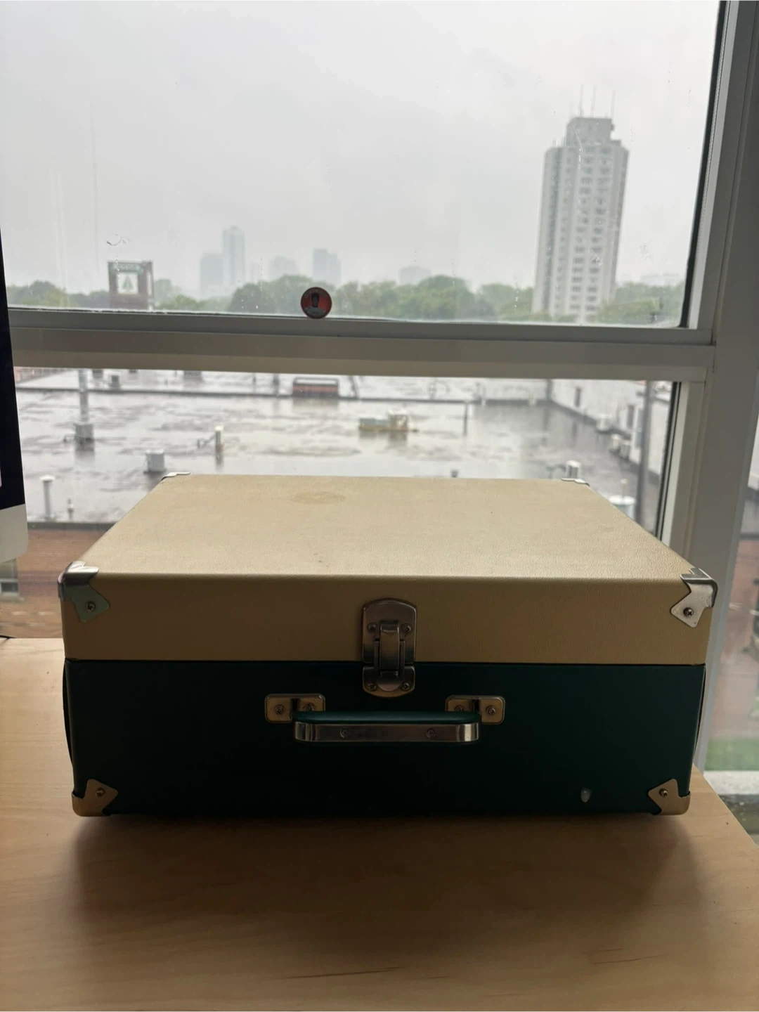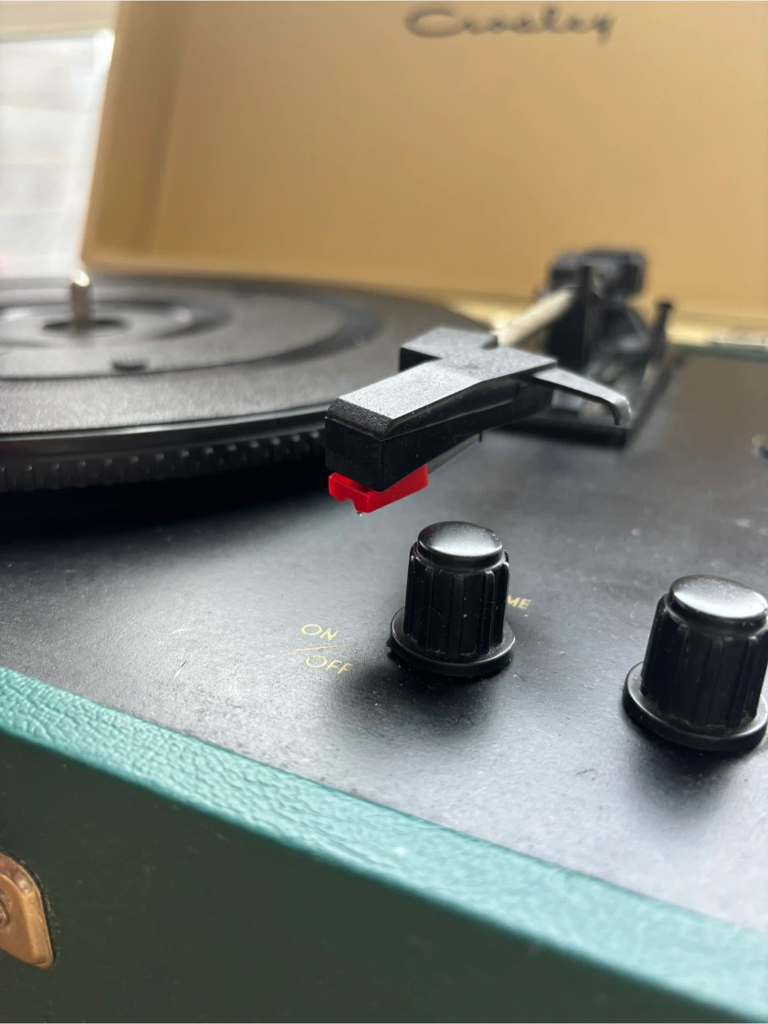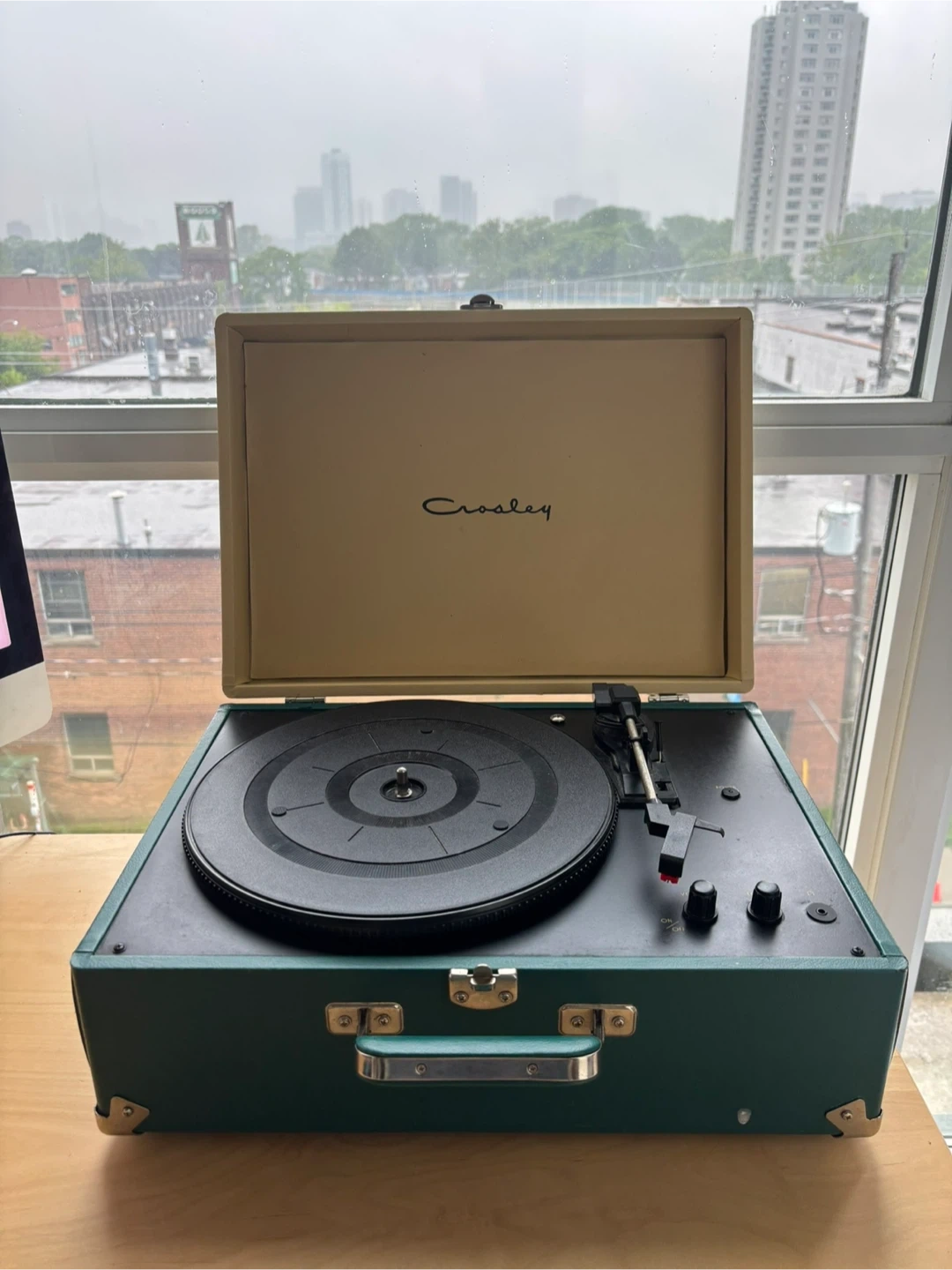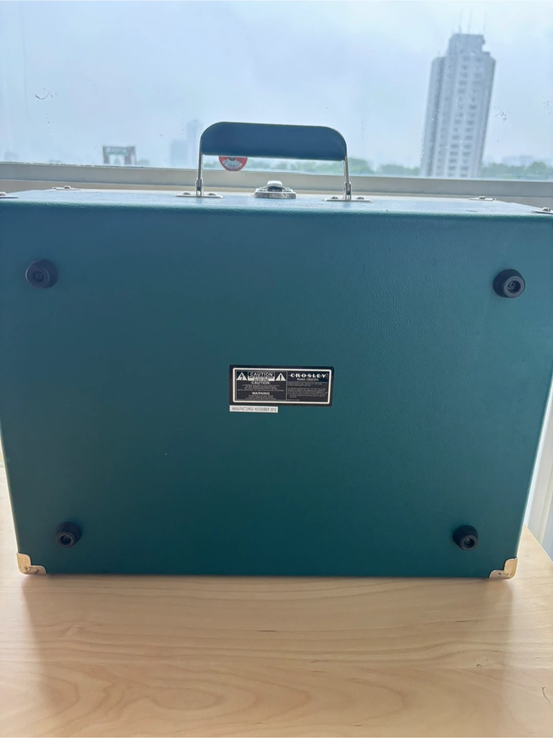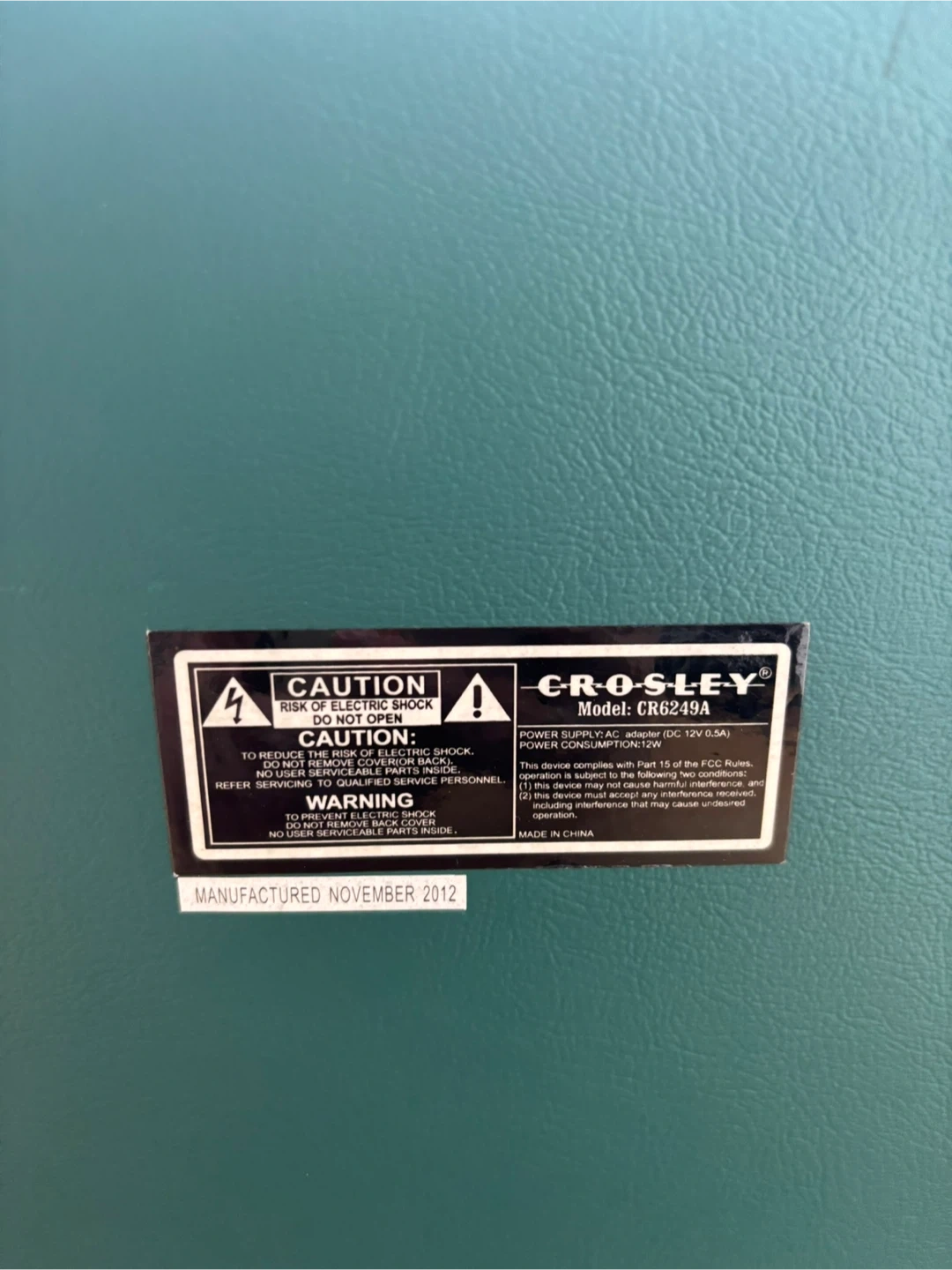 This is a Crosley CR6249A turntable record player in teal and cream. It was manufactured in November 2012. Includes AC/DC power adapter. Adapter wire is a bit damaged but it’s only cosmetic- it’s tapes and still works perfectly well.