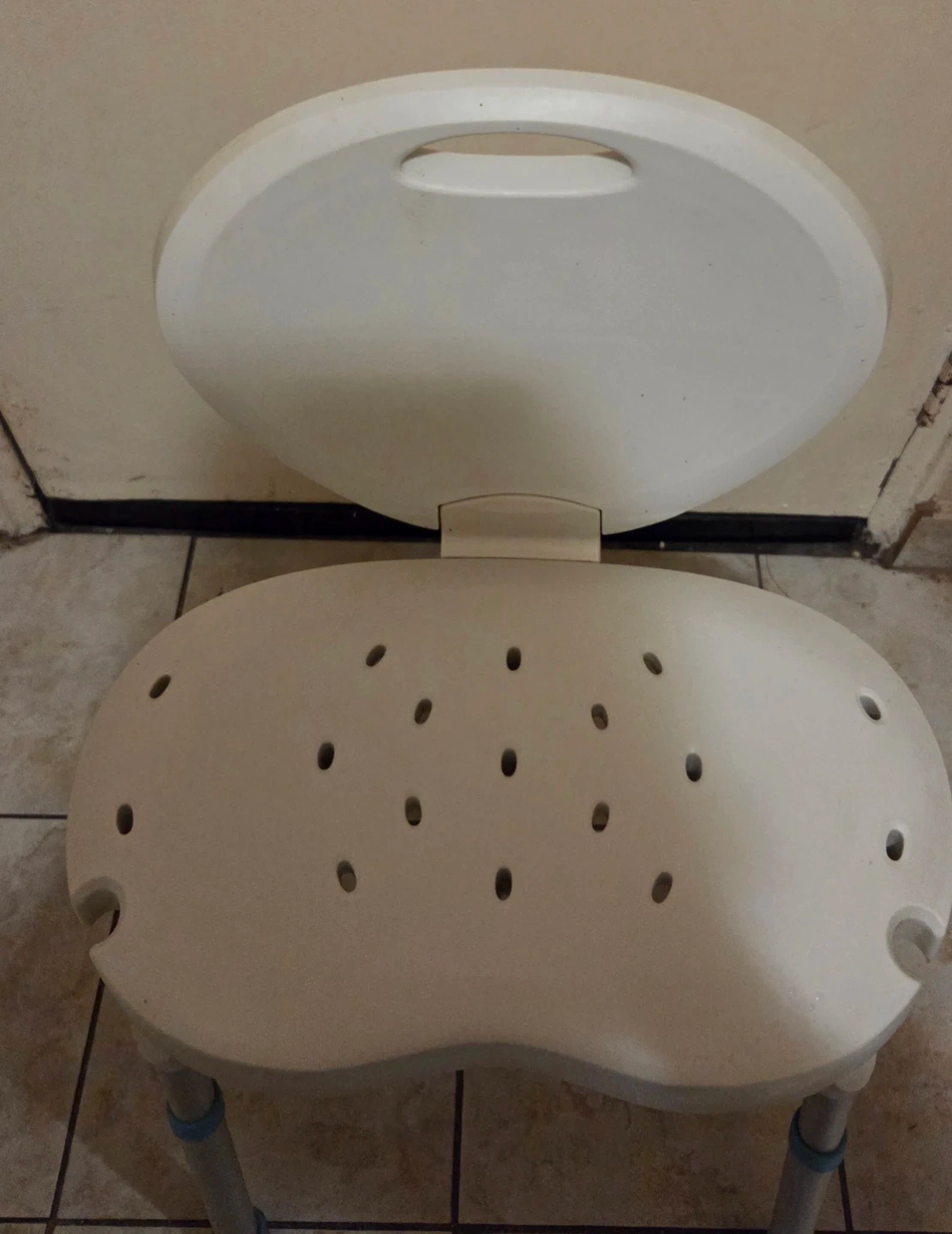 This shower chair provides a stable seat in the shower. It's made of durable plastic and has a backrest for added support. The seat is perforated for drainage and has a curved shape for comfort. Legs are adjustable. Perfect for those who need extra stability in the bathroom!