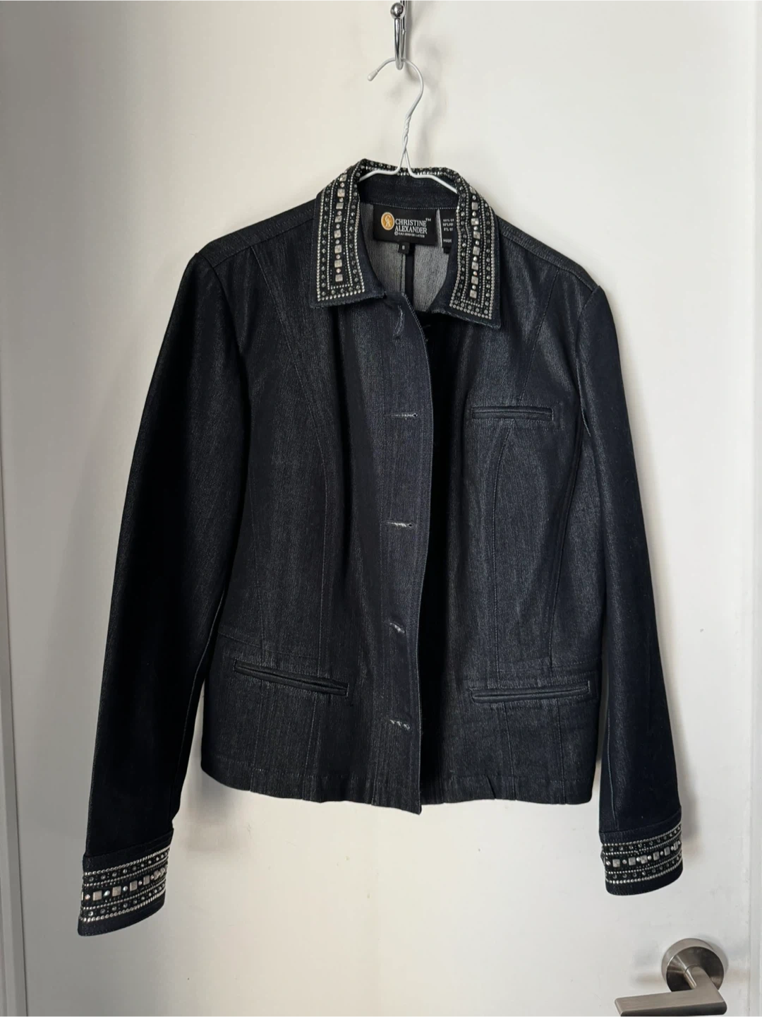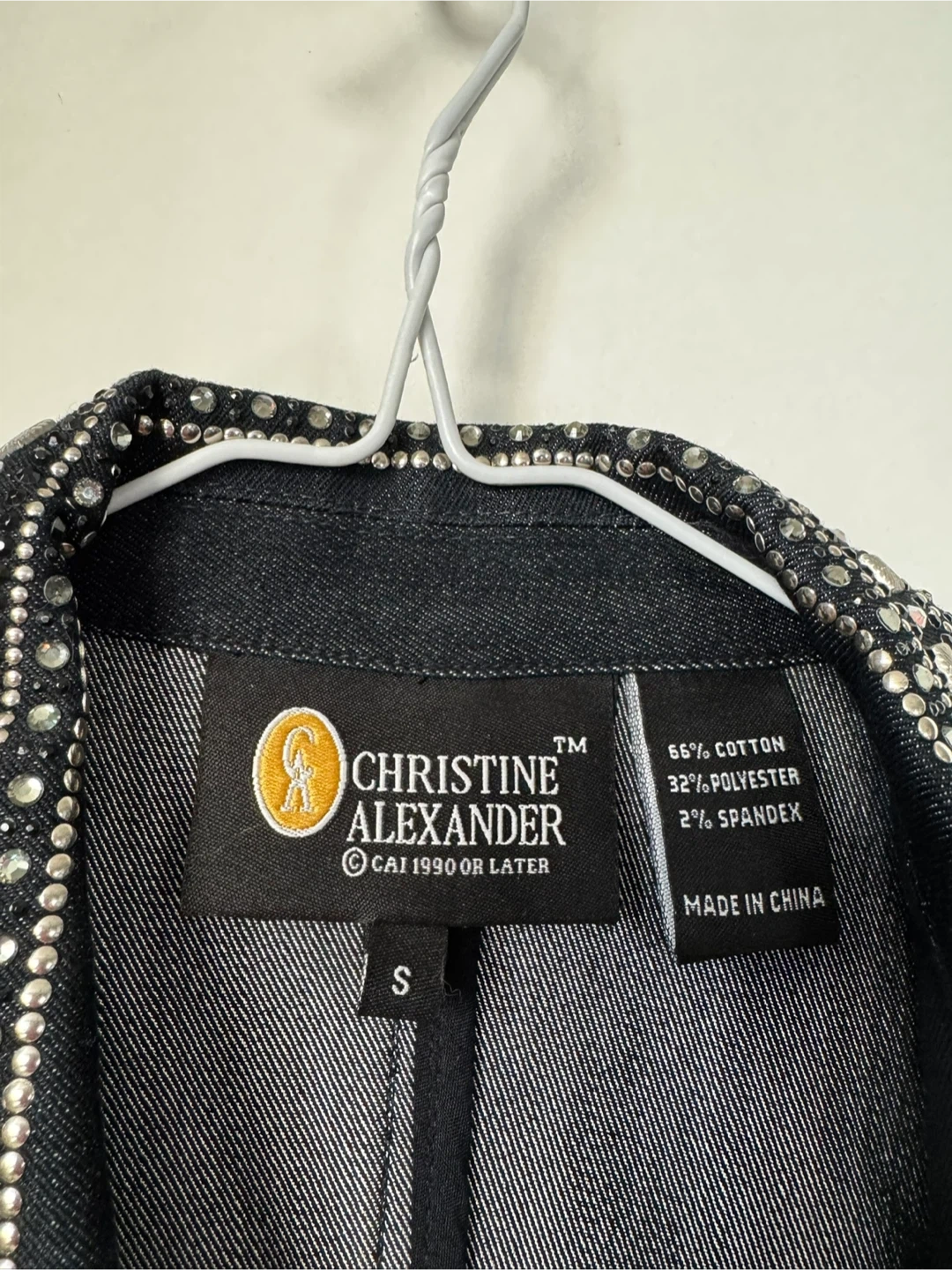 Christine Alexander denim jacket with rhinestone embellishments on the collar and cuffs. Made from 66% cotton, 32% polyester, and 2% spandex. Size S.