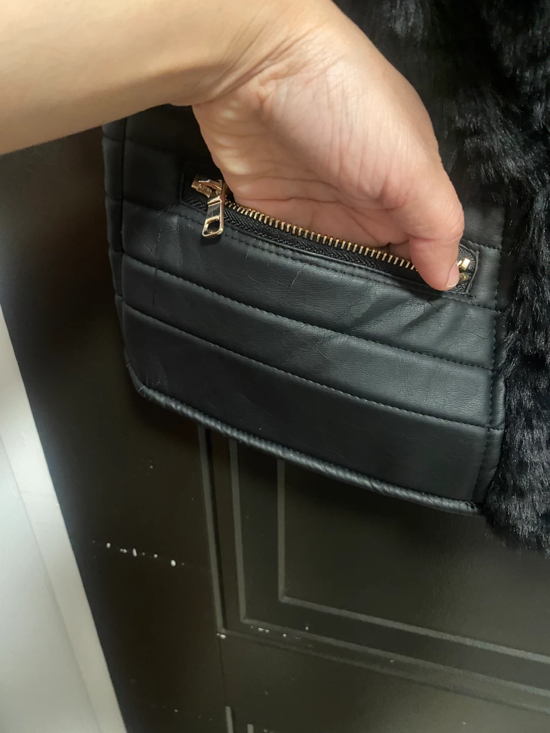 A stylish black vest featuring a faux fur top with a cozy cowl neck and a faux leather bottom. It has a zip-front closure and two zippered pockets. This vest is great for adding a touch of warmth and flair to any outfit!