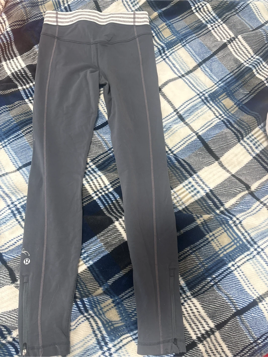 Grey Lululemon athletic pants with a striped waistband. It has a zippered pocket on the right hip and zippered ankles. These pants are great for workouts or running! Pick up cash only
