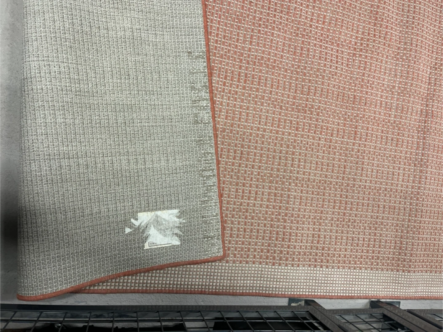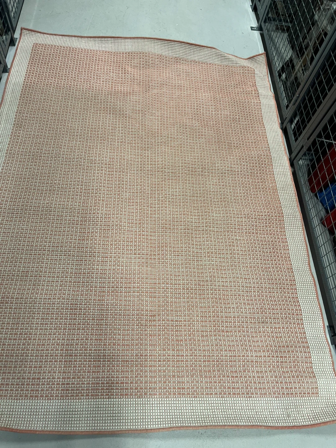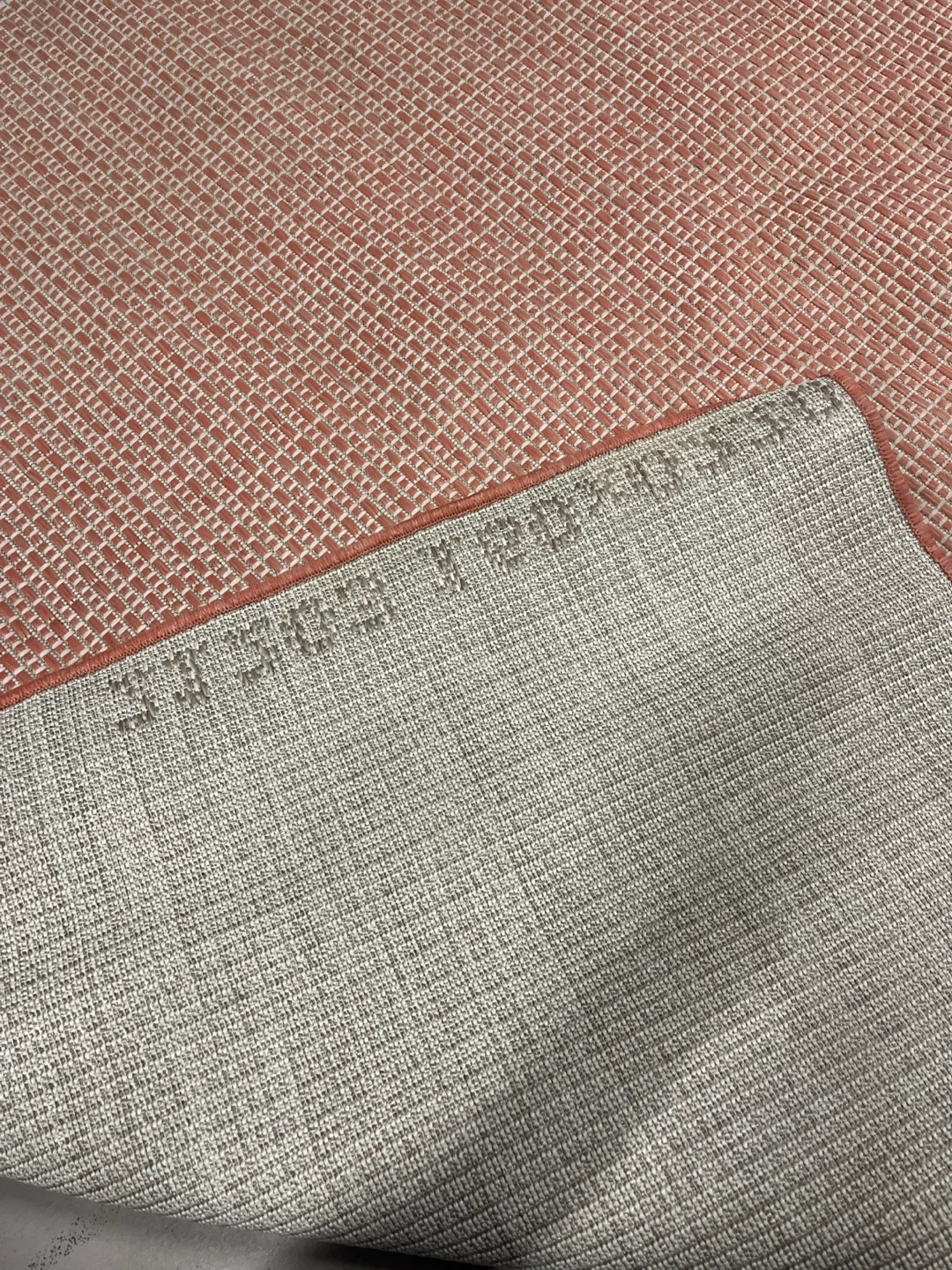 This is a woven area rug. It's a salmon pink and white textured design. It has a durable woven construction.