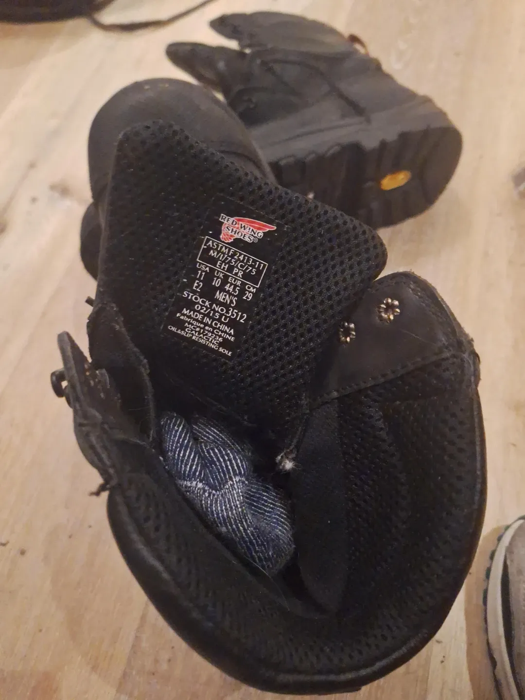 Red Wing Shoes work boots with ASTM F 2413-11 safety rating. Men's size 11 (EUR 44.5, UK 10). Features oil and slip-resisting sole. Made in China.