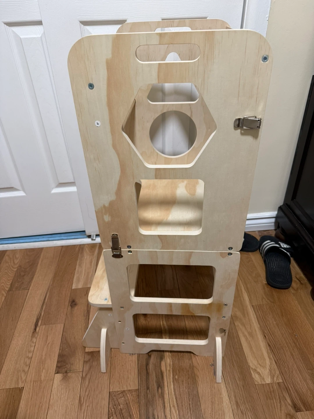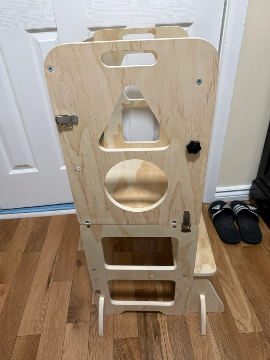 This wooden learning tower provides a safe and adjustable platform for children to reach countertops. It includes a chalkboard on the back for creative play. The solid wood construction ensures durability for years of use. Great for kitchen activities or sensory play!