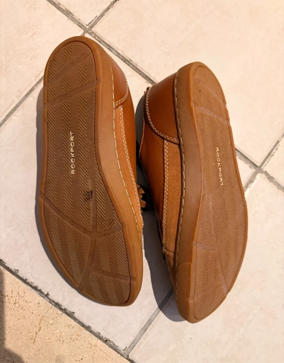These Rockport shoes are crafted from genuine brown leather with a classic lace-up design. They feature a durable rubber sole for good traction. These shoes are great for everyday wear or casual outings.