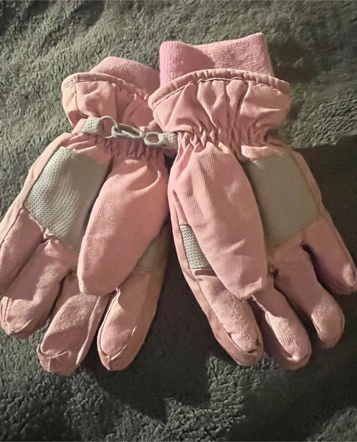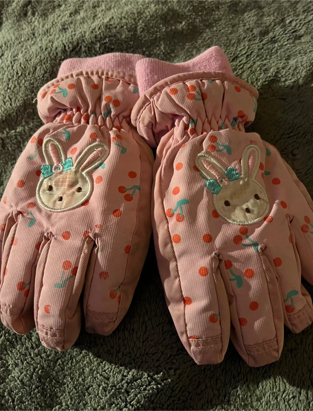 These cute pink winter gloves feature a cheerful bunny and cherry pattern. They have a soft lining and adjustable wrist straps for a snug fit. Perfect for keeping little hands warm during colder weather!