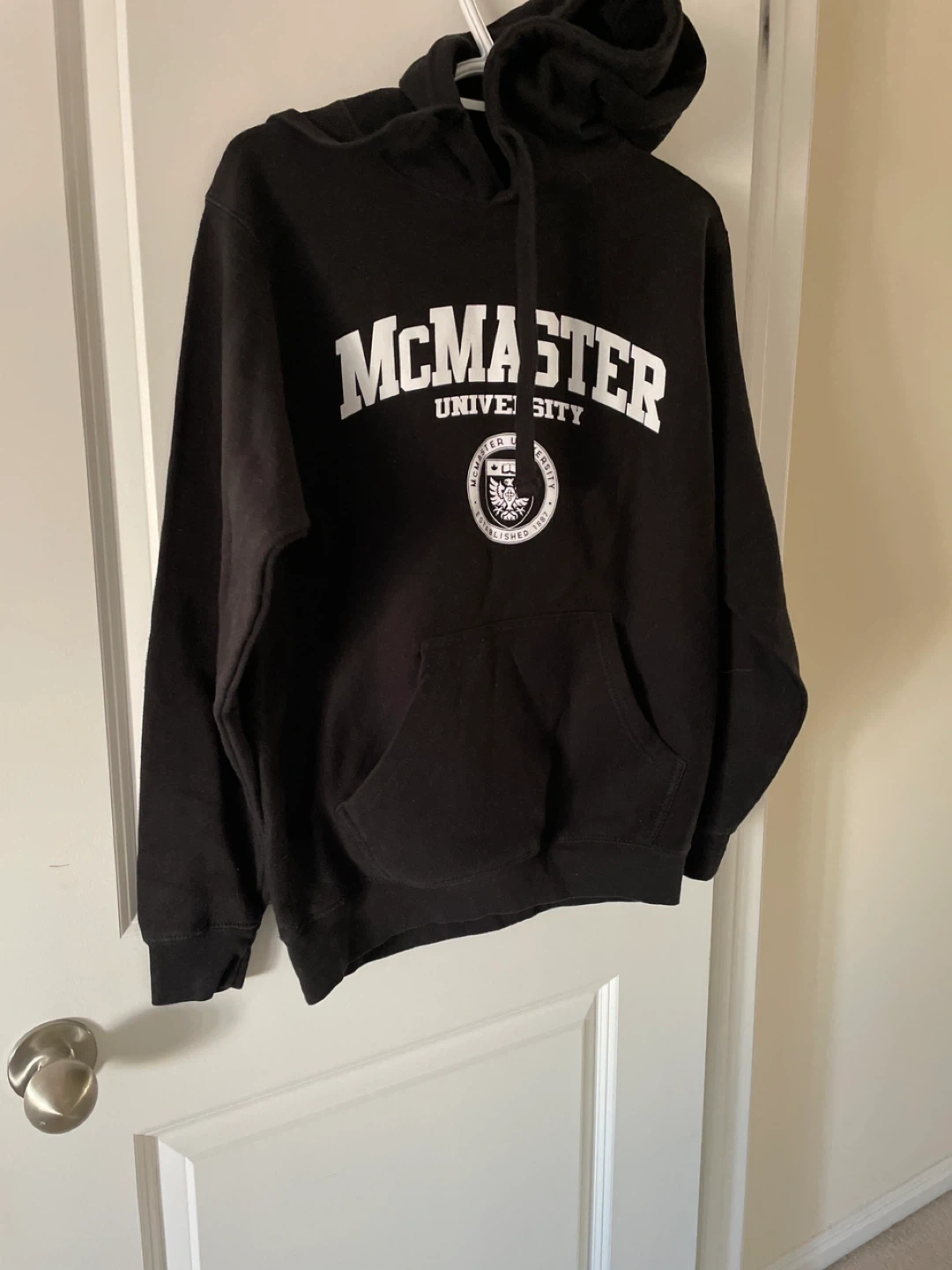 This black hoodie features the McMaster University logo. It's made from a 70% cotton and 30% polyester blend. Designed in Canada, it's size medium.