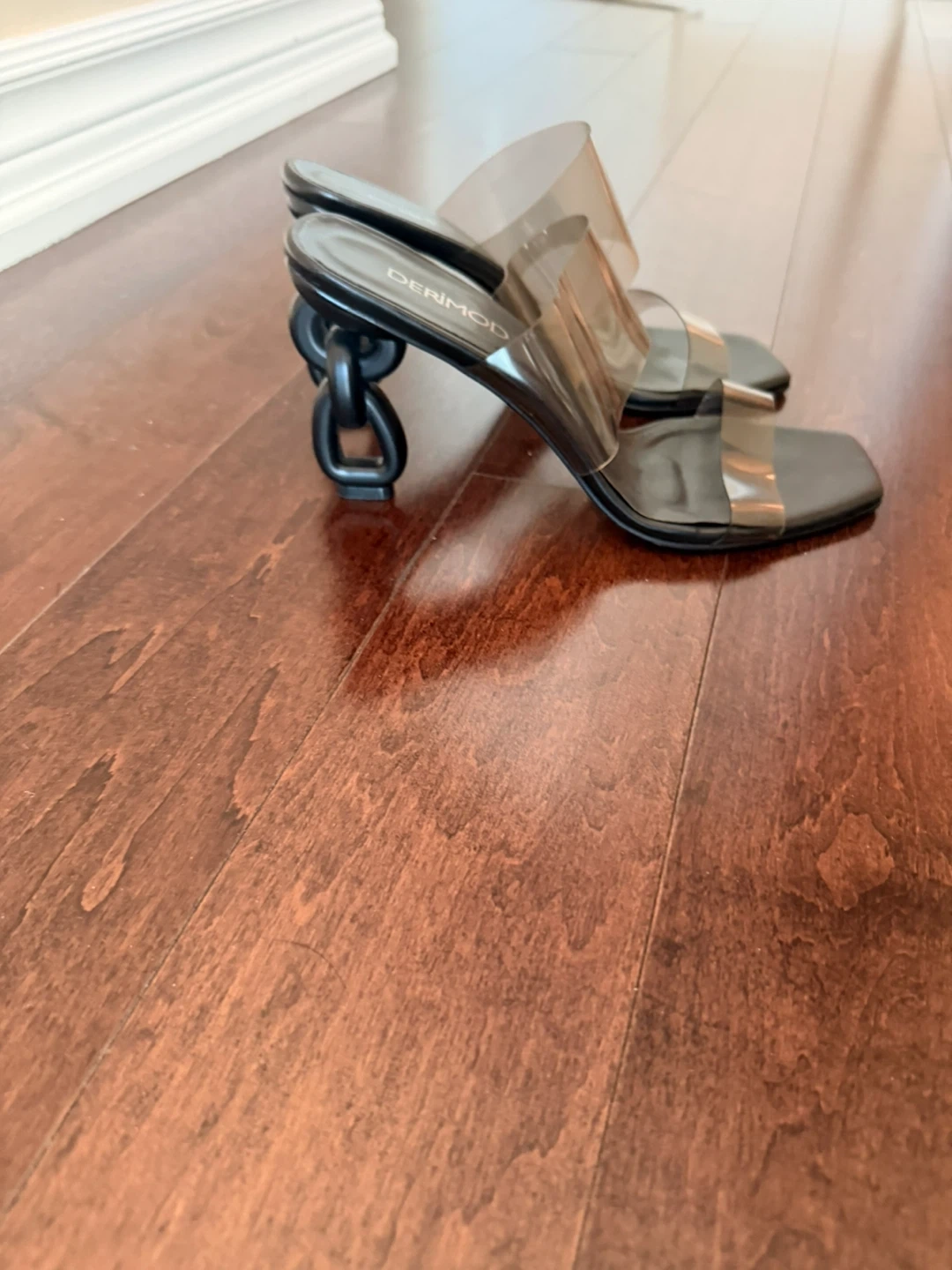 These stylish Derimod heels feature a black base with clear PVC straps. The unique sculpted heel adds a modern touch.Size is 39.