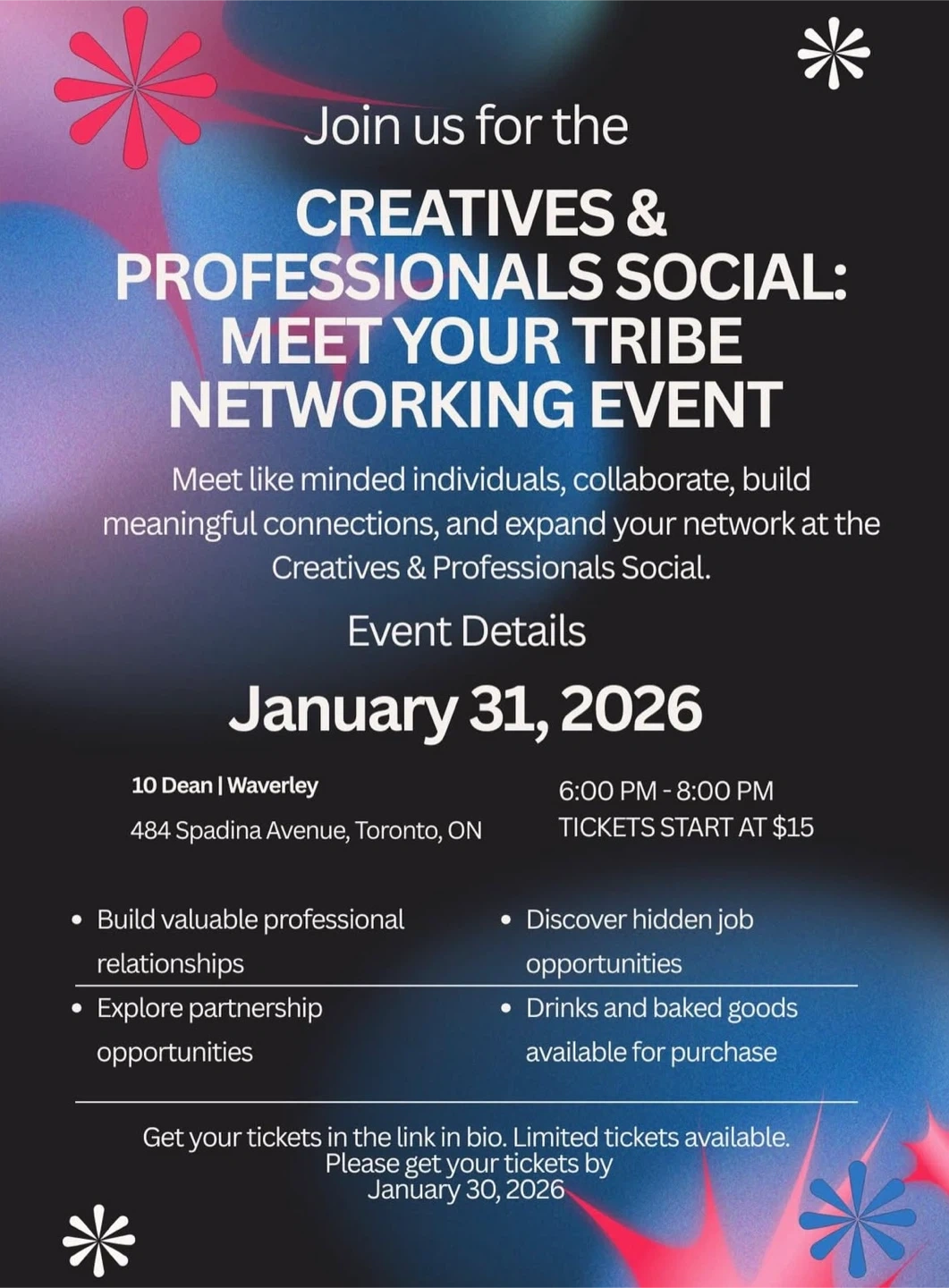 January 31, 2026, from 6:00 PM to 8:00 PM at 10 Dean | Waverley, 484 Spadina Avenue, Toronto, ON.