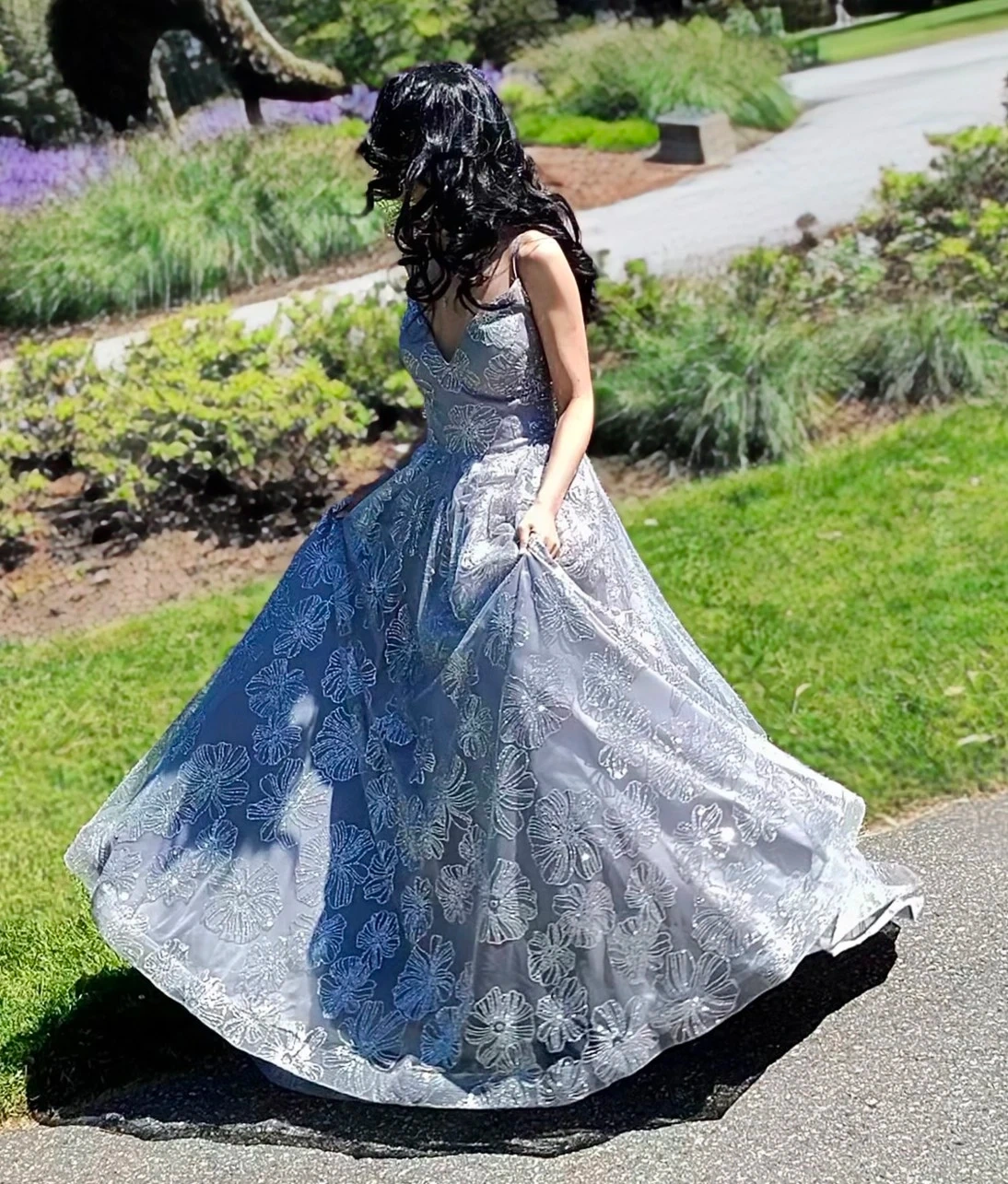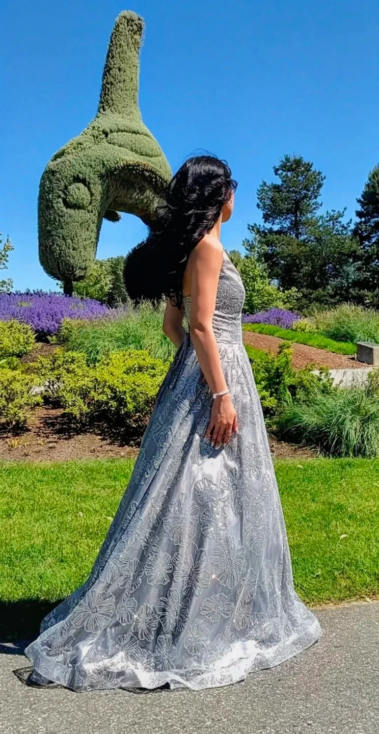 Beautiful grey floor-length gown with intricate silver floral embroidery. It features a flattering V-neckline and a full A-line skirt. Perfect for formal events and galas! Was only used once. Like new.
