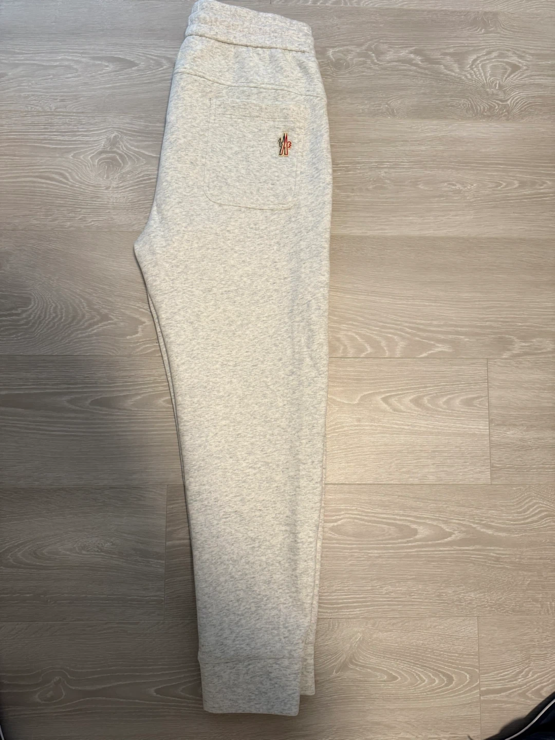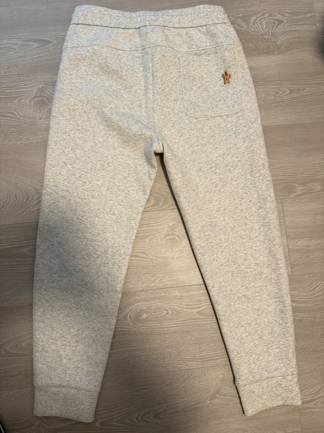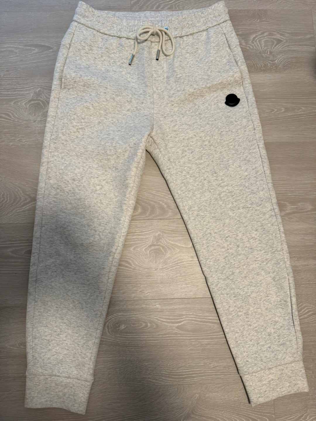 Moncler sweatpants in a light grey marled fabric. Elastic waistband with drawstring. Features two front pockets and one back pocket with a logo detail. Logo patch on the left leg.