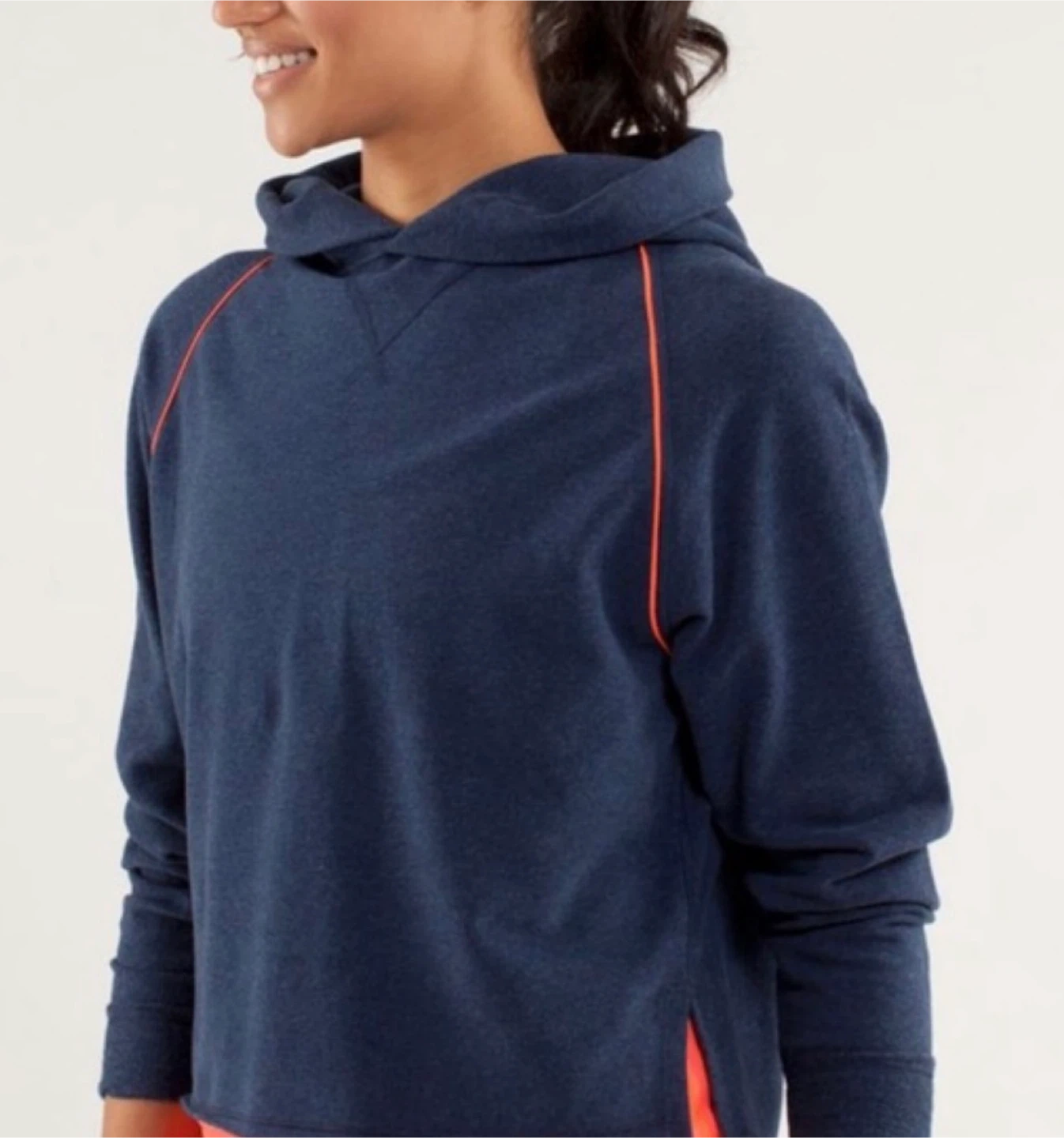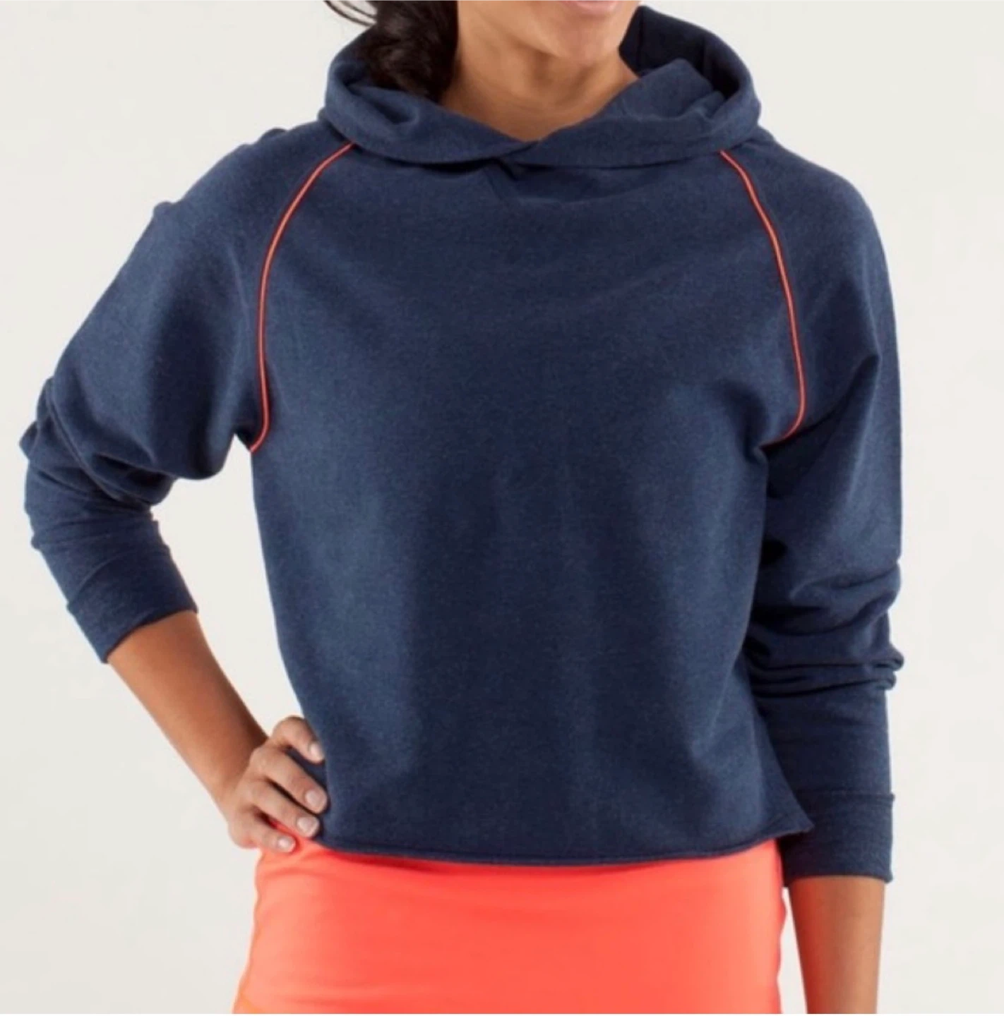 A comfy Lululemon hoodie in a navy blue heathered fabric. It features bright orange piping accents along the raglan seams and a relaxed, cropped fit. This pullover style has a cozy hood and long sleeves, perfect for casual wear.