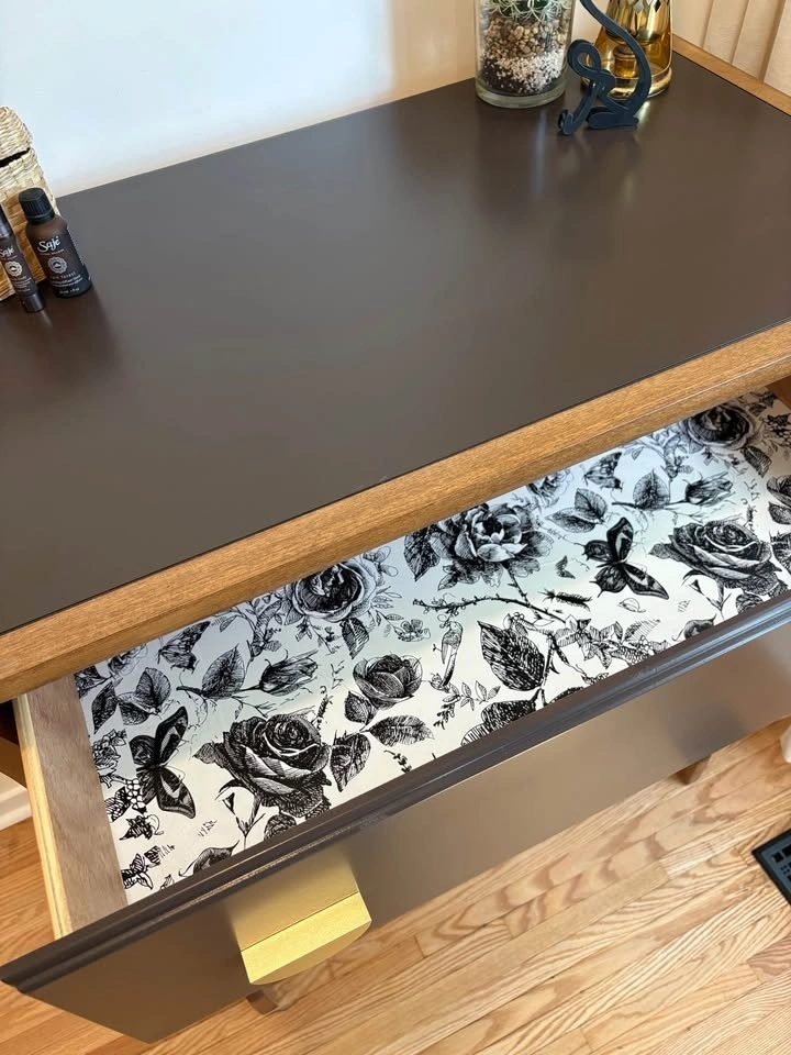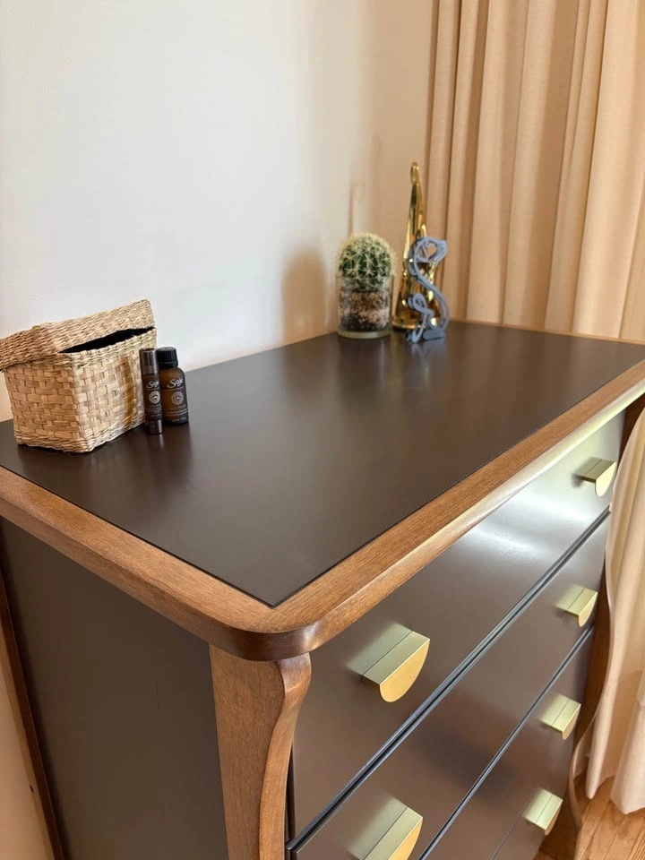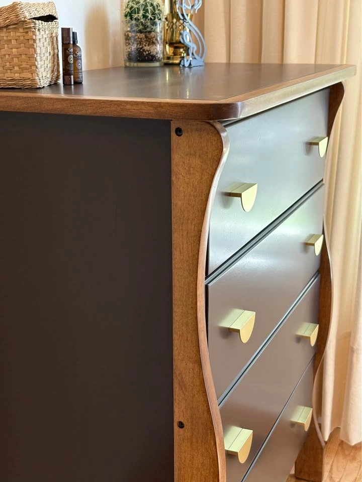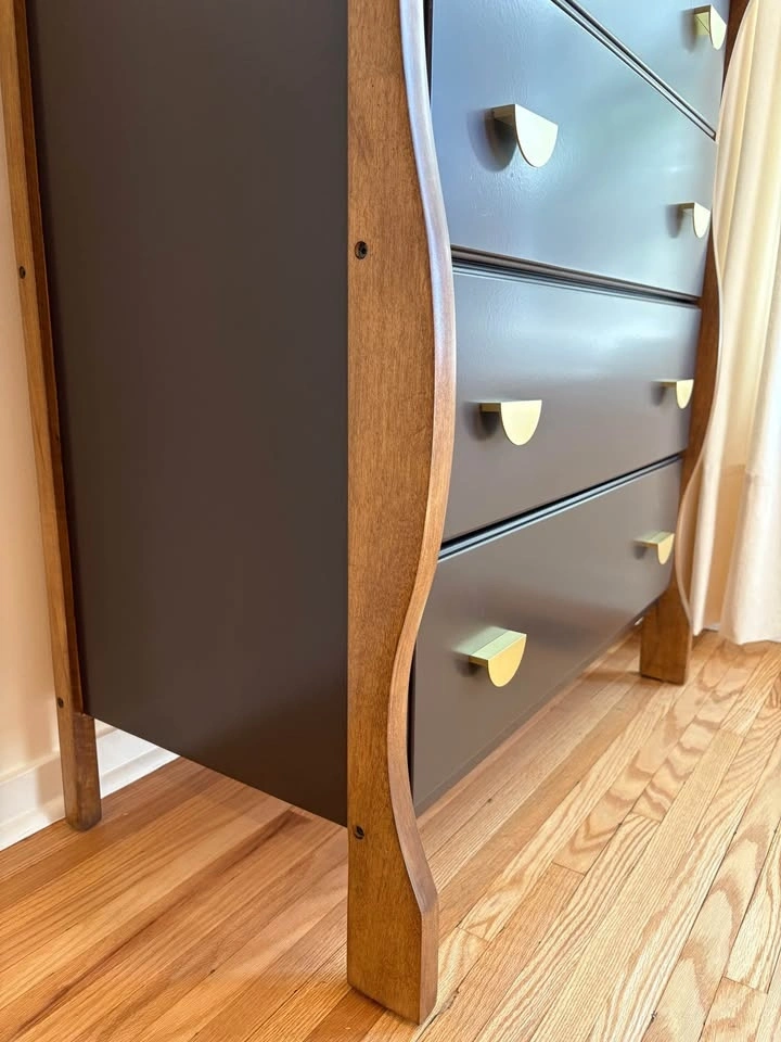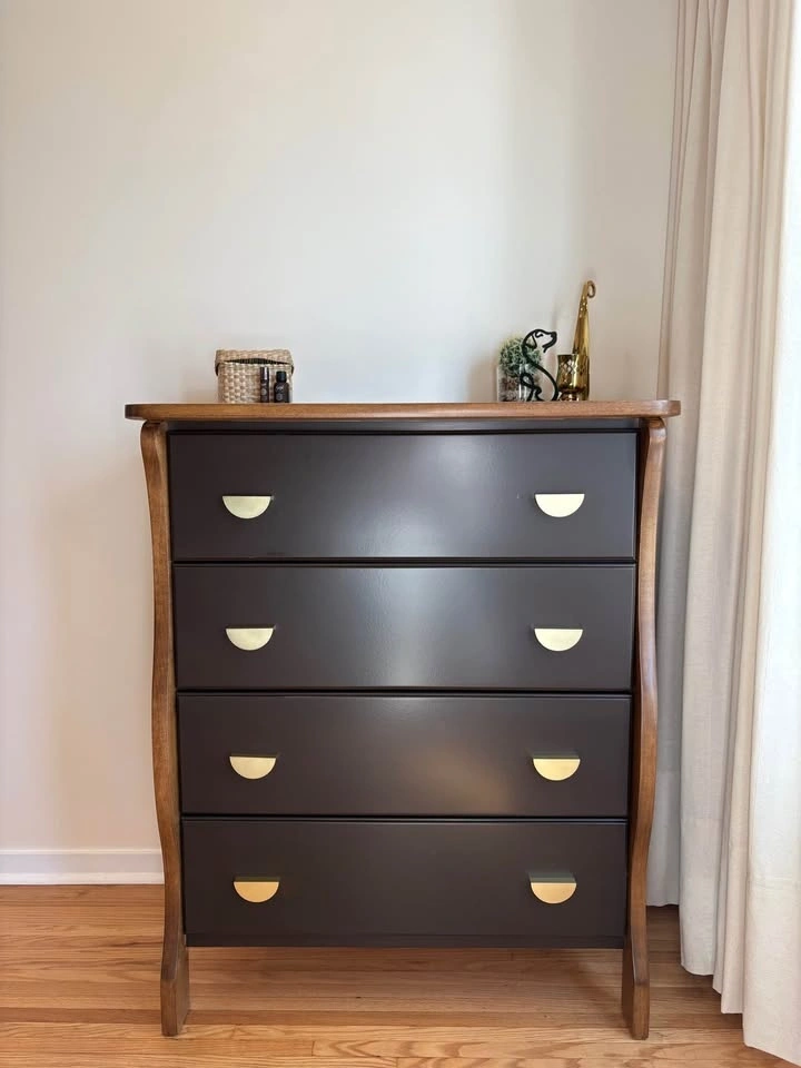 This one-of-a-kind dresser features a rich espresso finish, warm natural wood accents, and brass hardware. It was thoughtfully refinished to showcase its beautiful sculpted legs, which were intentionally left in a warm wood tone to highlight their character and create a striking contrast against the deep espresso body 🤎. It has a classic silhouette with a modern, elevated edge.