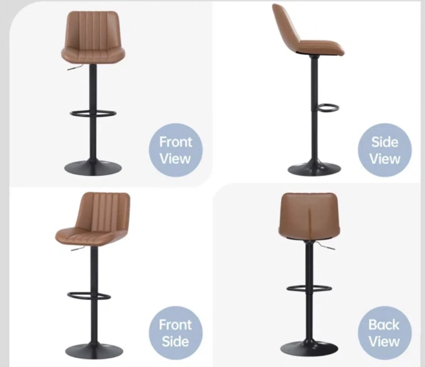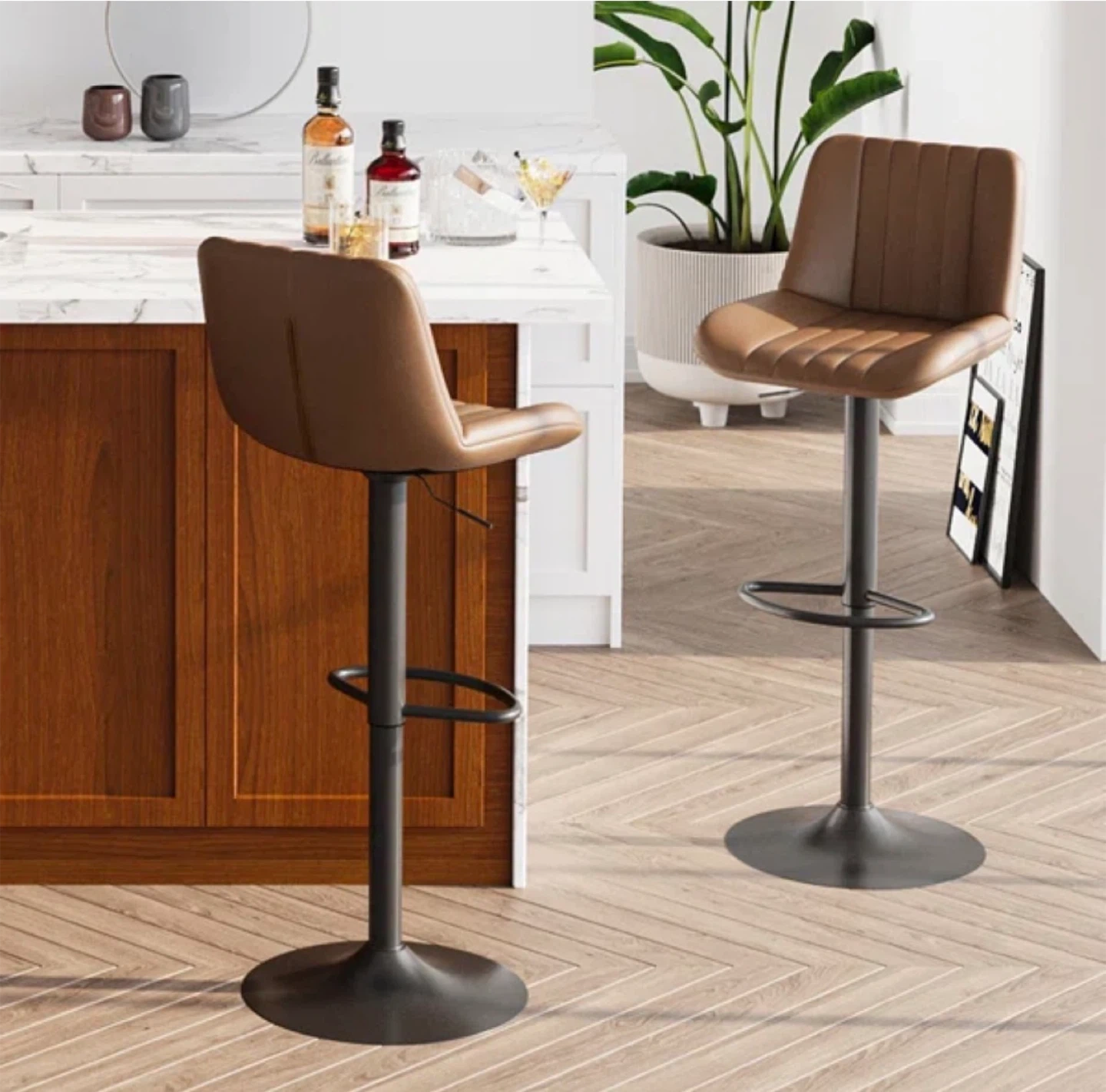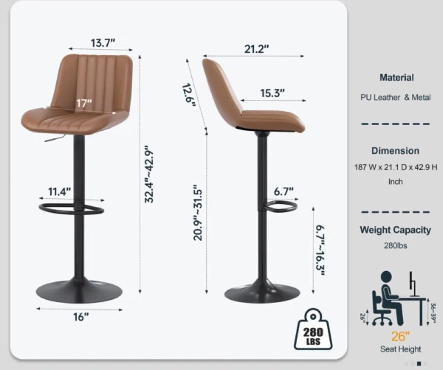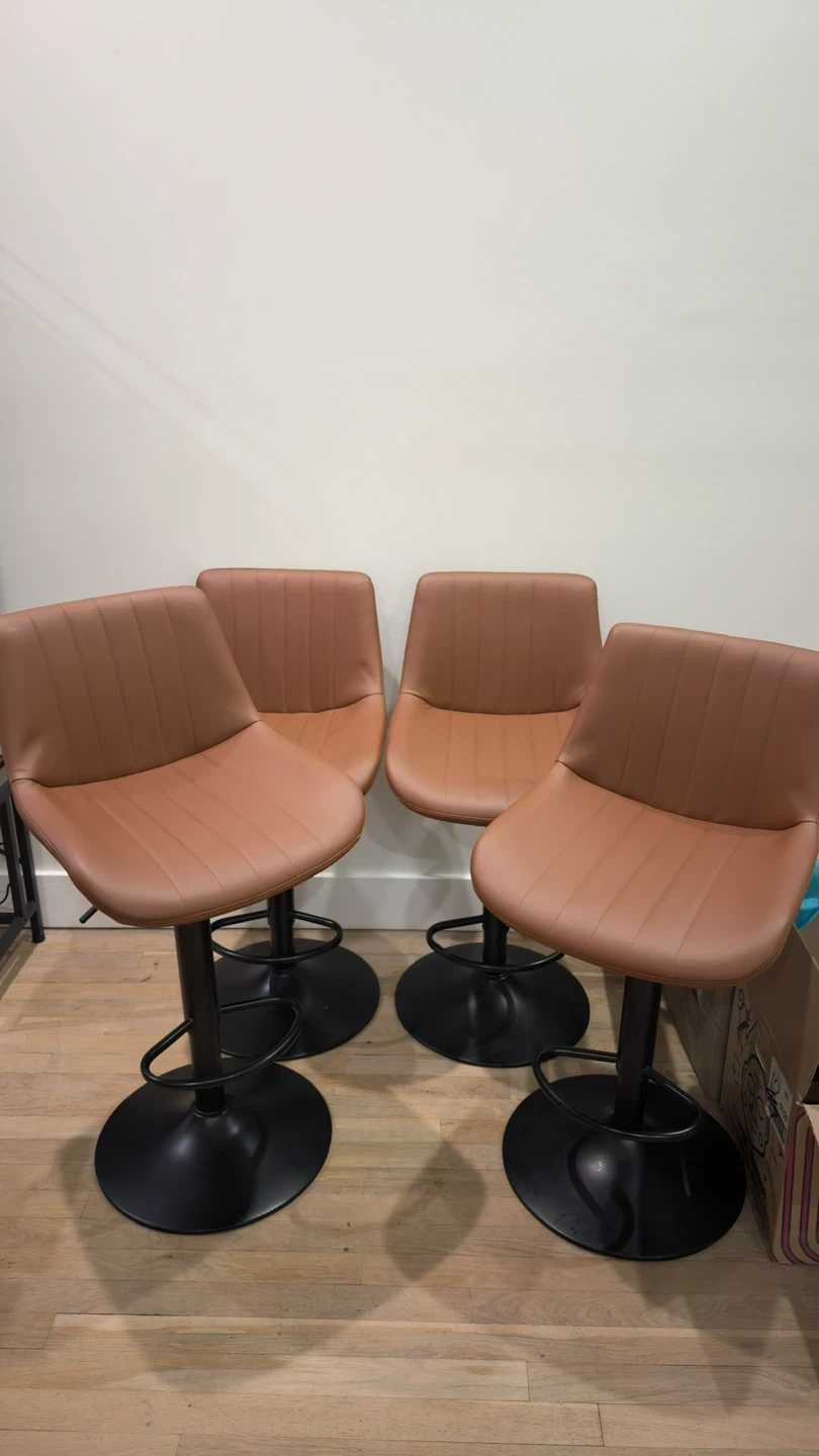 Set of four brown bar stools with metal bases. Seat height is adjustable from 20.9"-31.5". Each stool has a weight capacity of 280 lbs. Perfect for a kitchen island or home bar!