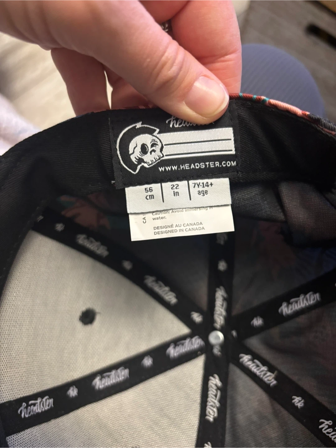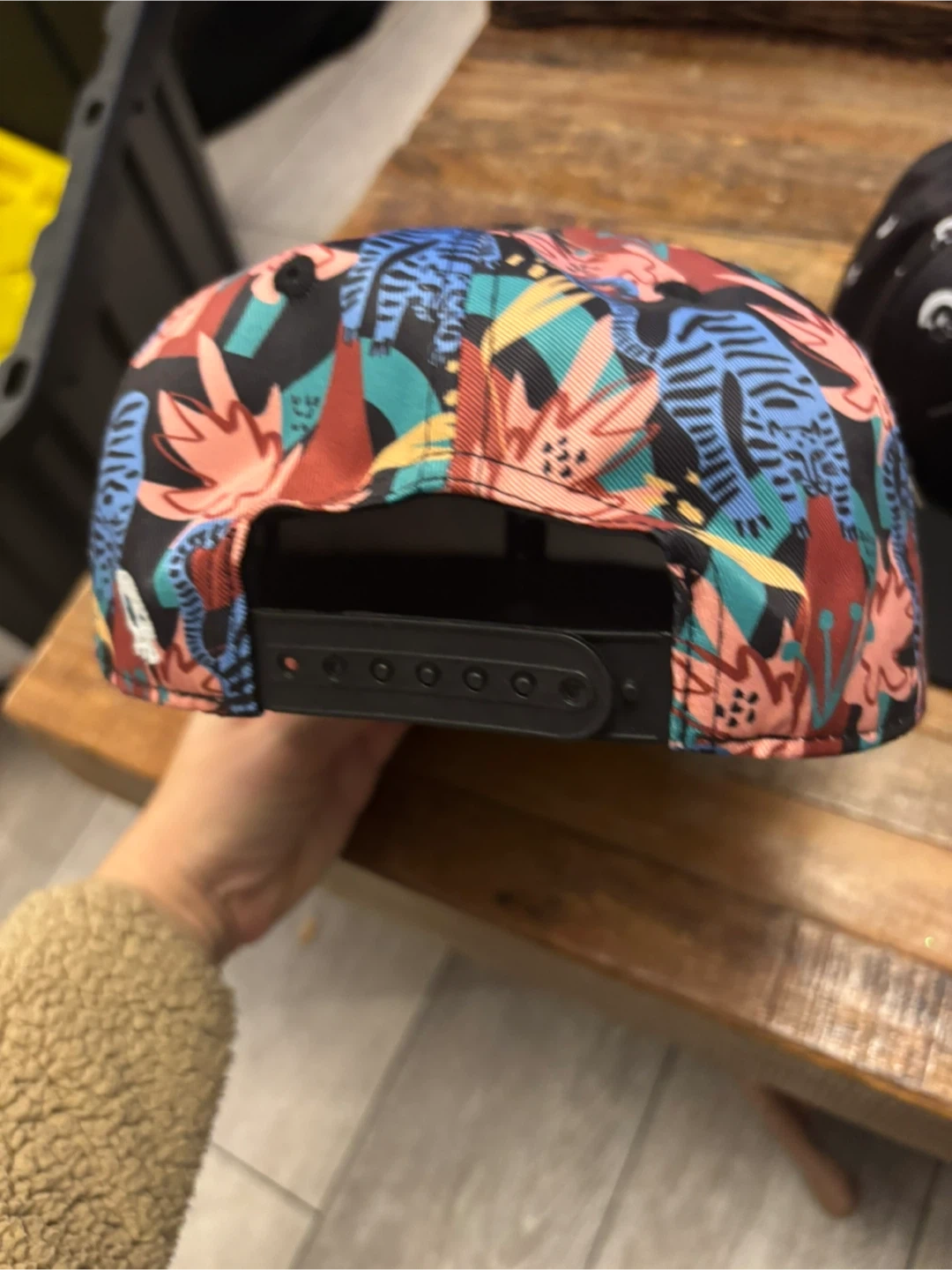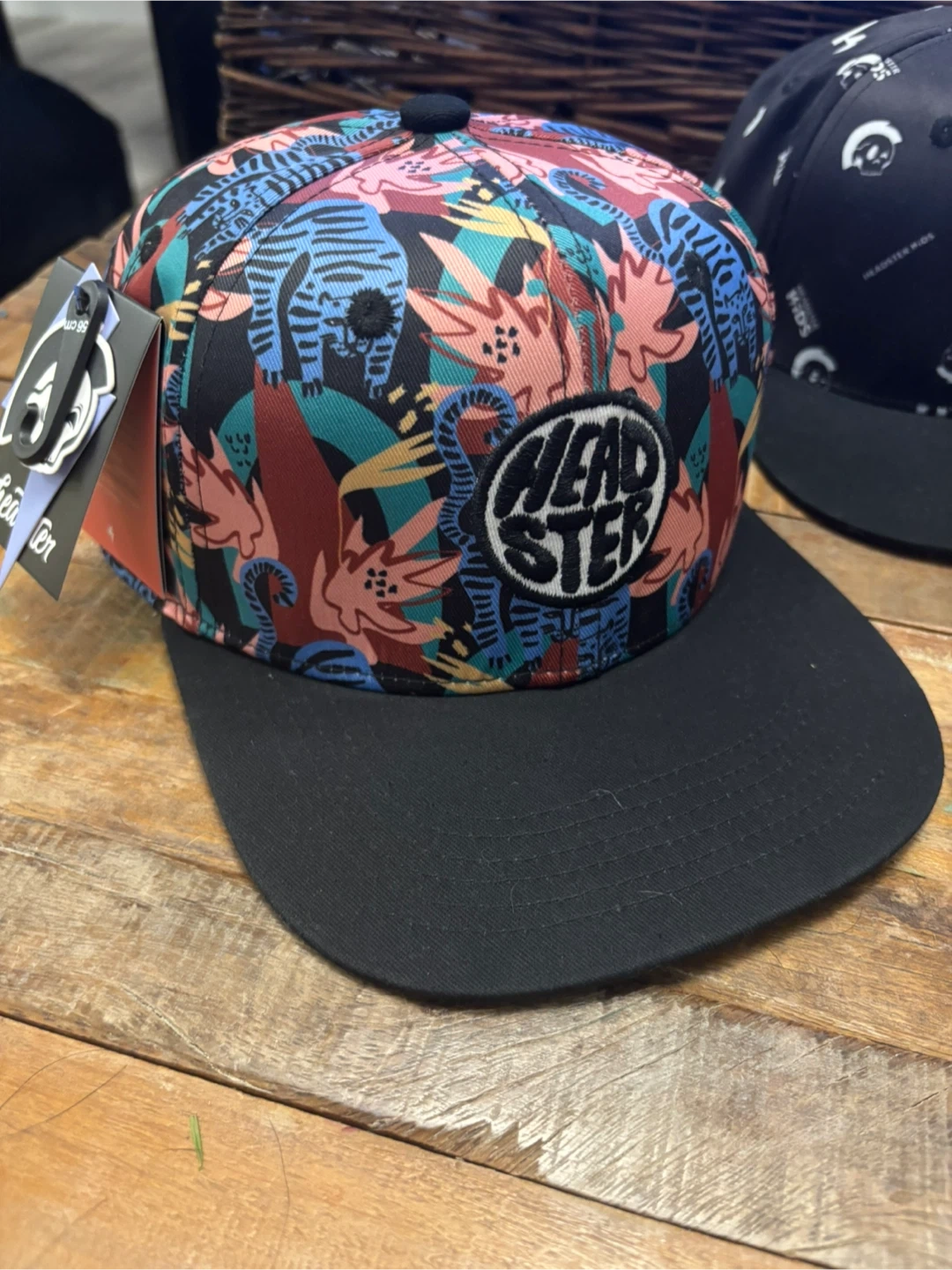 Headster snapback hat with a colourful floral print and black brim. Designed in Canada. Size 56cm / 22 inches.