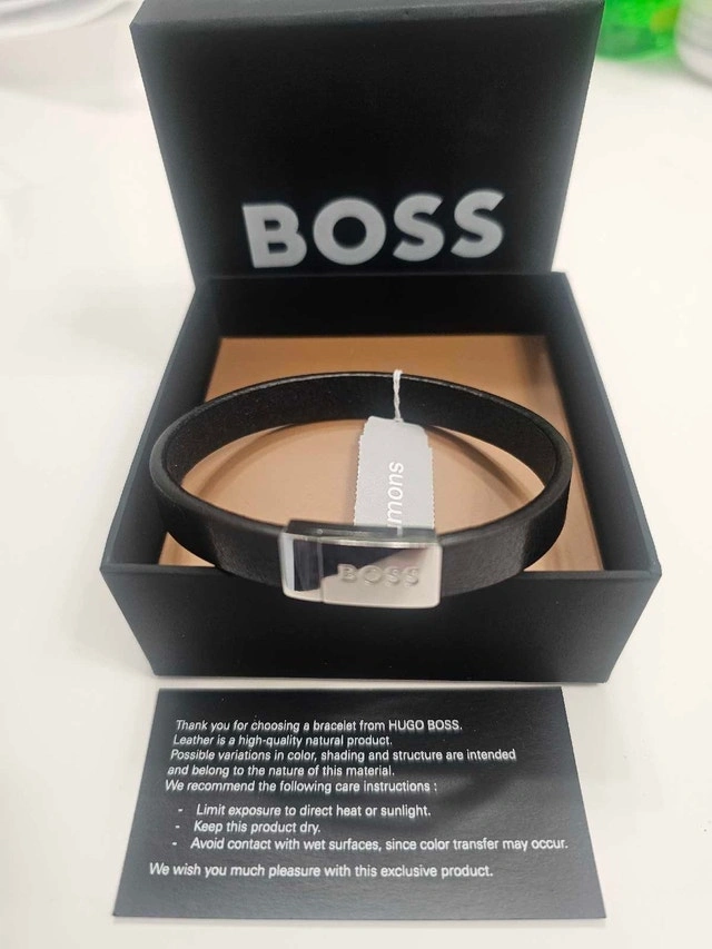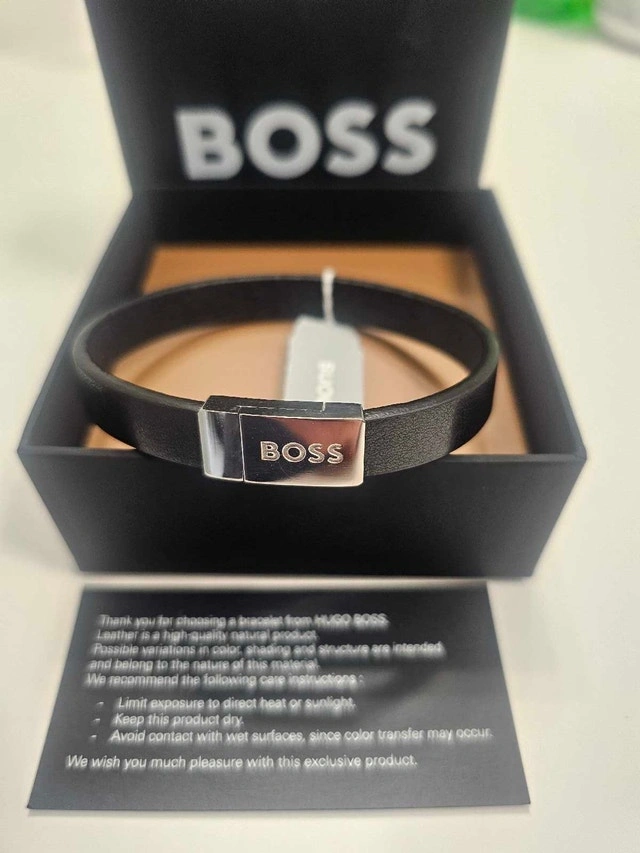 Elevate your style with this genuine Hugo Boss Lander bracelet (model 1580178M). Crafted from premium black braided leather with a polished stainless steel bar clasp engraved with the iconic "BOSS" logo. Magnetic closure makes it super easy to wear, and it's adjustable for a comfy fit (medium size, ~19cm/7.5" wrist). Condition: New. Cash accepted.