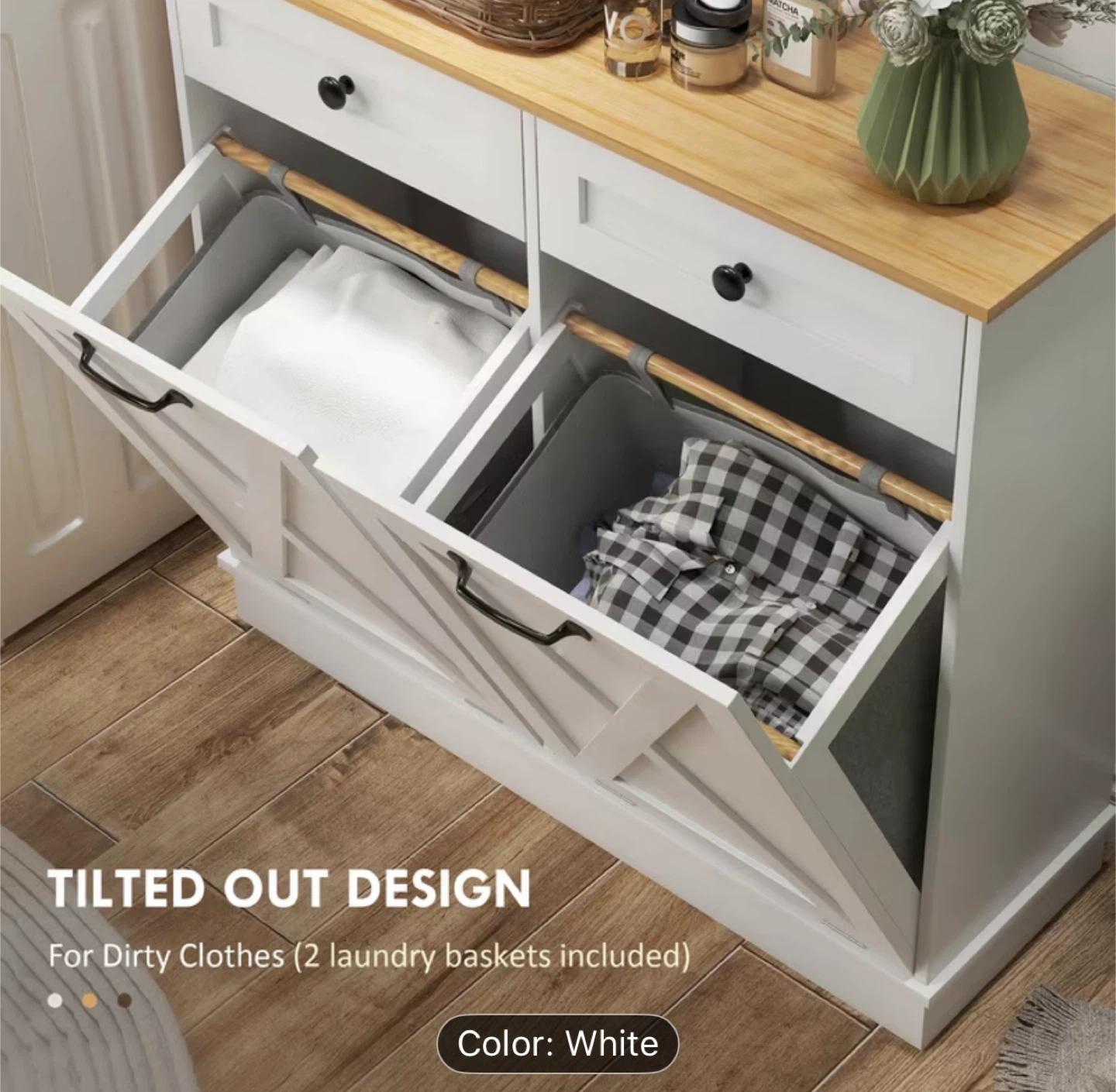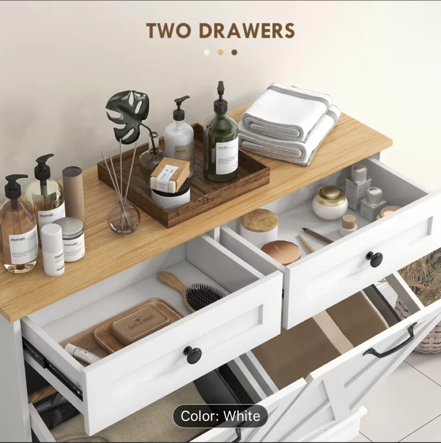 This cabinet features a tilted-out design for two laundry baskets, and it has two top drawers for extra storage. The top is a natural wood finish and the cabinet is white. It's great for organizing laundry in your bedroom or bathroom.