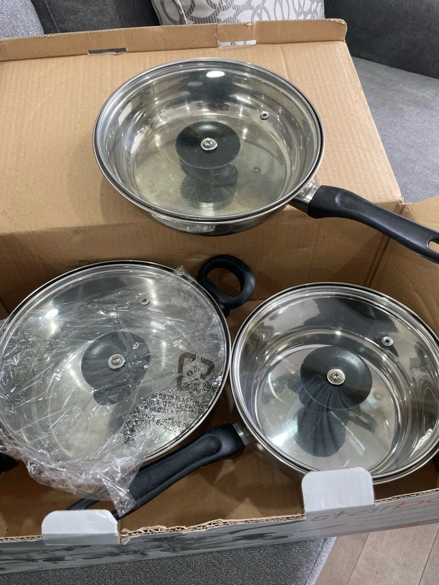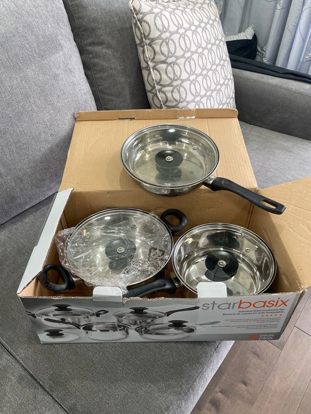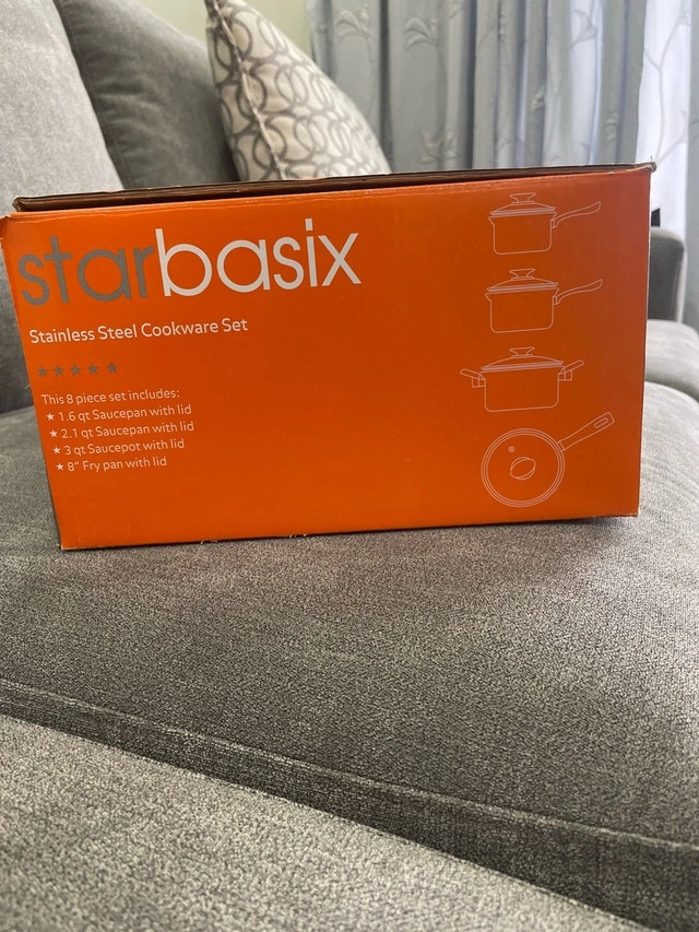 I'm selling a brand new Starbasix stainless steel 8-piece cookware set, complete with saucepans and a frying pan, all equipped with lids. This set is perfect for anyone looking to upgrade their kitchen essentials. * 1.6 qt Saucepan with lid * 2.1 qt Saucepan with lid * 3 qt Saucepot with lid * 8" Fry pan with lid