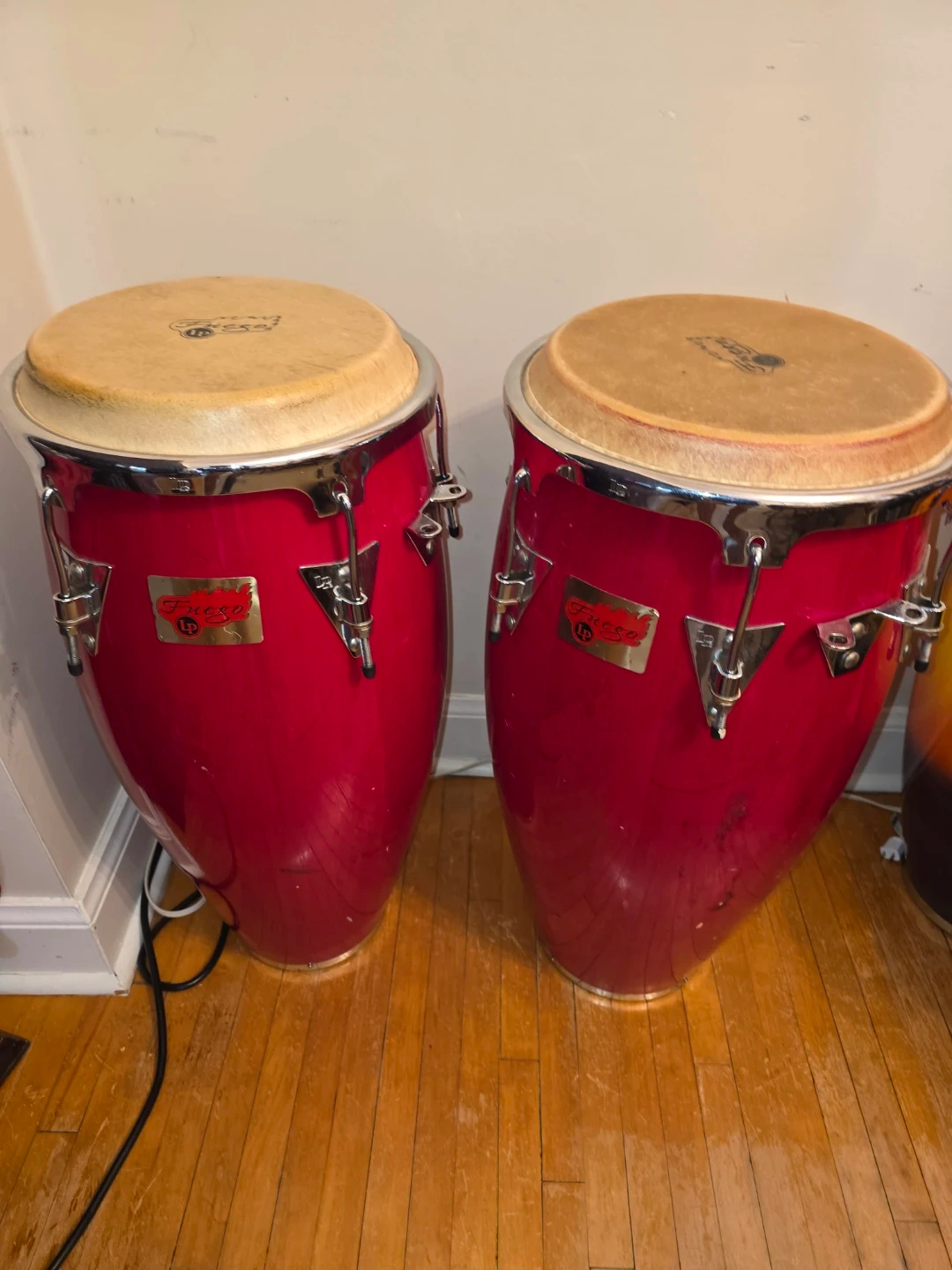 A pair of red LP conga drums with natural heads. These drums produce a clear and resonant sound. Great for percussionists looking to add to their rhythm section!
