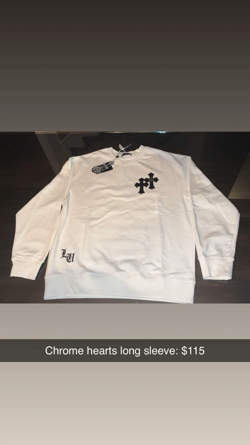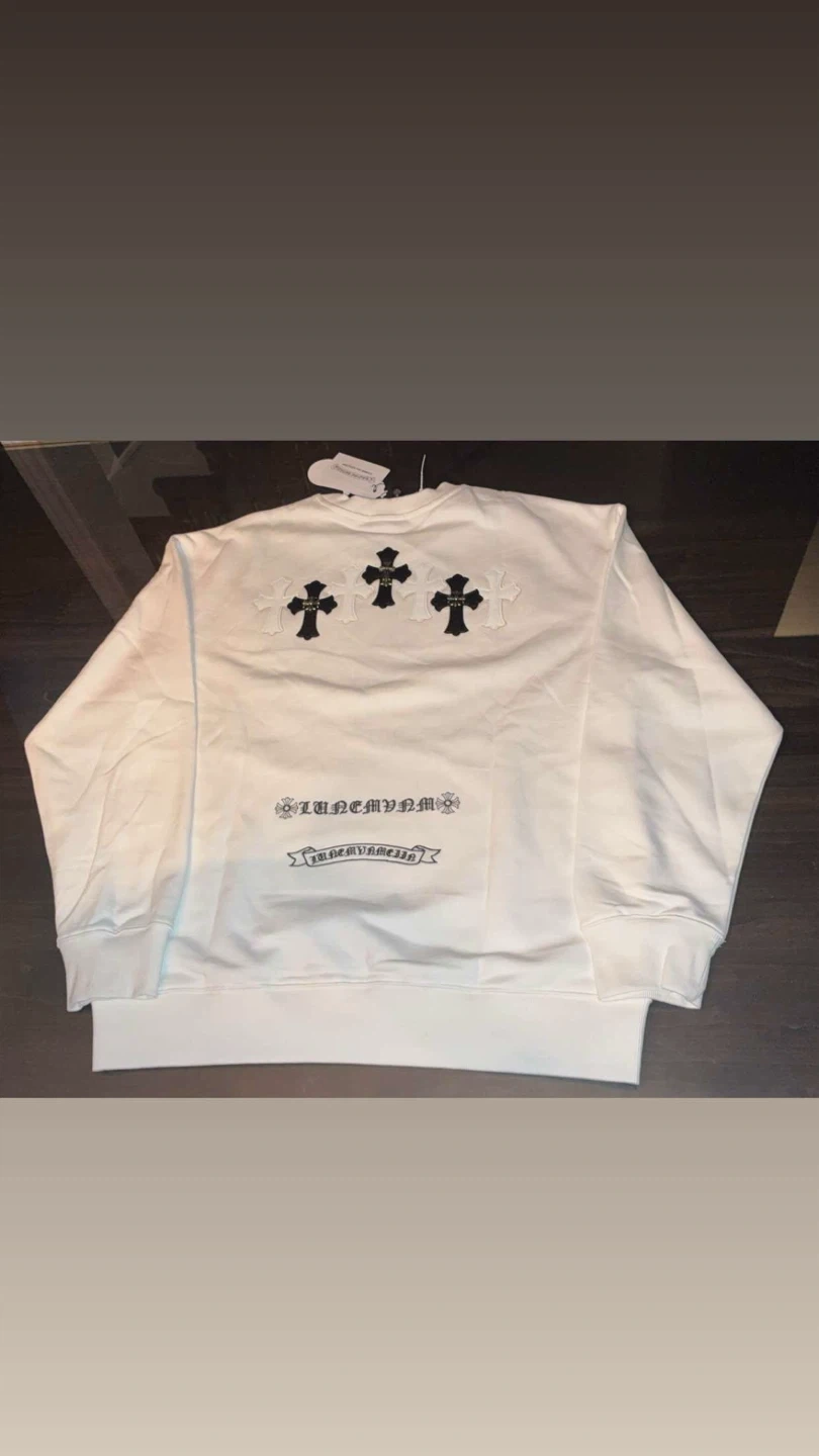 This is a white long sleeve crewneck from Chrome Hearts. It features a black cross graphic on the front and three cross graphics on the back. The material is soft and comfortable.