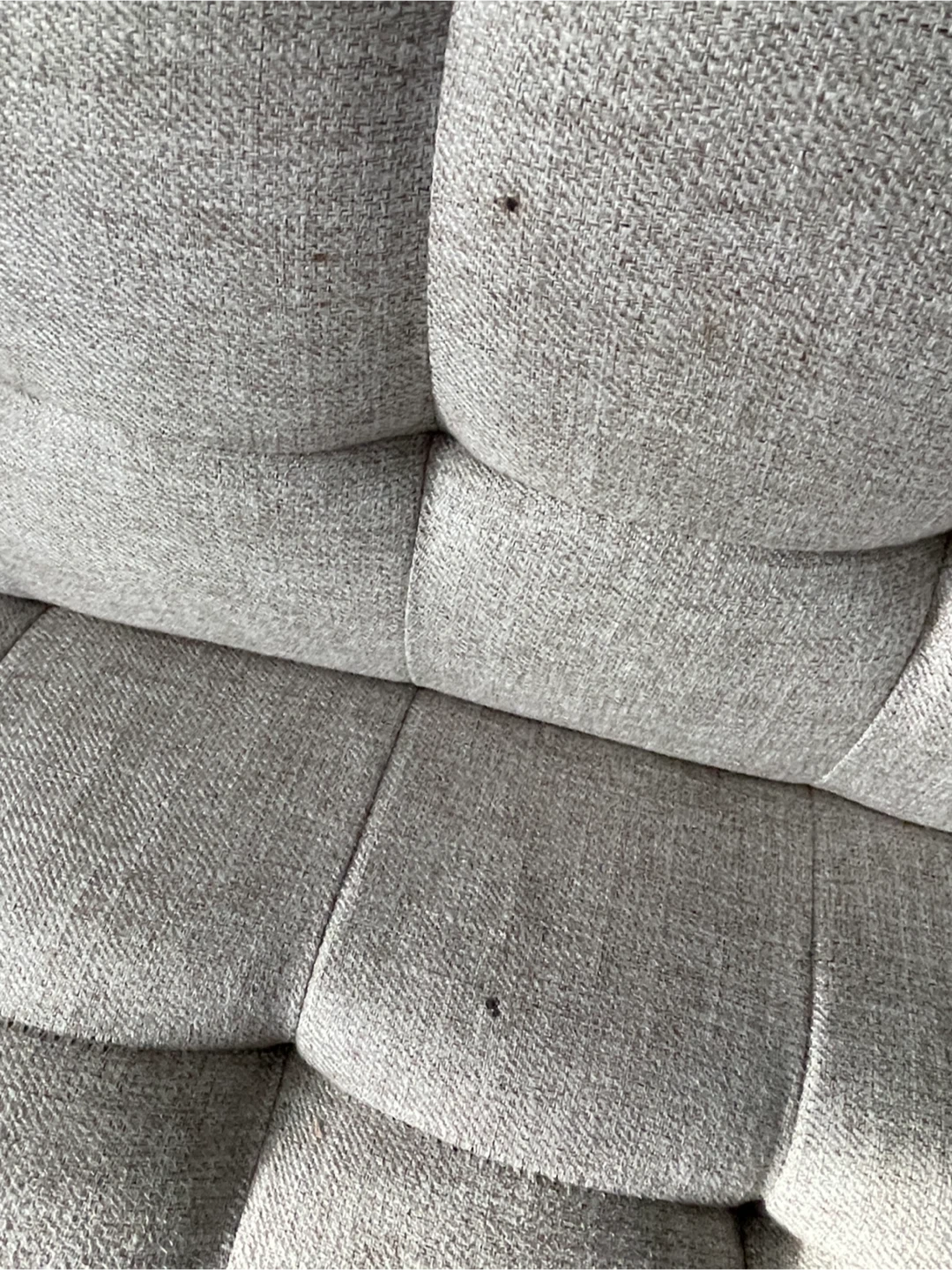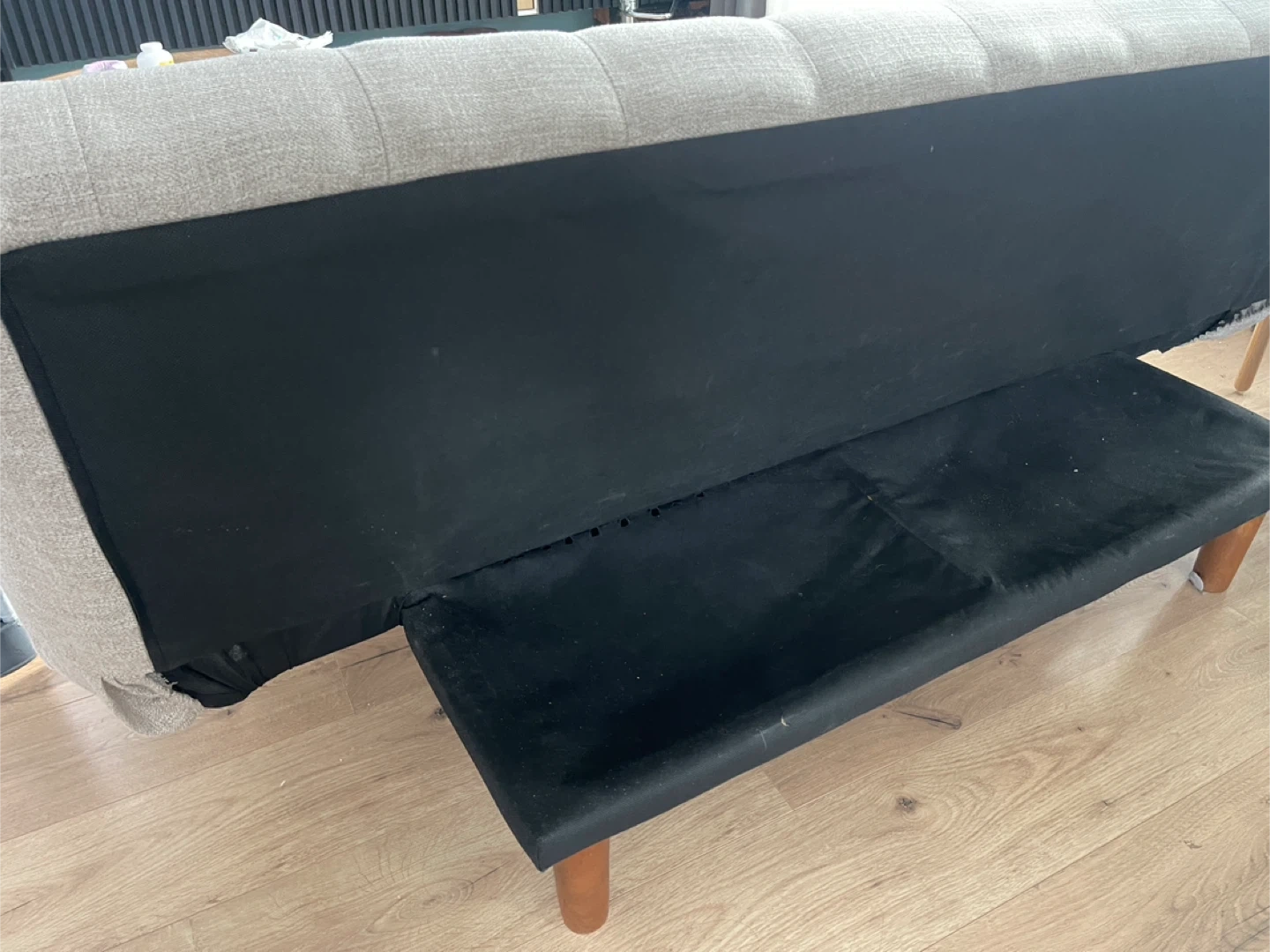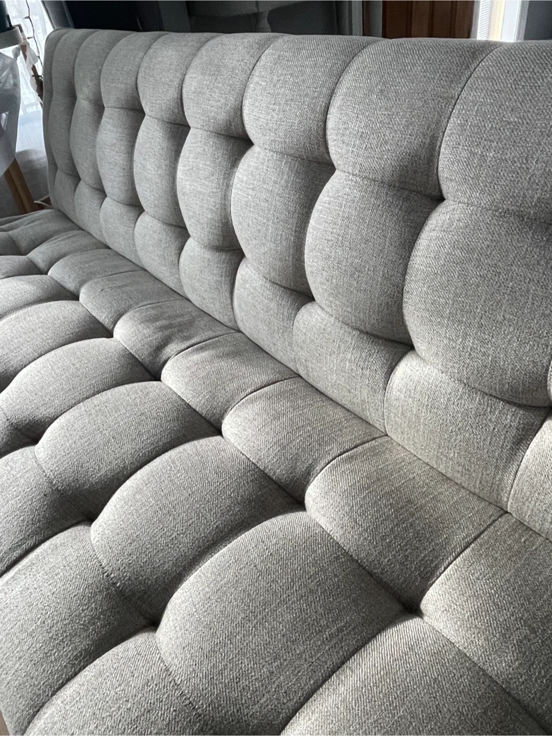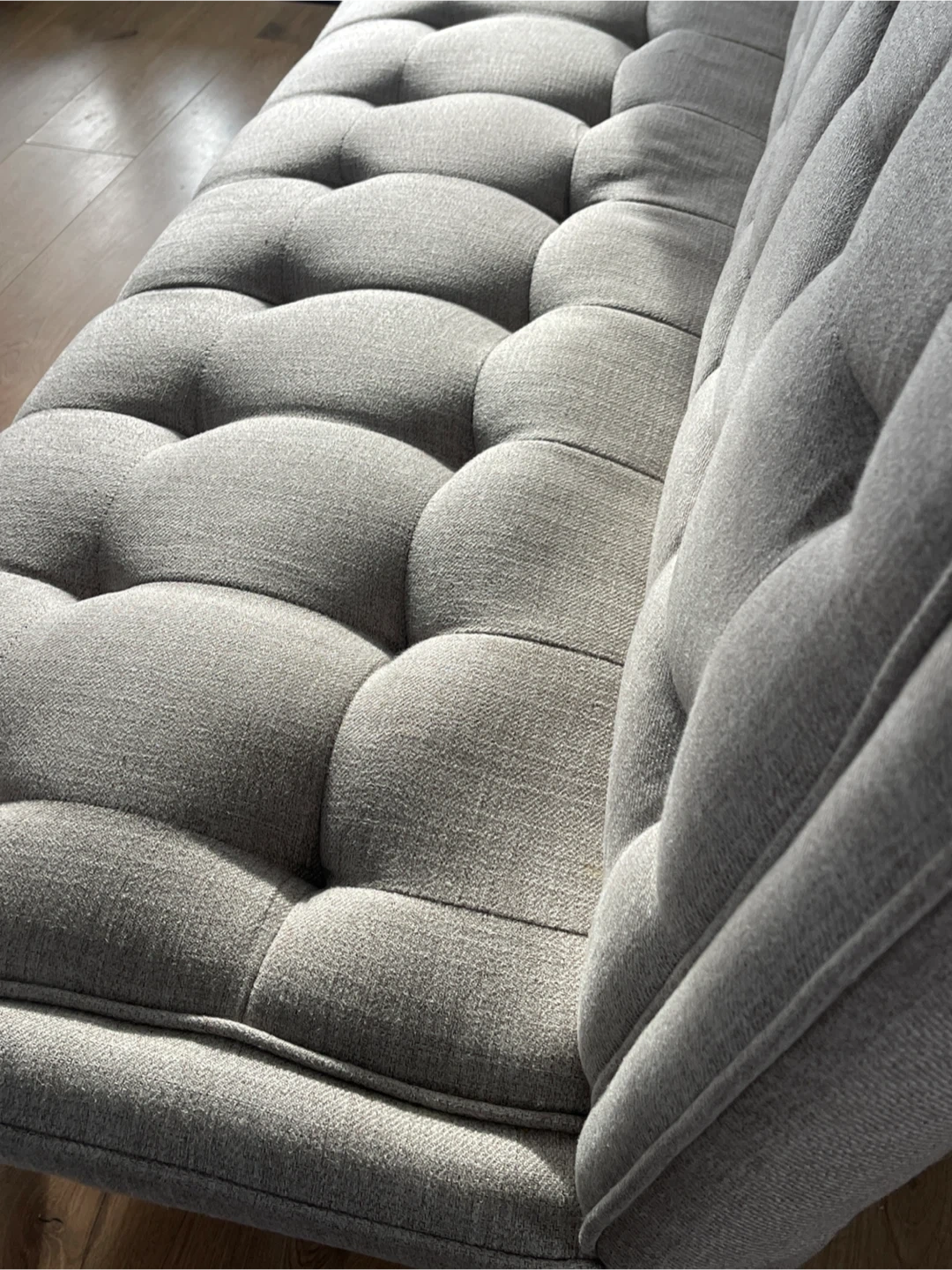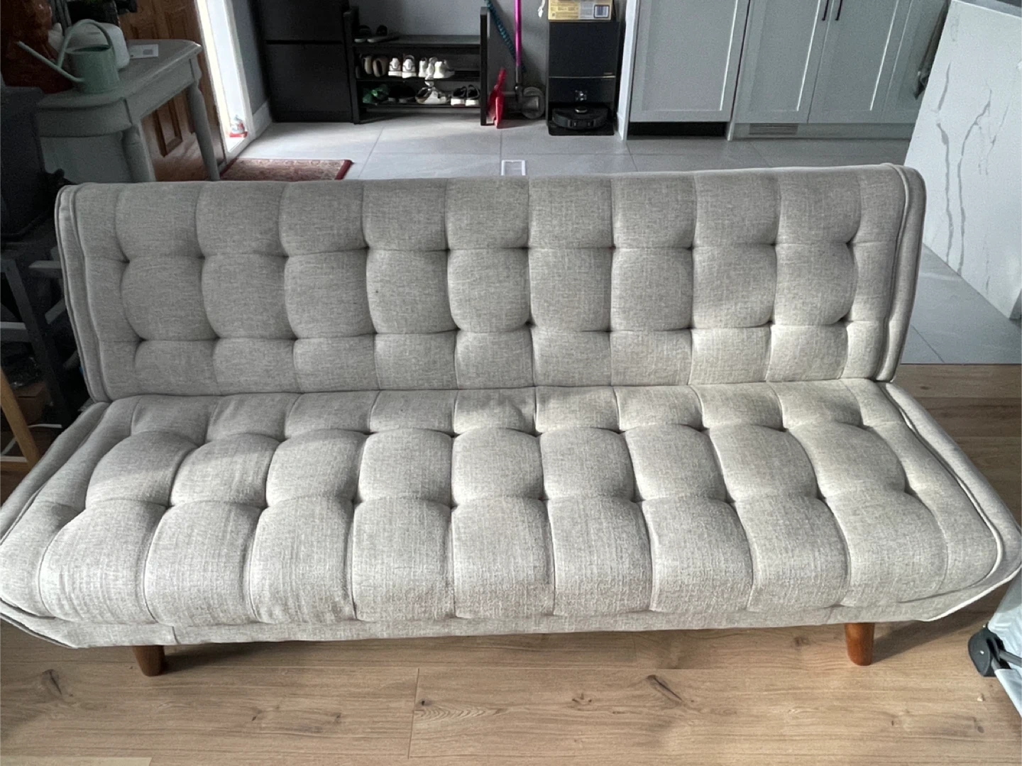 This is a grey tufted futon sofa bed with wooden legs. It can convert into a flat bed for sleeping. It's a stylish addition to any room!