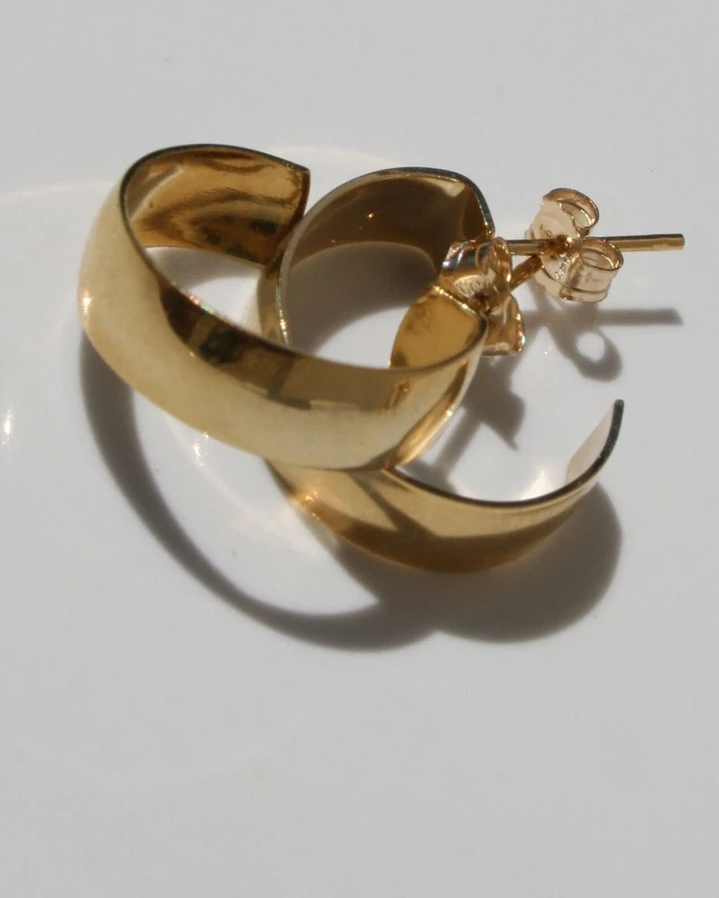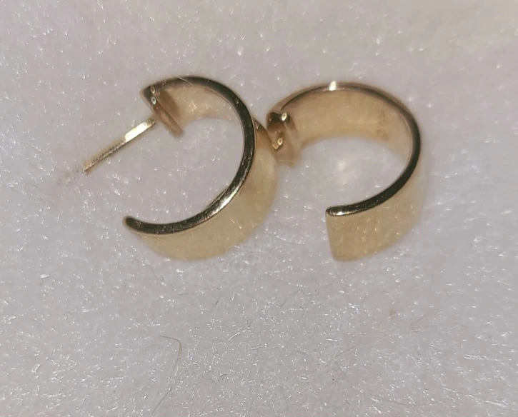 Classic gold hoop earrings. They're shiny and have a timeless design. The marking "M 925" is visible on the post, indicating sterling silver with gold plating.