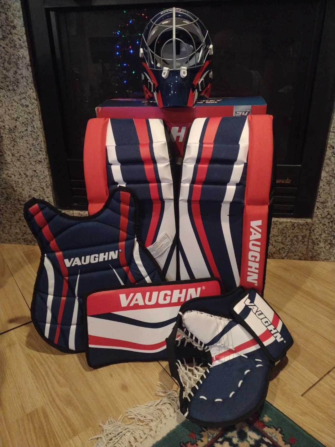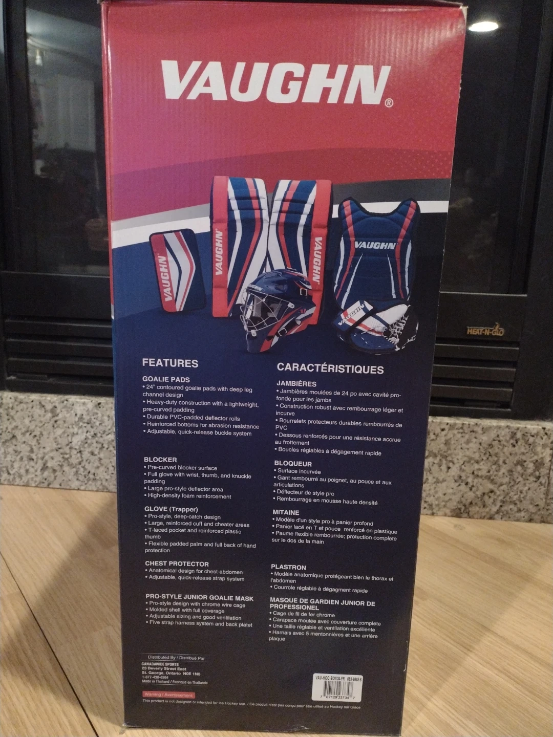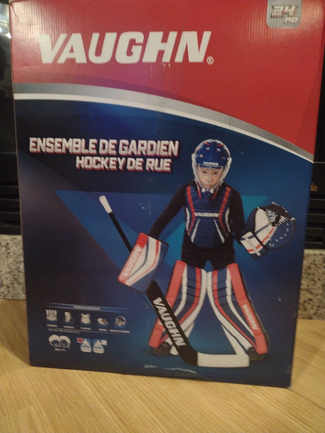 I'm selling a Vaughn street hockey goalie set, perfect for kids aged 7-11 who want to try out street hockey! The set includes goalie pads with deep leg channel design, a pre-curved blocker surface, and chest protection. It also comes with a trapper and a junior goalie mask. The adjustable, quick-release buckle system ensures a secure fit. The box is included!