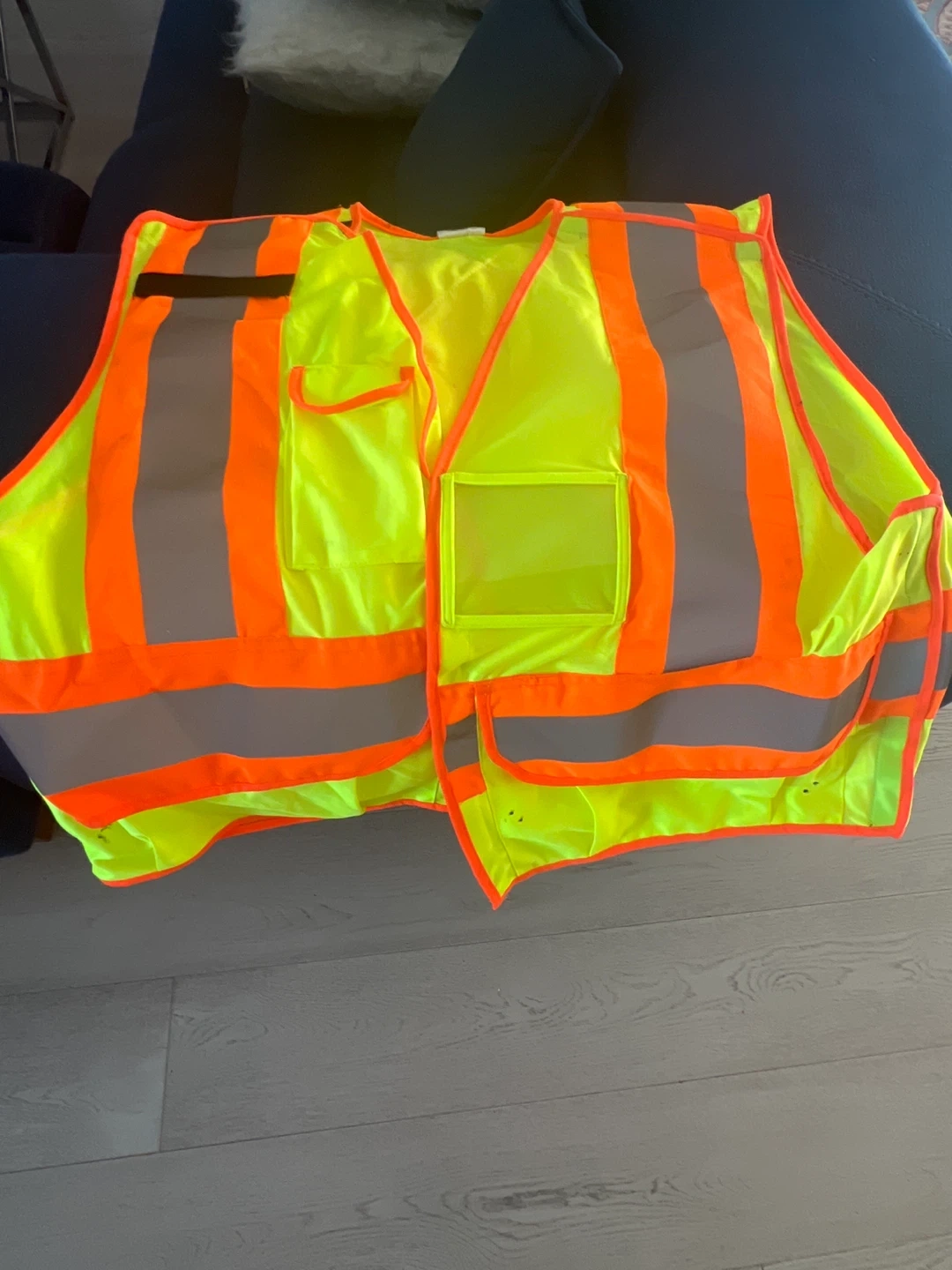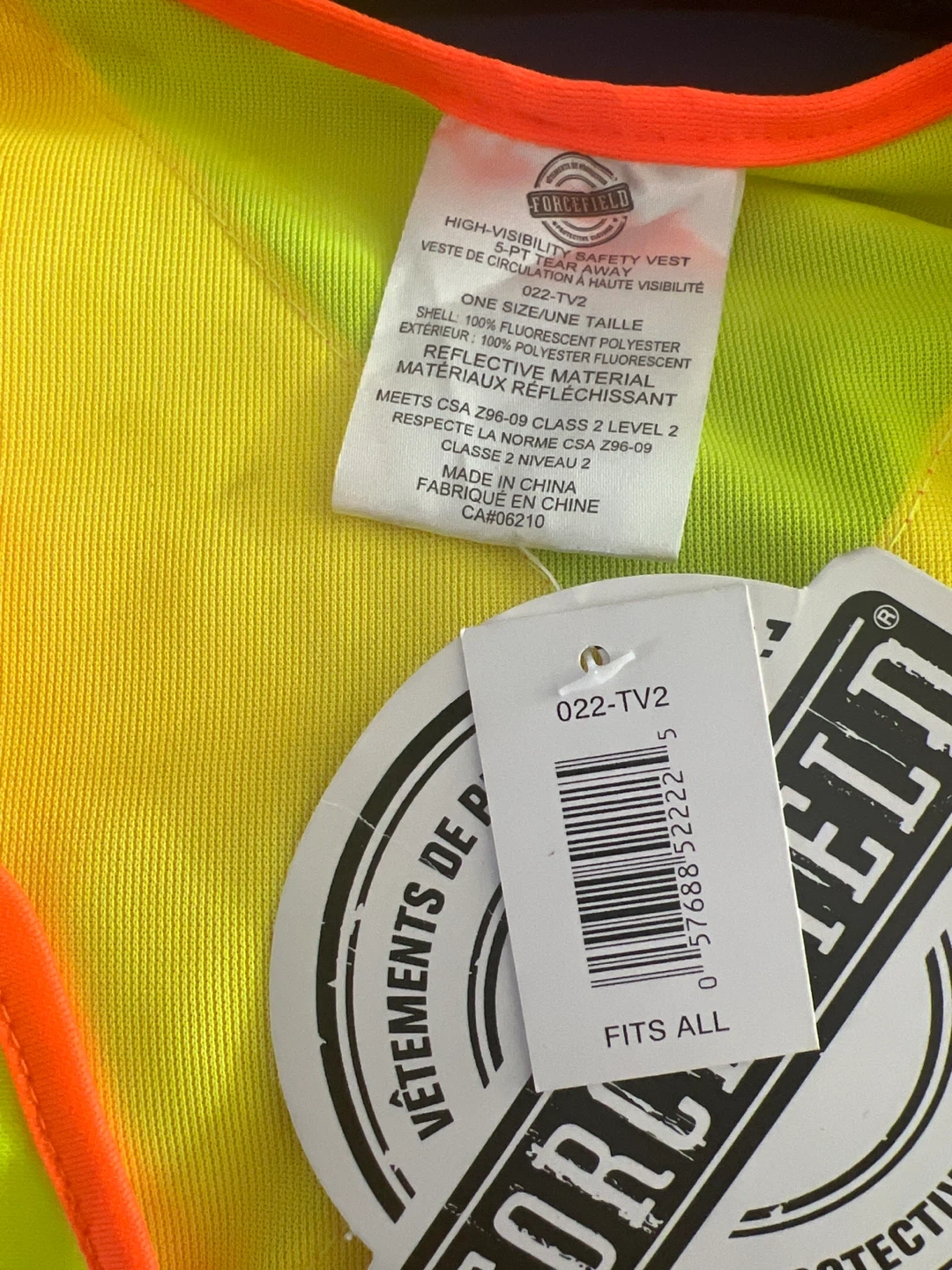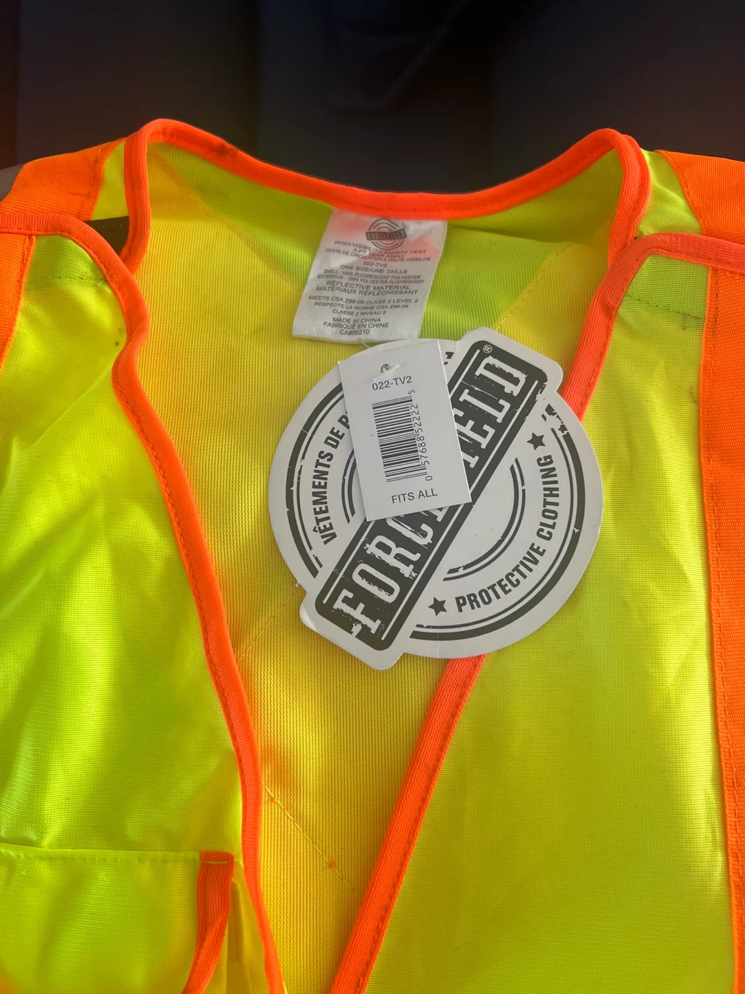 High-visibility safety vest in fluorescent yellow with orange trim. Shell is 100% fluorescent polyester. Meets CSA Z96-09 Class 2 Level 2 standards. Fits all sizes.