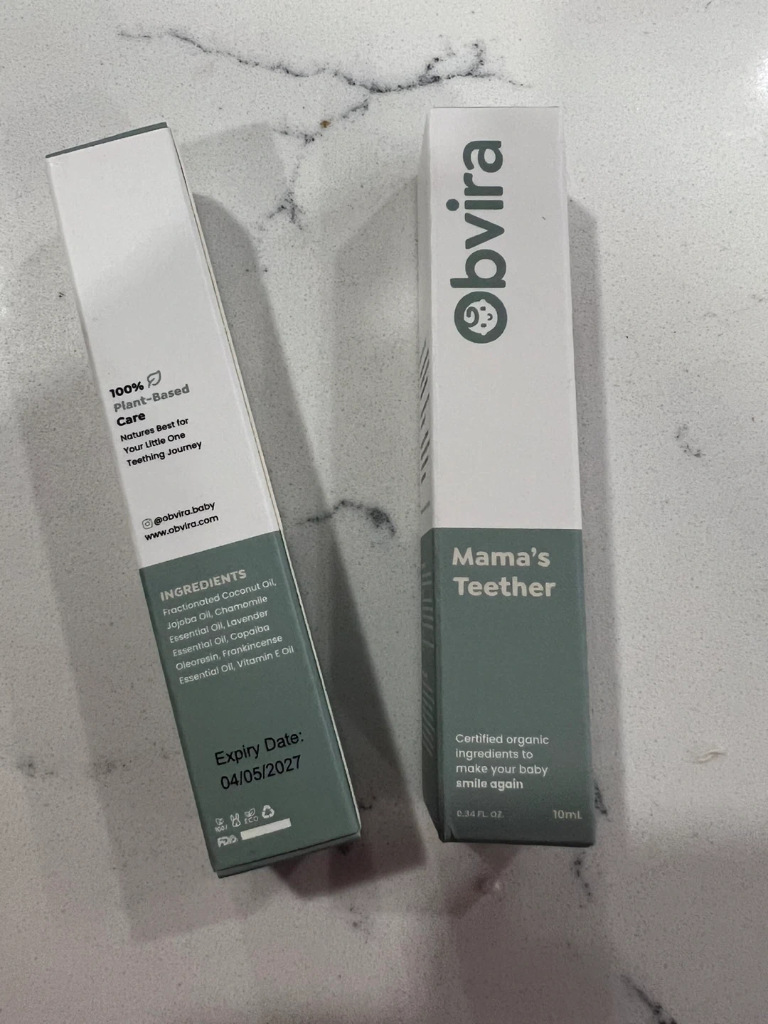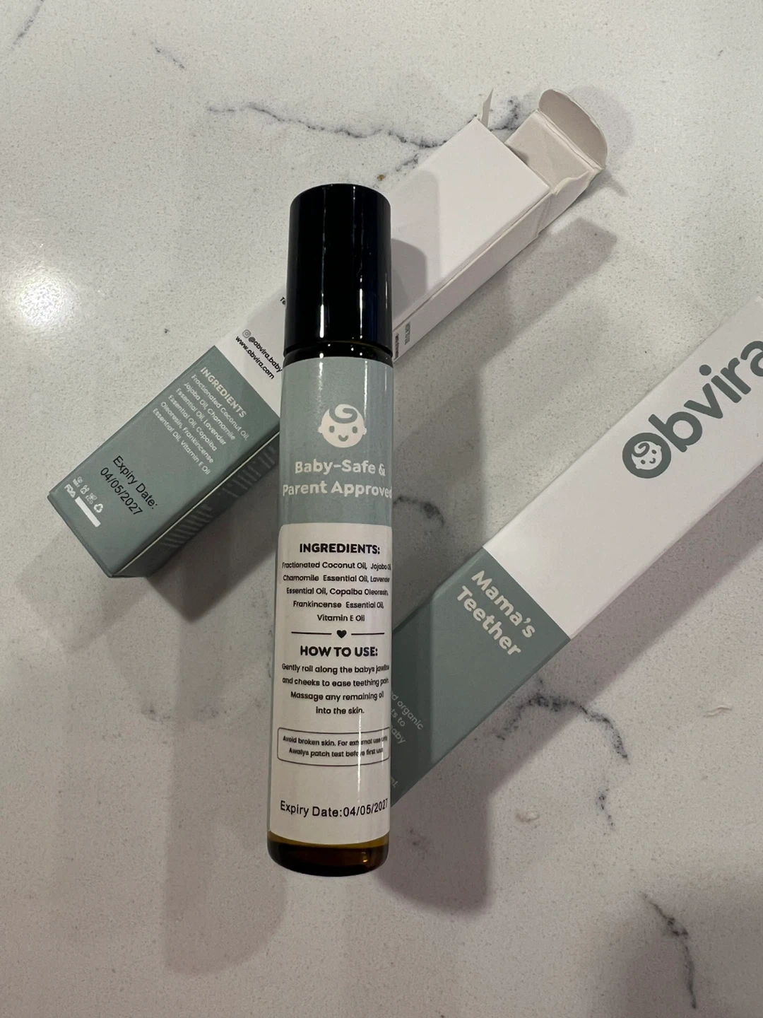 This is Obvïra Mama's Teether, a natural teething comfort roller. It's made with certified organic ingredients and contains fractionated coconut oil, jojoba oil, chamomile, lavender, peppermint, frankincense essential oils, and vitamin E oil. Expiry date is 04/05/2027.