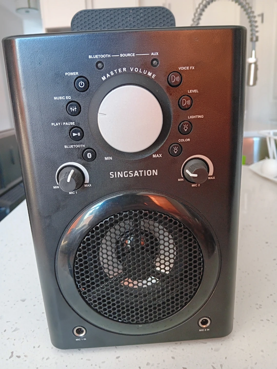 This Singsation speaker offers Bluetooth and AUX connectivity. It features master volume control, music EQ, and voice effects. Two microphone inputs are included for karaoke or performances. Lighting and colour controls are also built in.