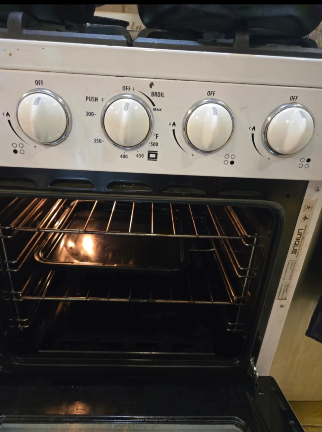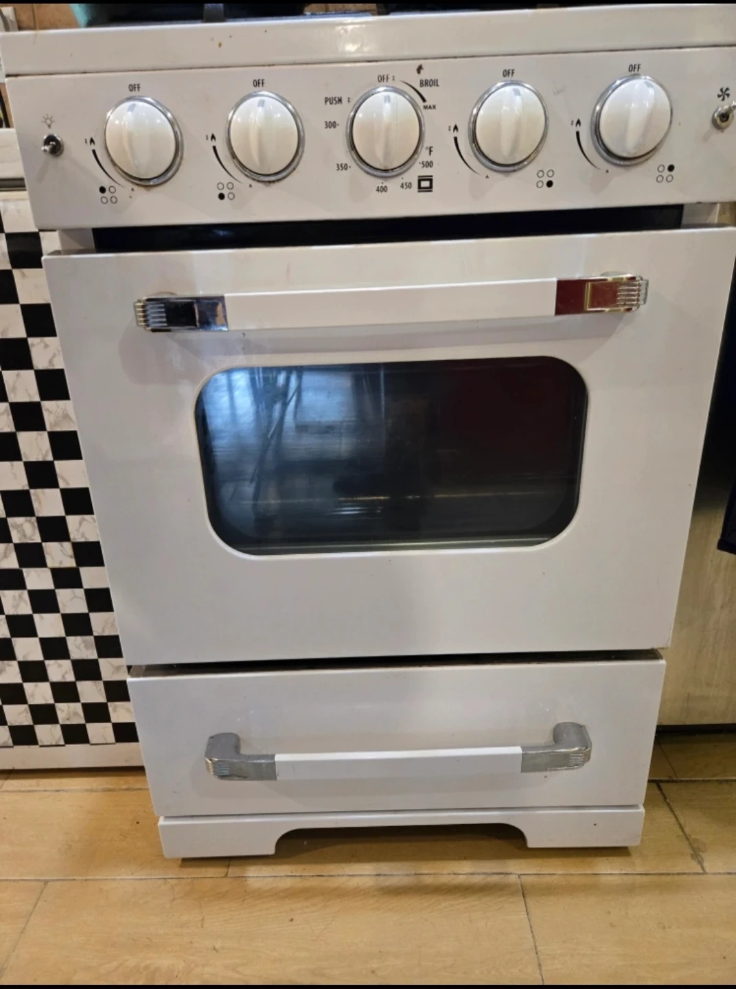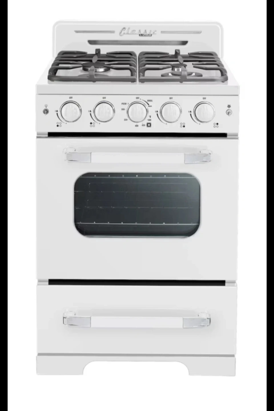 This is a Classic brand white gas range with four burners on top and an oven below. It includes a broiler function and a storage drawer at the bottom. The oven temperature controls range from 300 to 500 degrees Fahrenheit.