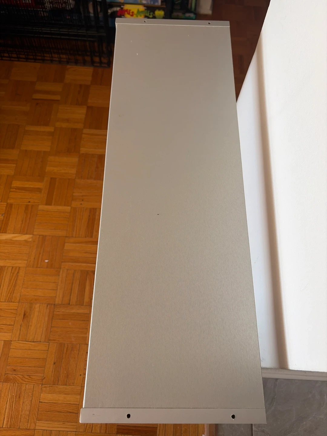 This is a silver two-tier shelf unit. offers simple storage. Could be used for books or decorative items. 26-27” length and height & about 8.5” width