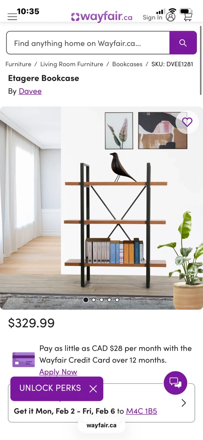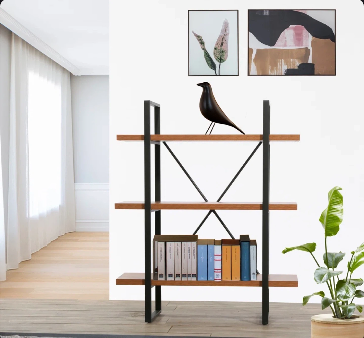 This three-shelf etagere bookcase features a metal frame with wood-look shelves. It's 43" high and 35" wide. The shelves are 11.34" deep.