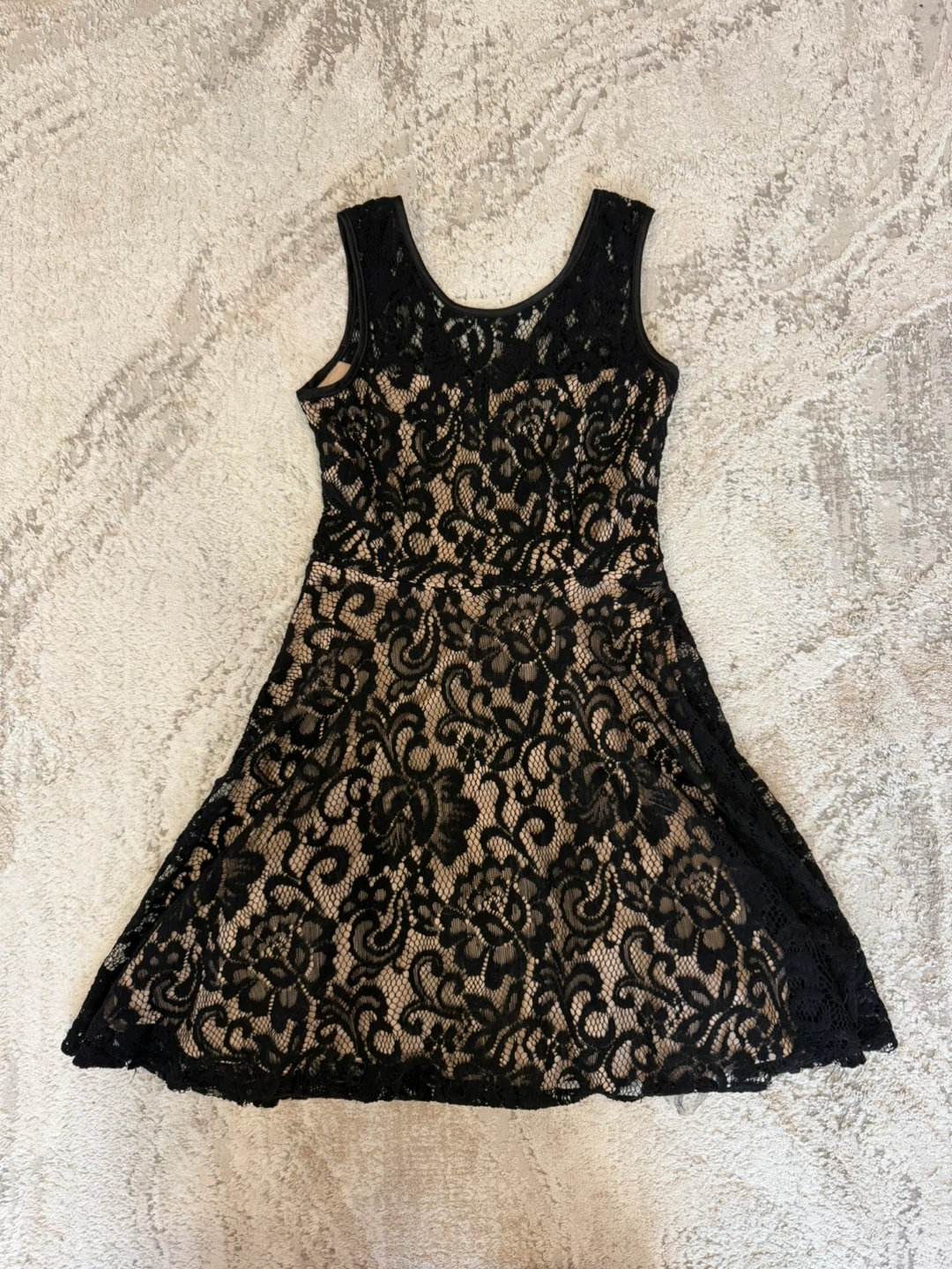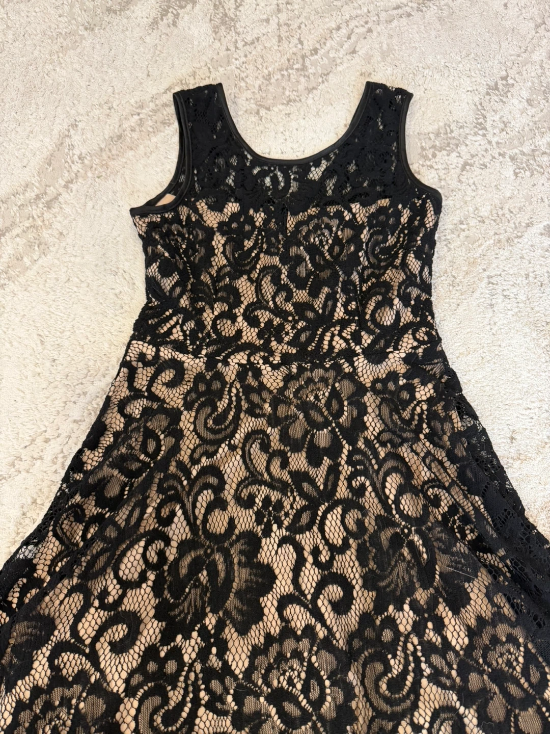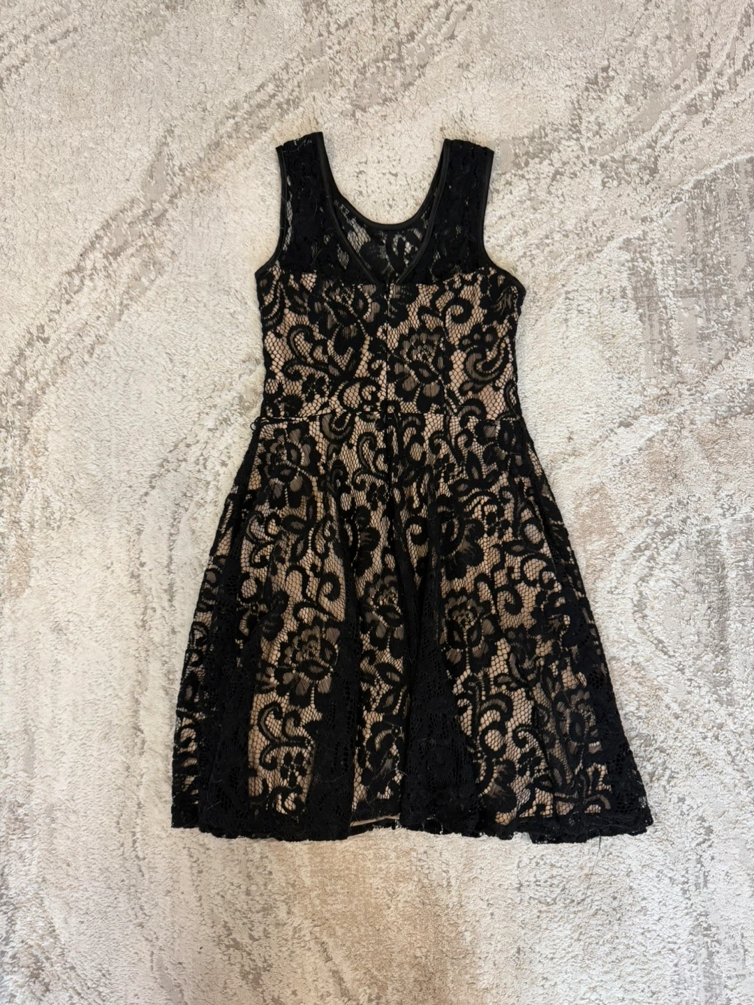 This sleeveless black lace dress has a beige lining. It features a fit and flare silhouette with a zippered back, size 4.