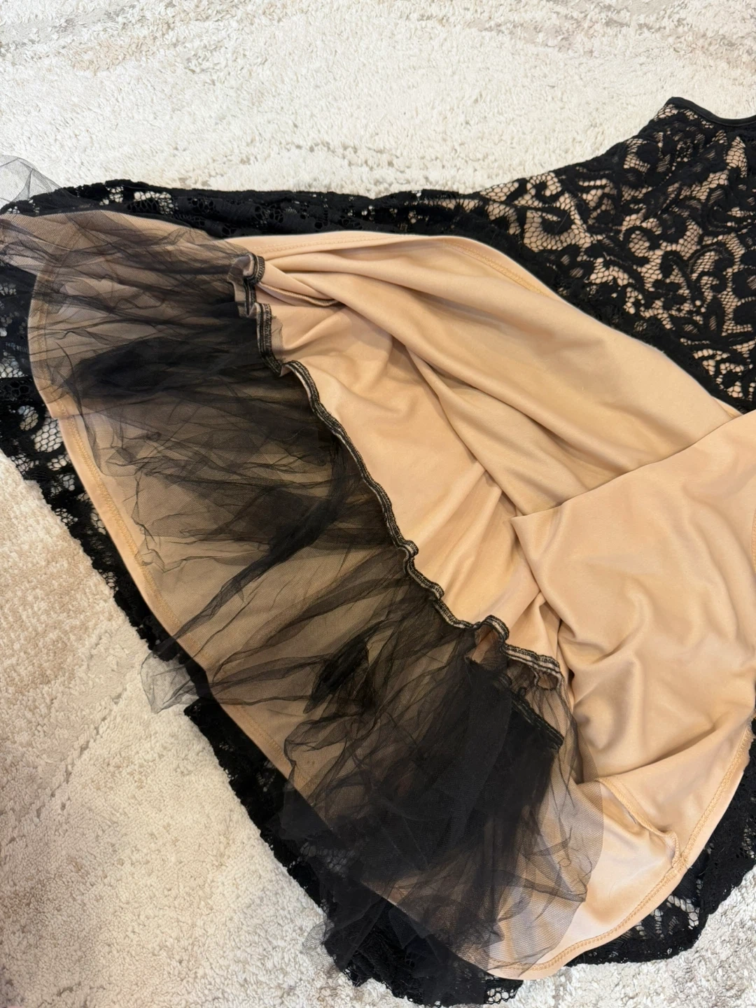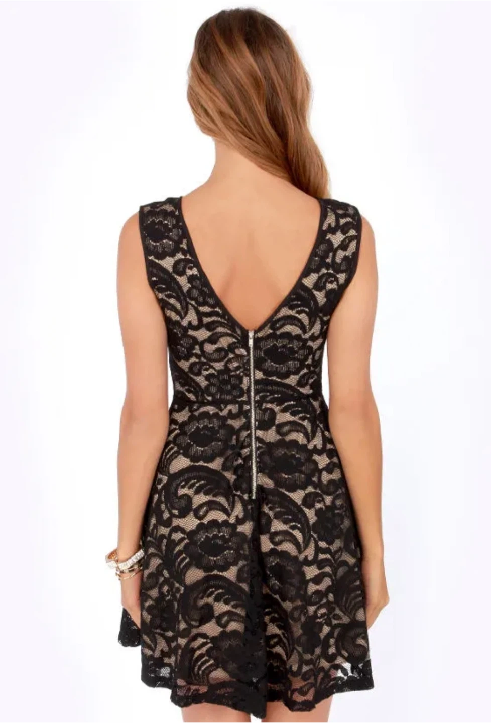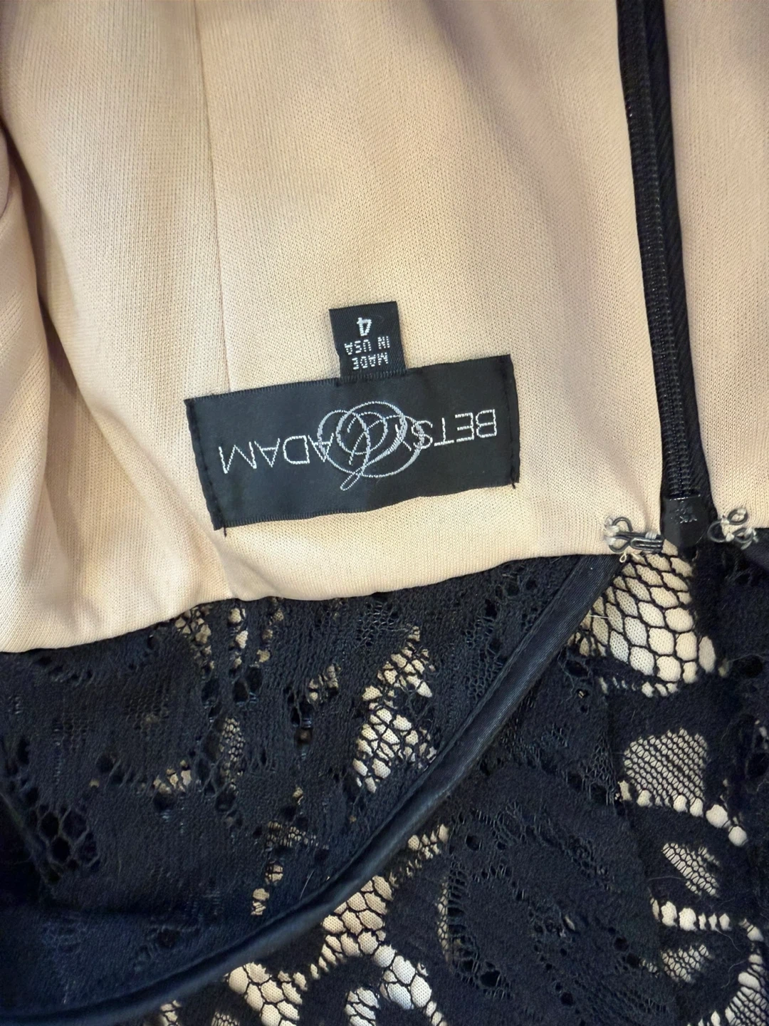This sleeveless black lace dress has a beige lining. It features a fit and flare silhouette with a zippered back, size 4.